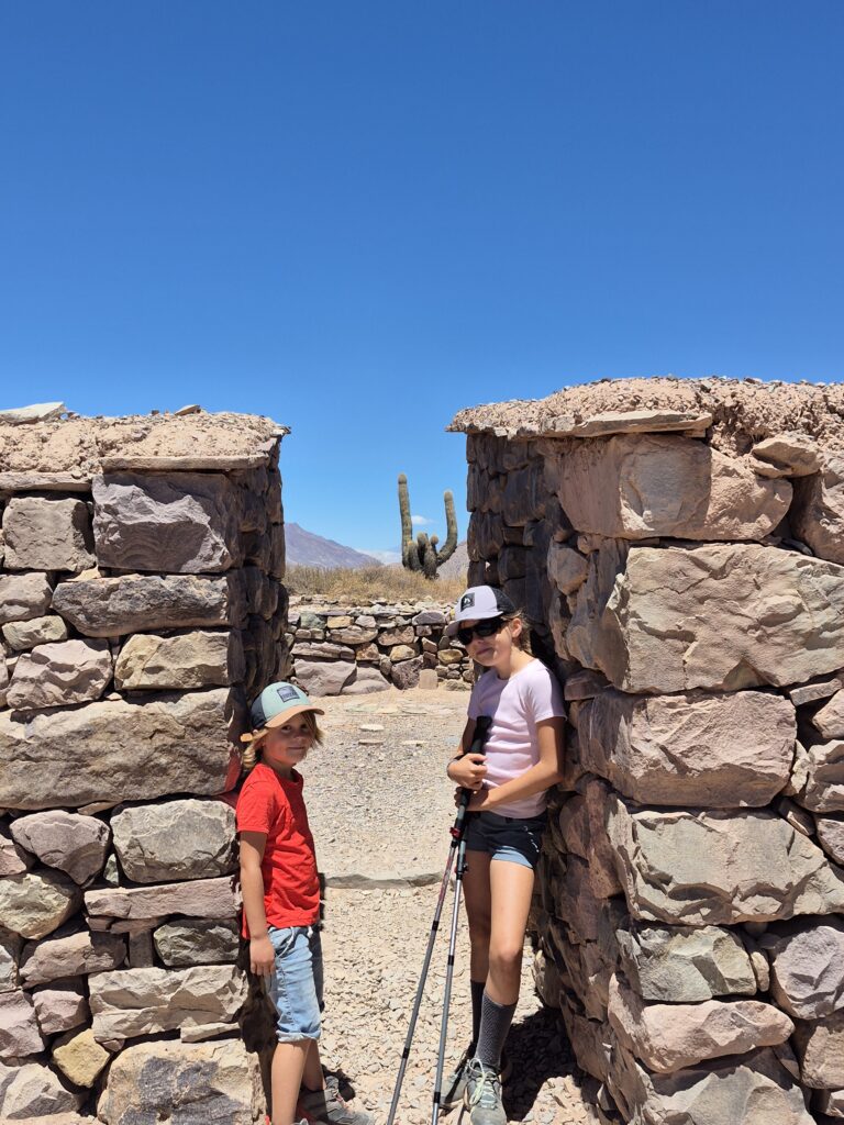 Le lendemain, nous partons pour notre première randonnée vers la Gargantua del Diablo, petite cascade pas vraiment spectaculaire mais qui permet de nous acclimater tranquillement à l’altitude et de nous familiariser avec ce terrain rocailleux et poussiéreux que nous foulerons pendant plusieurs semaines. Nous commençons par la visite de Pucarà, ruines d’un ancien village Inka en partie reconstitué. Nous découvrons la facture des constructions de l’époque, en pierre, terre et bois de cardon. Nous continuons ensuite jusqu’à la Gargantua del Diablo, à 2900 m d’altitude, à travers piste, sentier escarpé et canyon. La vue d’en haut sur la vallée et le village est magnifique, Tilcarà a des allures d’Oasis dans ce paysage sec et minéral. Je me rend compte que vue d’en haut, la ville semble verte (ce n’est pas tout à fait l’impression que cela donne quand on est à l’intérieur!). Nous redescendons en empruntant le même chemin. A la sortie du sentier, nous sommes interpellés par un homme à qui il est difficile de donner un âge. Il est assis sur une pierre et parle fort, en mâchant ses mots…et sa boule de feuille de coca! Il serre fortement la main de Sylvain, puis la mienne. Il nous demande d’où nous venons et baragouine un espagnol que nous ne comprenons pas. Son attitude n’est pas vraiment agressive mais vraiment tendue, sa poignée de main se fait insistante et peu agréable. Il saisit ensuite la main d’Agathe et ne la lâche plus. Nous ne nous sentons pas vraiment à l’aise. Il a l’air dans un état second, ni méchant, ni bienveillant. Difficile de lire sur son visage sans expression et dans ses yeux vitreux. Heureusement, un couple arrive et le jeune homme qui est de la région fait diversion en parlant à l’homme et nous fait signe de nous en aller. Nous ne nous faisons pas prier. Nous ne saurons jamais vraiment ce qu’il nous voulait, mais nous apprendrons à reconnaître cette attitude très crispée caractéristique de ces hommes qui chiquent la coca toute la journée en l’accompagnant d’alcool et que nous saurons éviter désormais. Nous finissons tranquillement la journée sur la place centrale à déambuler et à acheter quelques souvenirs.