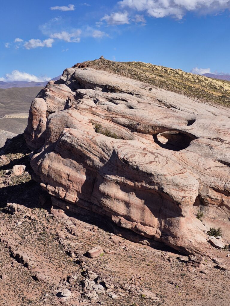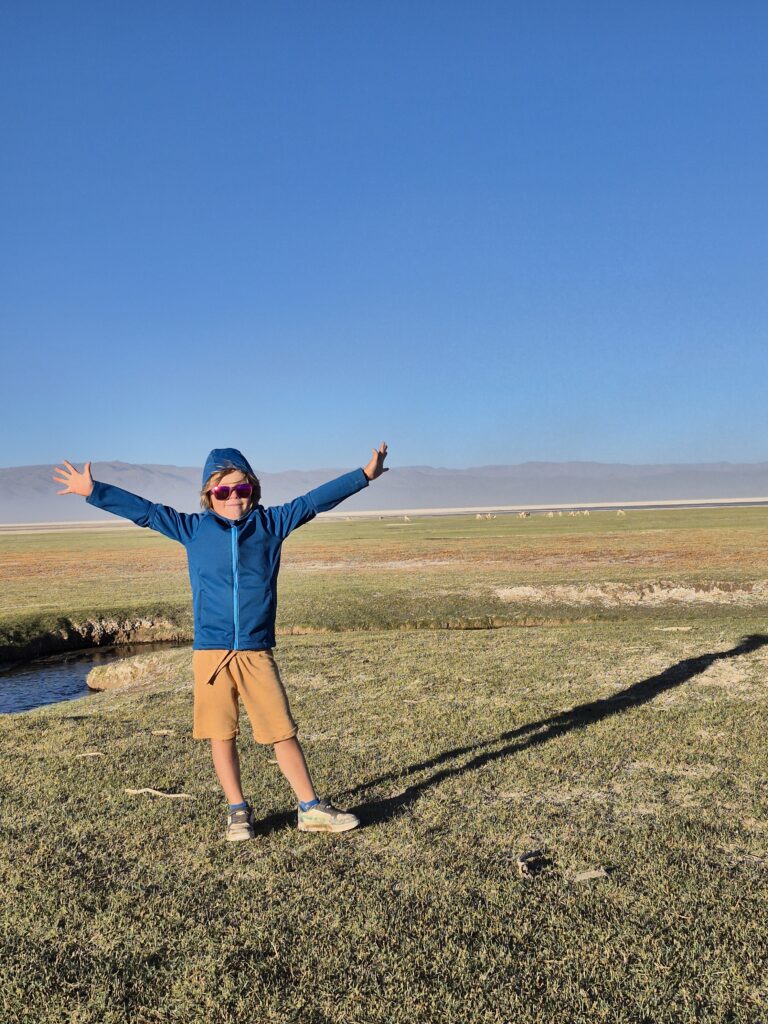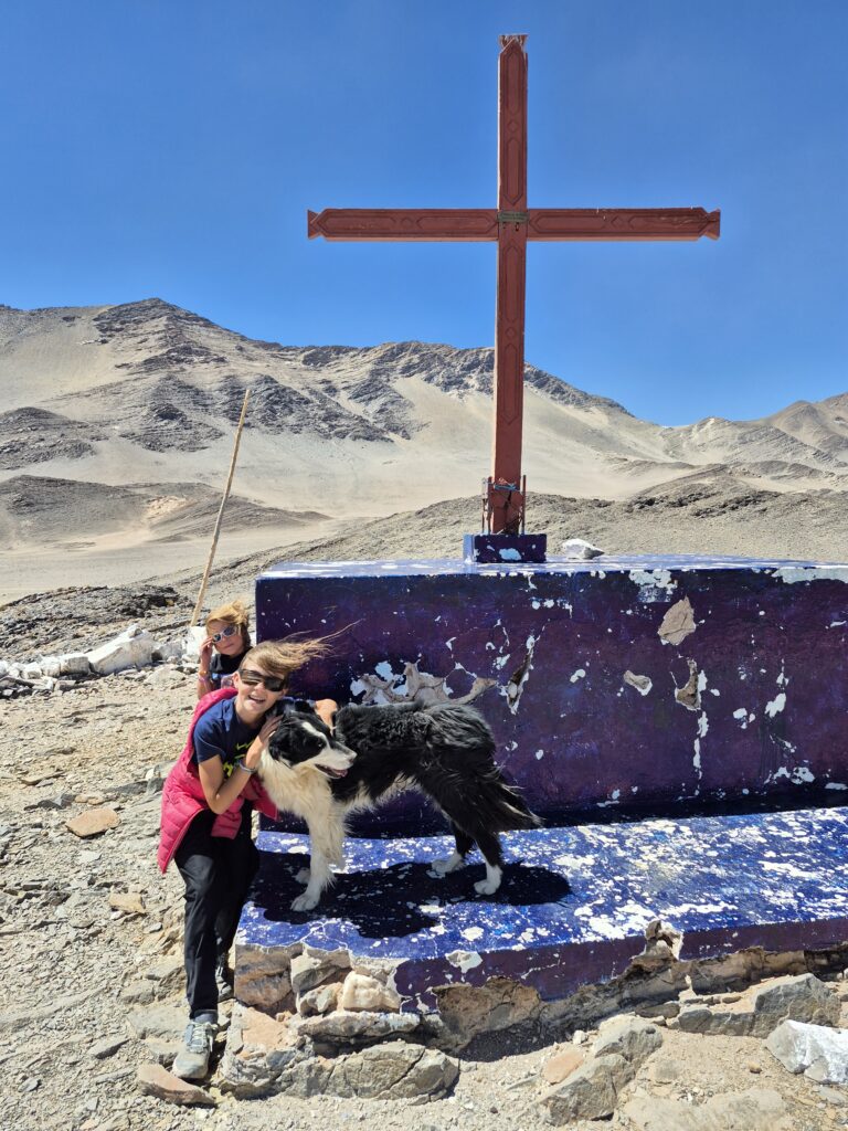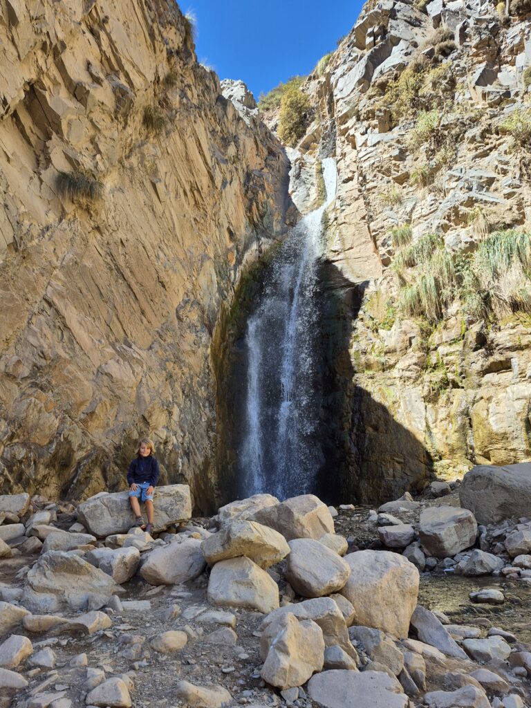Le lendemain matin, nous quittons les copains pour nous rendre sur notre dernier stop sur cette ruta 9: Tres Cruces. Nous montons à 3700 m d’altitude. Tres cruces se trouve à la frontière Bolivienne, porte d’entrée de l’altiplano par Tupiza. Nous nous arrêtons au pied du fameux Puente del Diablo qui se trouve à 4200 m d’altitude. Nous partons pour une randonnée de 13km pour rejoindre ce pont. A cette altitude et avec ce dénivelé, nous n’évoluons pas aussi vite que d’ordinaire. Il nous faudra 5h pour réaliser la boucle entière. Les dernières centaines de mètres au sommet se font doucement, les pauses sont nombreuses. C’est Gaspard qui peine le plus mais il parvient tout de même jusqu’au sommet avec grande fierté. La-haut, nous découvrons des roches plates et roses qui s’étirent vers le ciel. Nous avançons sur ces rochers plats très abrasifs en admirant la vallée de l’autre côté. Au bout d’une centaine de mètres, nous débouchons sur une sorte de cuvette pleine de sable fin. Il faut descendre en désescaladant. Une fois en bas, le voilà, la fameux pont du diable: la roche, sculptée par l’eau, forme un pont étroit entre deux promontoires rocheux. Qu’il serait tentant de le traverser!!! Mais la roche est friable et fragile, nous nous contentons de la petite photo à l’extrémité du pont et nous évitons de « tenter le diable »! Dans la cuvette de sable, parviennent à pousser on ne sait comment, quelques plantes et arbustes, bénéficiant de l’ombre et de l’eau qui stagne. La nature n’a vraiment pas fini de nous surprendre, la vie est partout, elle s’adapte, elle résiste, elle est résiliente.