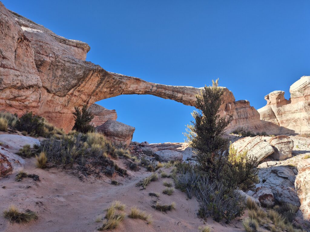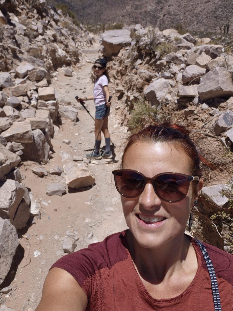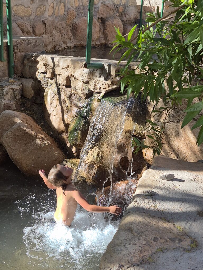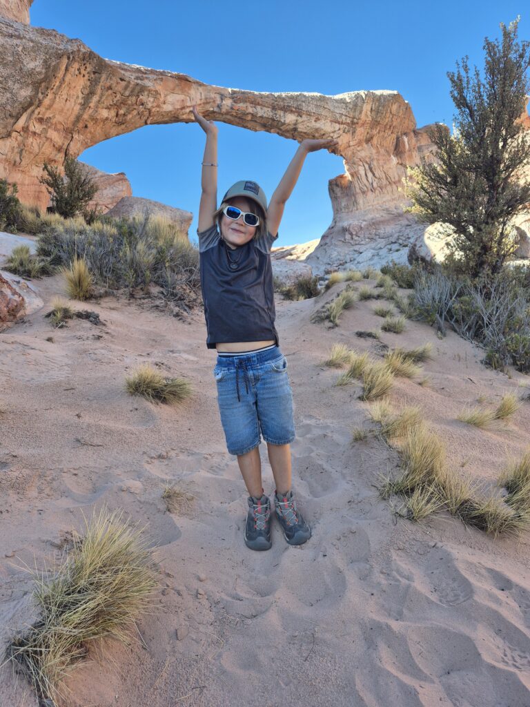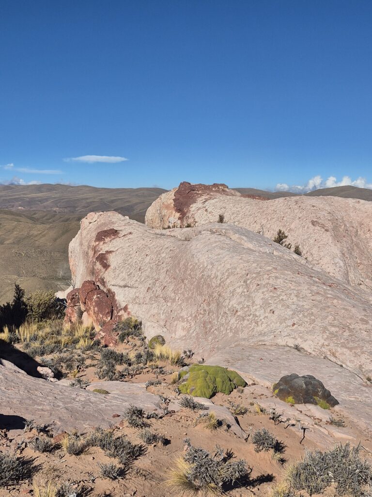 Le lendemain matin, nous quittons les copains pour nous rendre sur notre dernier stop sur cette ruta 9: Tres Cruces. Nous montons à 3700 m d’altitude. Tres cruces se trouve à la frontière Bolivienne, porte d’entrée de l’altiplano par Tupiza. Nous nous arrêtons au pied du fameux Puente del Diablo qui se trouve à 4200 m d’altitude. Nous partons pour une randonnée de 13km pour rejoindre ce pont. A cette altitude et avec ce dénivelé, nous n’évoluons pas aussi vite que d’ordinaire. Il nous faudra 5h pour réaliser la boucle entière. Les dernières centaines de mètres au sommet se font doucement, les pauses sont nombreuses. C’est Gaspard qui peine le plus mais il parvient tout de même jusqu’au sommet avec grande fierté. La-haut, nous découvrons des roches plates et roses qui s’étirent vers le ciel. Nous avançons sur ces rochers plats très abrasifs en admirant la vallée de l’autre côté. Au bout d’une centaine de mètres, nous débouchons sur une sorte de cuvette pleine de sable fin. Il faut descendre en désescaladant. Une fois en bas, le voilà, la fameux pont du diable: la roche, sculptée par l’eau, forme un pont étroit entre deux promontoires rocheux. Qu’il serait tentant de le traverser!!! Mais la roche est friable et fragile, nous nous contentons de la petite photo à l’extrémité du pont et nous évitons de « tenter le diable »! Dans la cuvette de sable, parviennent à pousser on ne sait comment, quelques plantes et arbustes, bénéficiant de l’ombre et de l’eau qui stagne. La nature n’a vraiment pas fini de nous surprendre, la vie est partout, elle s’adapte, elle résiste, elle est résiliente.
