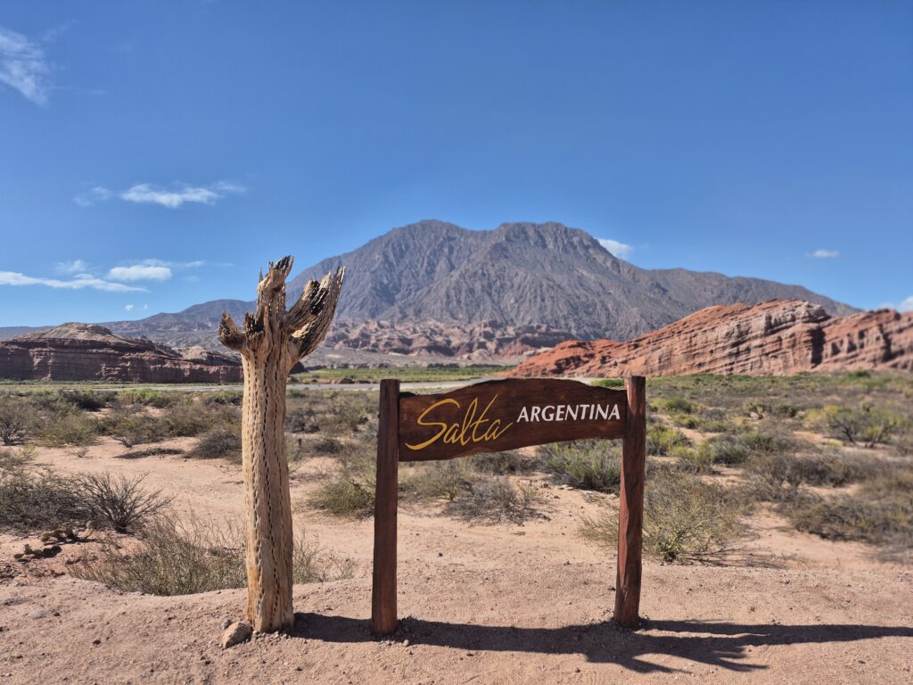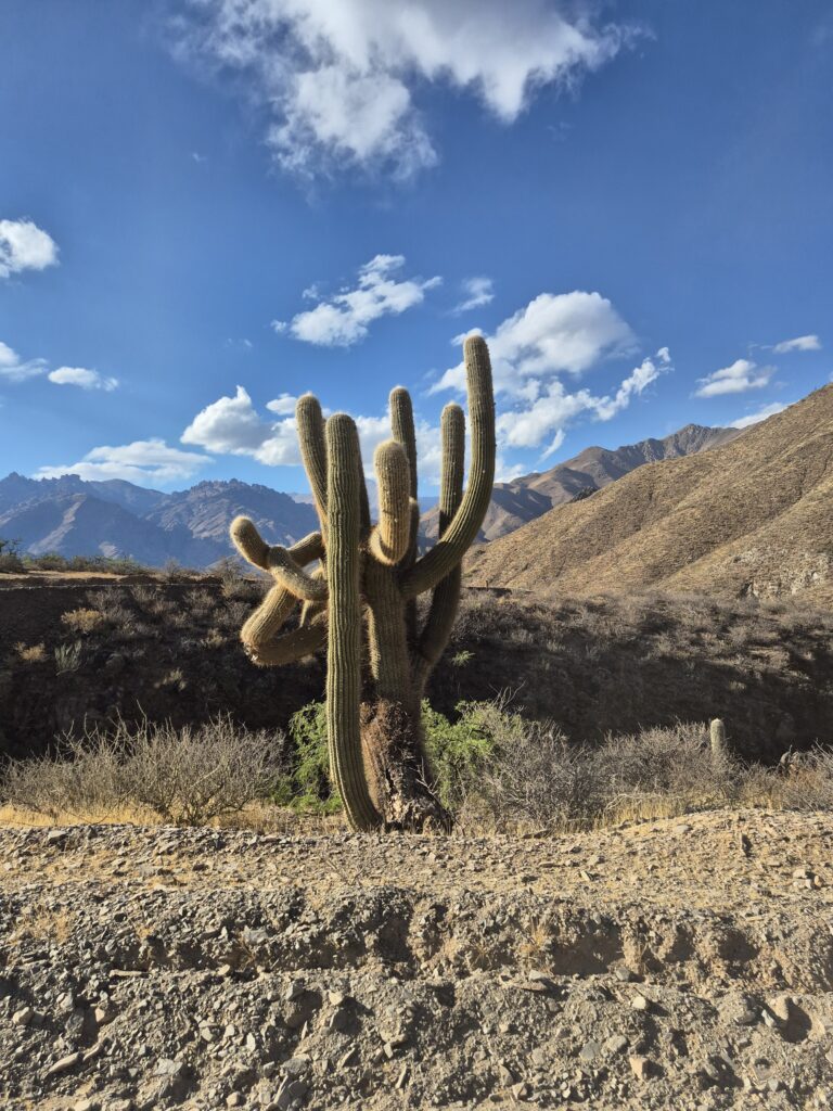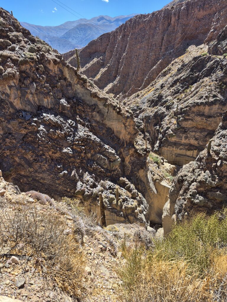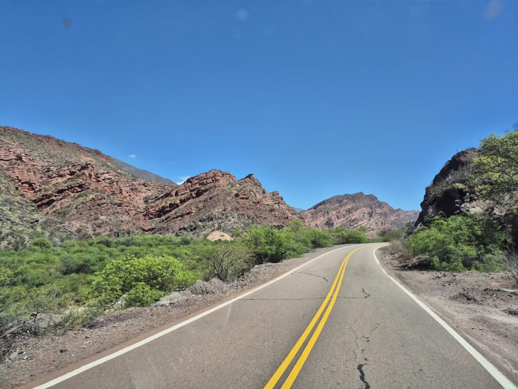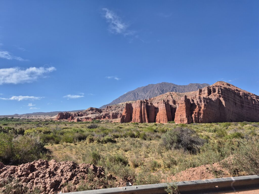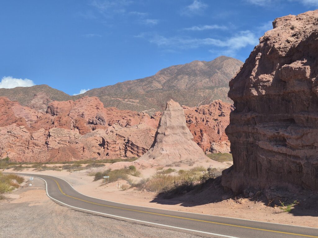 Après un séjour de près d’une semaine à Salta, nous reprenons la route en direction de Cafayate. Nous empruntons la Ruta 68, superbe route panoramique et asphaltée (cela fait tout de même du bien après les centaines de km de piste de la Puna!). La route part des collines verdoyantes de Salta pour monter progressivement vers Cafayate, petite oasis andine touristique qui bénéficie d’un climat chaud et sec, d’une irrigation naturelle et d’un sol très minéralisé, cocktail favorable à la culture du raisin et à la réalisation de vin. Nous traversons des vallées en suivant les cours d’eau, puis, progressivement, la végétation se raréfie et laisse place aux épineux, aux cactus de tout genre et à un paysage plus minéral, tantôt jaune, tantôt gris, tantôt rouge. Nous nous arrêtons quelques fois pour profiter de quelques points de vue et de spots remarquables. Les formations rocheuses sont belles et différentes de celles du Nord, mais bien moins impressionnantes, nous ne nous attardons pas longtemps.
