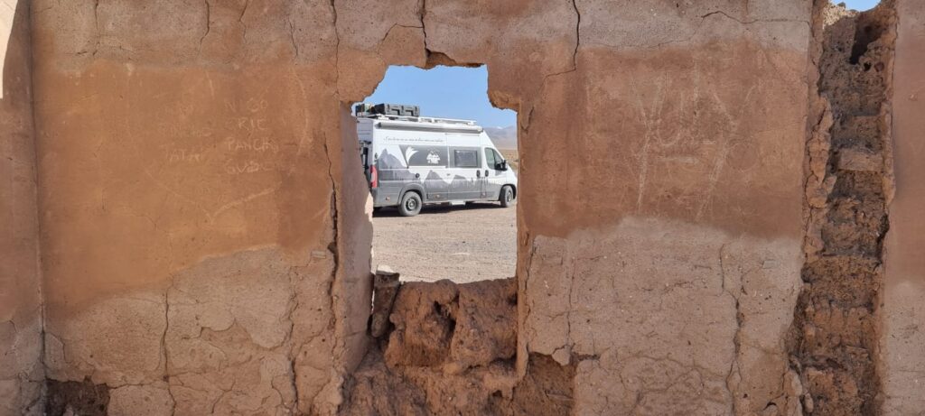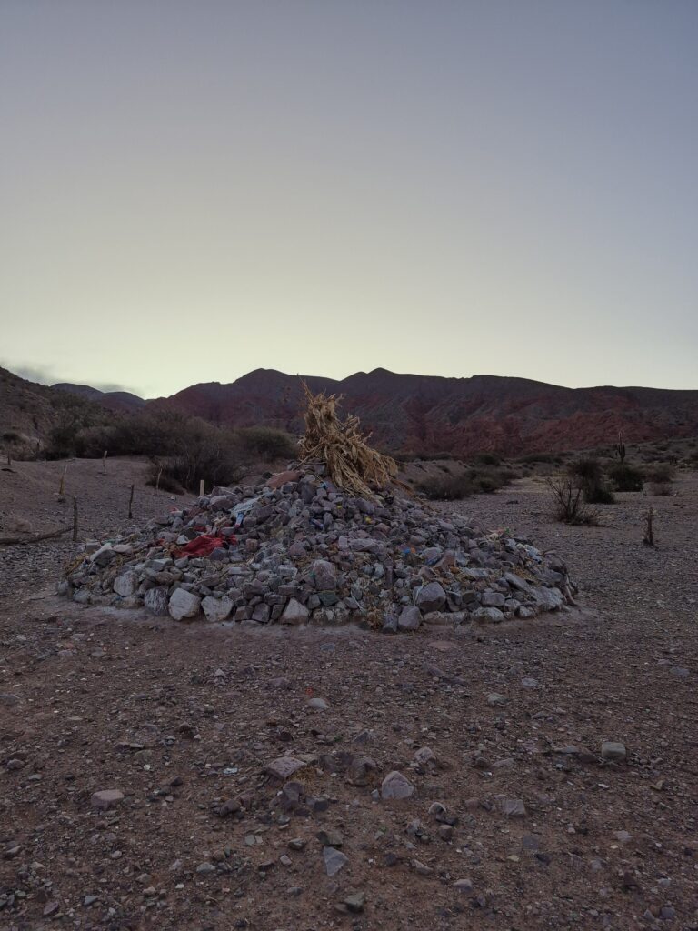 Le soir-même, nous continuons vers Uquia, petite bourgade suivante à une demi-heure de Tilcara. Nous continuons notre acclimatation en dormant à 2900 m d’altitude. Nous trouvons un spot sur I-Overlander, non loin de l’entrée de la Quebrada de las Senoritas que nous visiterons le lendemain. Près du camion, se trouve une sorte de construction ronde, faite de cailloux de toutes formes et regorgeant d’offrandes à la Pachamama. La nuit est silencieuse mais je dors mal, mon sommeil est entrecoupés et je fais pas mal de cauchemars, ce qui est vraiment très rare pour moi. Agathe parlera aussi beaucoup dans la nuit, Gaspard nous rejoindra dans notre lit suite à un cauchemar.