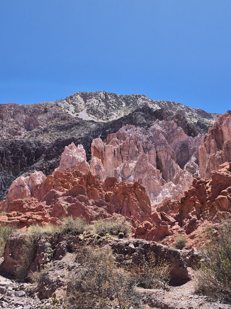 Malgré l’état de la piste, cette route est vraiment une des plus belles routes d’Argentine! La Quebrada de Las Flechas, forêt de roches acérées pointant vers le ciel, est vraiment impressionante, très différente de tout ce que nous avons vu jusqu’ici. On se sent tout petits au milieu de toutes ces flèches de pierre pointant vers le ciel! La route se poursuit entre canyons rocheux et vallées fertiles parcourues par le Rio Calchaqui qui offre à cette région de bonnes conditions de culture et des oasis de verdure au creux de ces monuments minéraux. J’aime beaucoup l’alliance du minéral avec la verdure des oasis. Cela crée du contraste et amène de la vie dans cet océan de pierre. Je me rends compte que je suis vraiment attachée à la verdure et que je ne pourrais pas vivre dans un endroit sans plantes. Même si j’aime beaucoup les pierres, en bijoux comme en escalade, les ambiances totalement minérales me semblent sèches et hostiles, aussi impressionnantes que morbides, comme si l’Homme n’était pas le bienvenu parmi ces géants de pierre, ou alors seulement en tant que photographe, le temps d’une visite furtive.