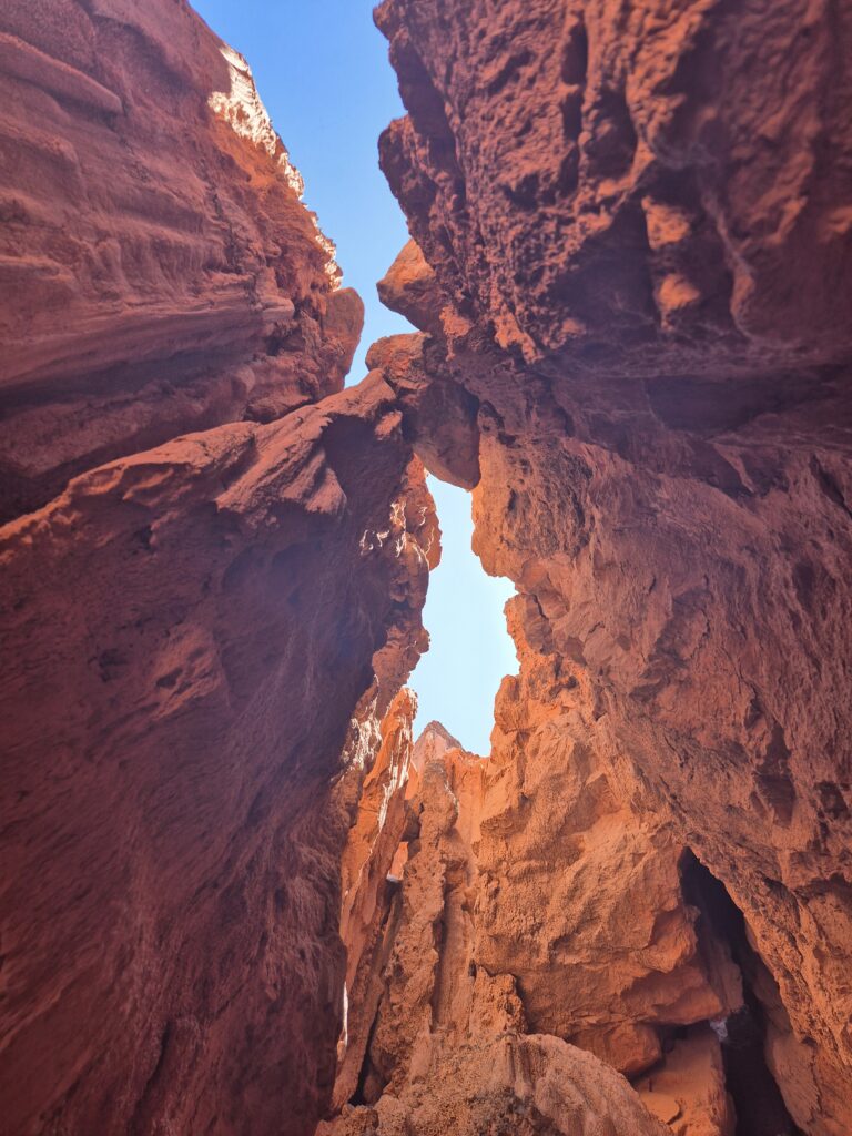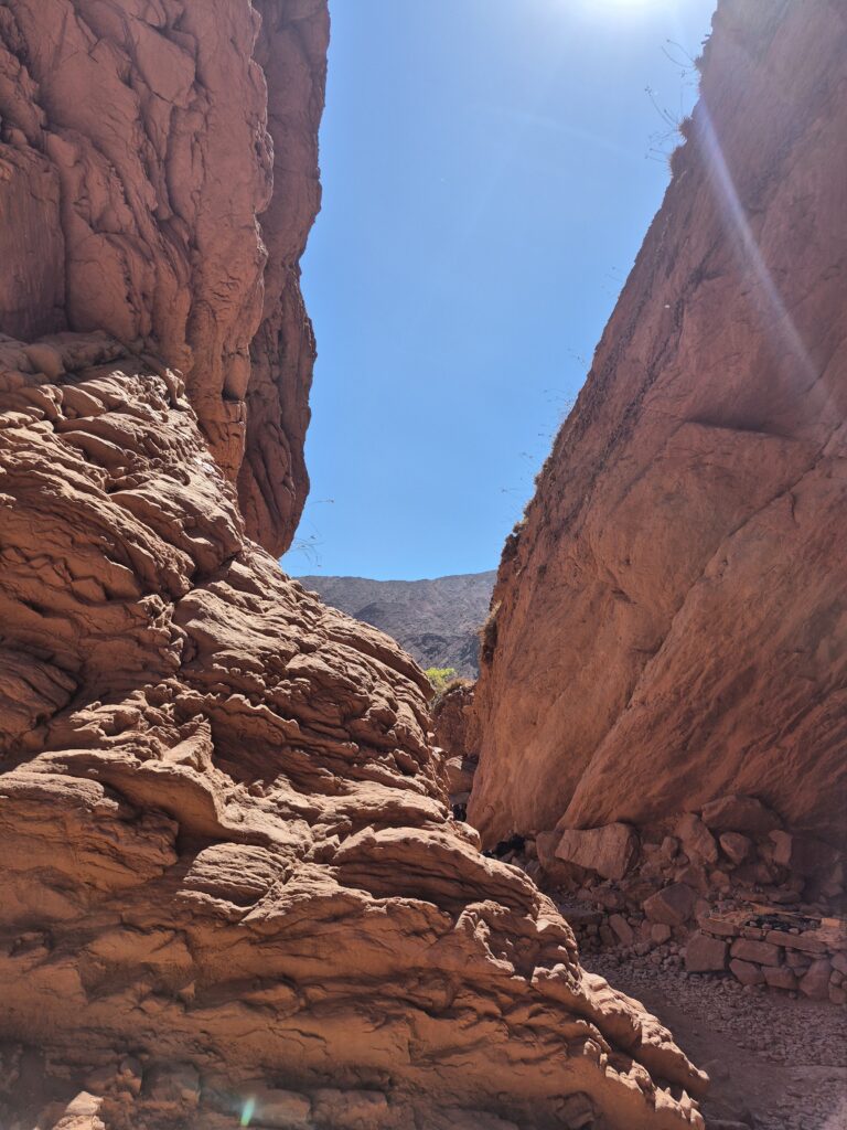 Le matin, nous partons visiter la magnifique Quebrada de Las Senoritas, un canyon rougeoyant qui est traversé en saison des pluies par des torrents éphémères qui guident l’eau du sommet des montagnes jusqu’aux rios dans la Vallée. La visite se fait obligatoirement avec un guide. Celui-ci nous explique que la grande amplitude thermique entre le jour et la nuit est responsable de nombreuses fractures dans la roche, exposant les minéraux à l’air et à l’oxydation, d’où la teinte si particulière des montagnes. Ici c’est le rouge et le rose qui l’emportent. Le soleil pénétrant dans les étroits couloirs du canyon donne une couleur toute particulière à la roche et une lumière changeante au détour de chaque virage. Un régal pour les yeux!