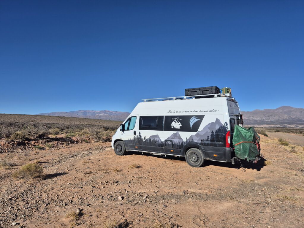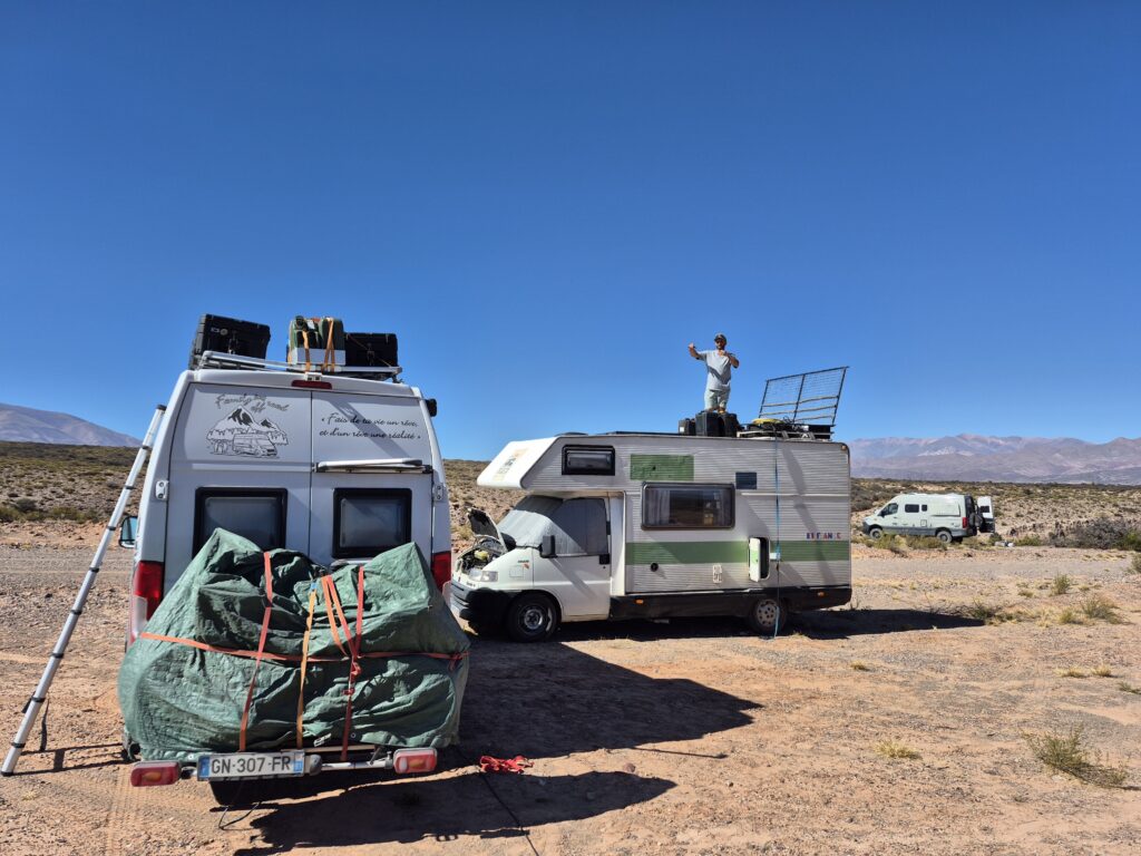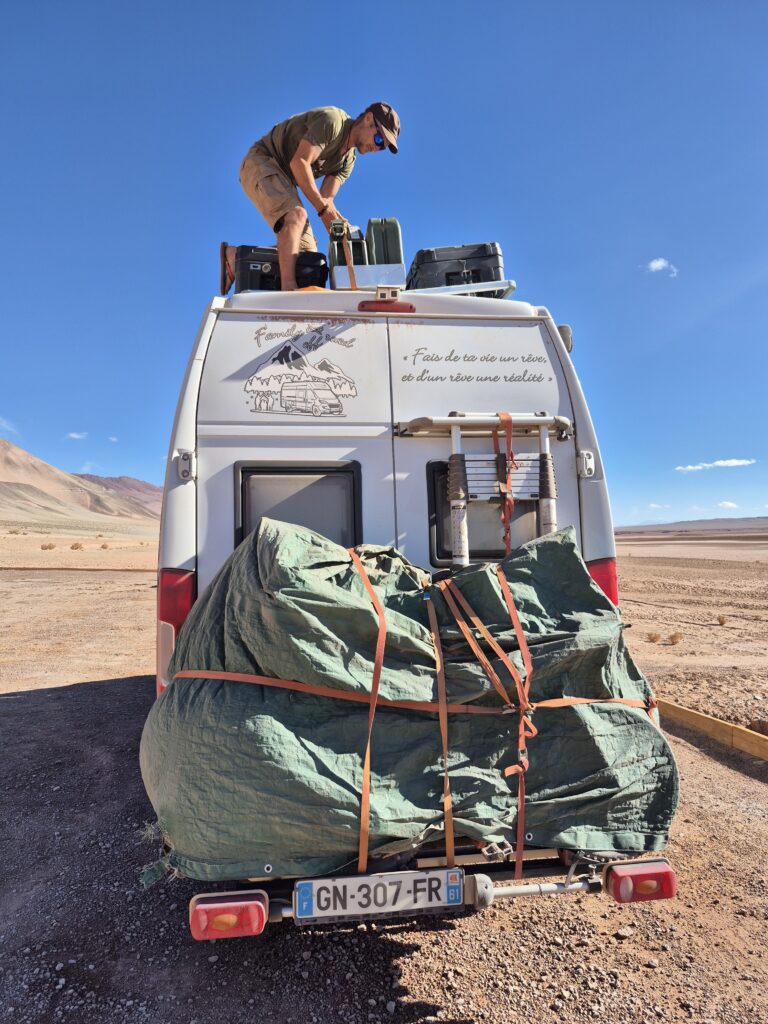 Après cette longue journée de route et toutes les images emmagasinées dans mon téléphone et dans notre tête, nous nous rendons compte que les pistes ont eu raison de notre galerie de toit qui a perdu une patte de fixation dans la bataille. Elle avait déjà commencé à plier au centre depuis plusieurs semaines, mais là; elle ne tient plus que sur un point à l’arrière et manque de se briser. Sylvain fabrique une réparation de fortune avec nos cales afin de ne pas empirer le problème jusqu’à notre arrivée à Salta pour réparer.