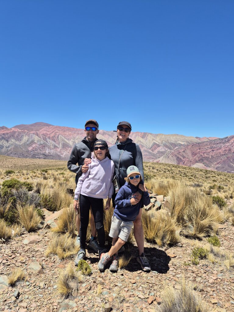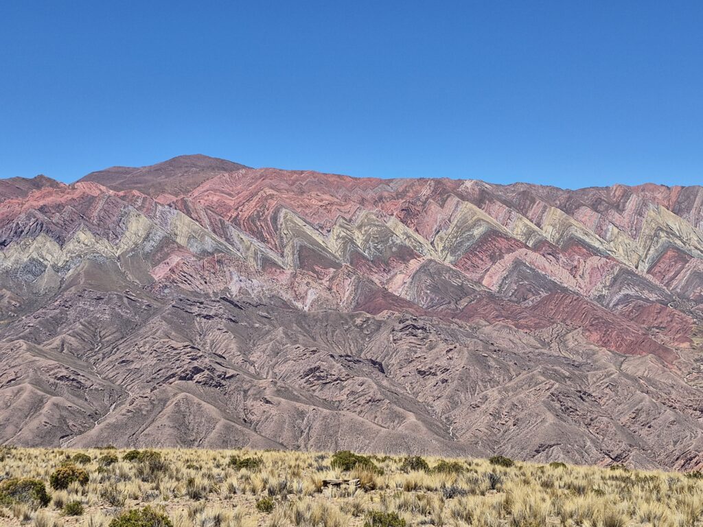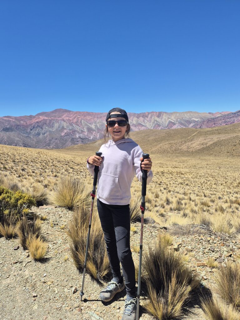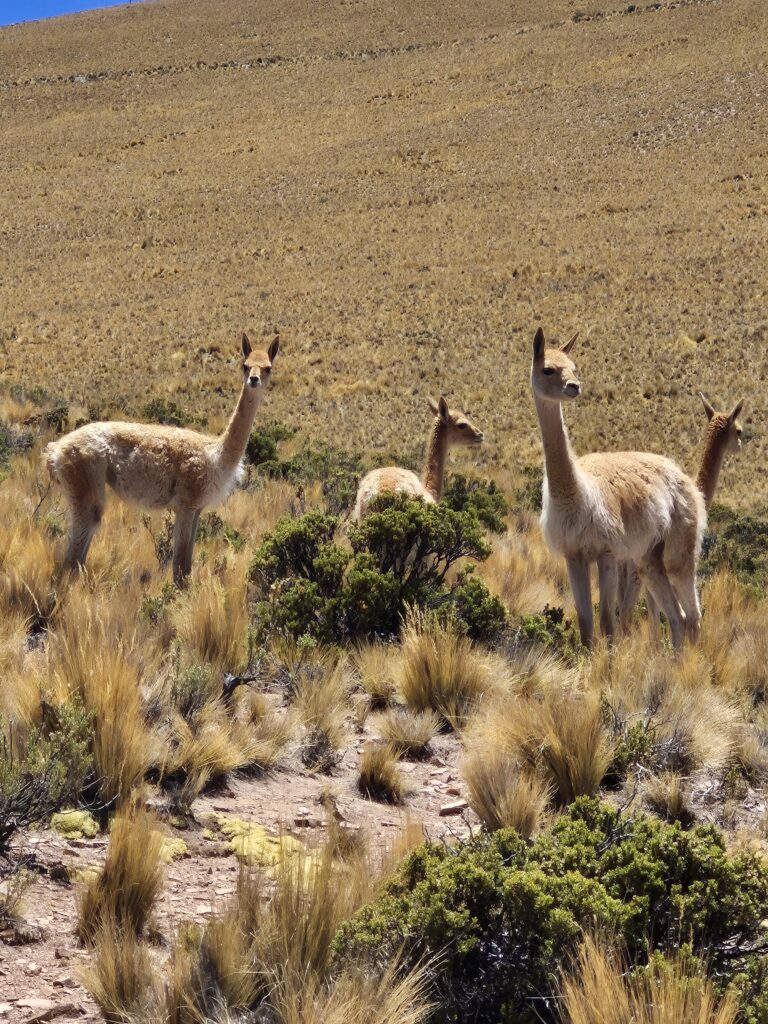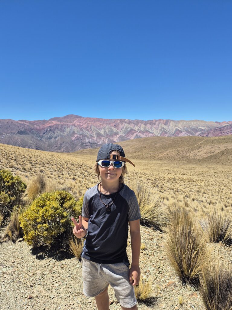 Le lendemain matin, nous montons à 4350m d’altitude pour observer la fameuse Hornocal, surnommée « la montagne aux 14 couleurs ». La route est spectaculaire, un enchaînement de virages donnant vue sur sur la vallée et les montagnes environnantes. Après une bonne trentaine de minutes, la voilà, la fameuse montagne colorée! La roche semble avoir été découpée en tranches triangulaires, le sommet acéré pointant vers le ciel. Les différentes couches sédimentaires se sont succédées au cours des aires géologique et l’oxydation a fait le reste du travail. Un mille-feuille de roches jaunes, roses, violettes, grises, bleues, vertes…magnifique! Nous randonnons sur le sentier qui mène vers d’autres points de vue sur cette montagne. Nous observons nos première vigognes qui déambulent gracieusement entre les touffes d’herbes jaune et les petits cactus. Notre pas est légèrement plus lent que d’habitude, l’altitude commence à se faire sentir au bout de deux heures de balade. Malgré le thé à la coca du matin et les bonbons à la coca, je commence à ressentir les effets de l’altitude. Le mal de tête commence, j’ai du mal à trouver l’énergie pour répondre aux questions de Gaspard. Sylvain, Didier et Sandrine s’engagent vers le dernier sentier pour accéder au mirador mais le dénivelé pour remonter me semble insurmontable à ce moment-là. Je décide de rester avec les enfants sur le parking. Malgré l’agua de Florida que j’applique sur mes tempes, mon front et ma nuque, le mal de tête ne se calme pas vraiment. Ce n’est pas intense mais j’ai l’impression d’être dans le brouillard. Une fois Sylvain revenu, nous redescendons pour déjeuner à une altitude plus acceptable. Le mal de tête s’intensifie en redescendant et me fatigue. Cela se passera assez rapidement une fois posés.