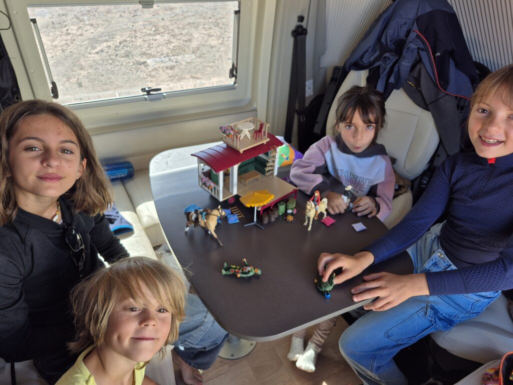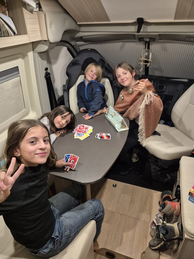 Jour 4: Le lendemain matin, le temps a bien changé. Impossible de déjeuner dehors tous ensemble! Julie nous livre ses bons pancakes (vraiment adorable!!!) et chacun prend son déjeuner chez soi. Nous prenons tout de même une bonne heure ensuite pour envoyer tous les enfants jouer dans le camping-car et nous prendre une tisane entre adultes dans le camion au calme…bonheur!!! Nous nous quittons ensuite pour plusieurs semaines ou plusieurs mois en nous promettant de nous retrouver sur la route!