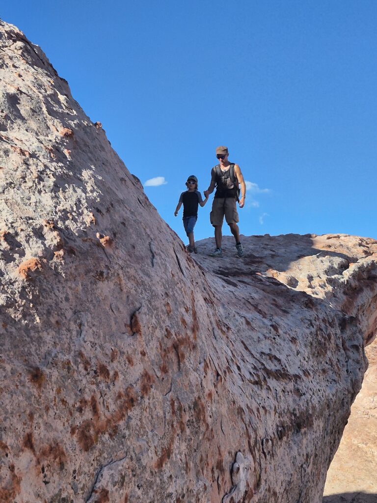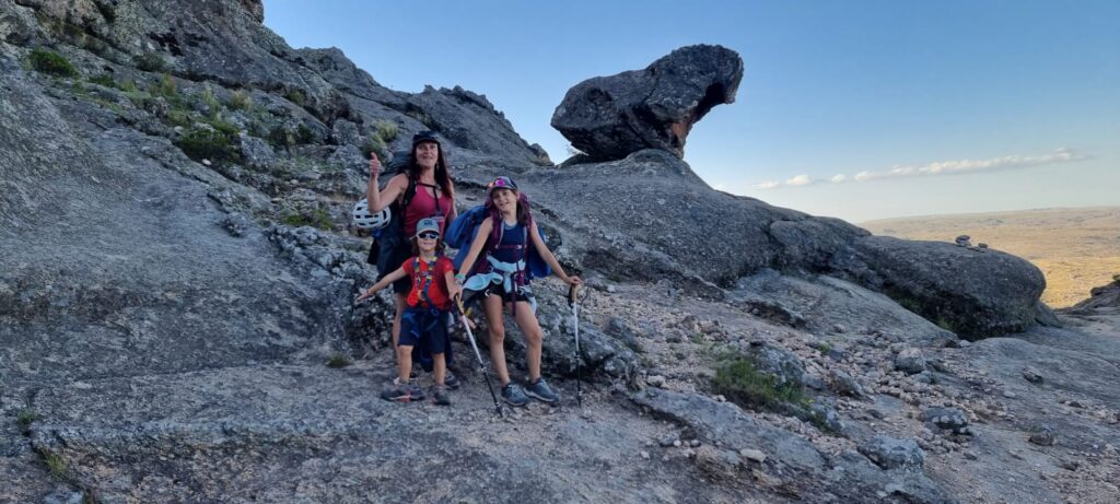 Le lendemain matin, nous partons en randonnée tous ensemble en direction du site d’escalade. Une belle montée exigeante mais assez courte nous mène vers le haut de la montagne, où des dizaines d’immenses rochers rouges semblent avoir été déposés dans un désordre total. Certains tiennent en équilibre sur d’autres, créant des ponts des tunnels ou des grottes. les enfants trouvent ce lieu paradisiaque! Non pas pour la vue splendide sur la lagune mais pour les cavernes et abris qu’ils investissent en 10 minutes et transforment en un hôtel avec cuisine, chambres, accueil, bar, etc! Le repérage des voies n’est pas évident sur un site pareil. Les secteurs sont difficiles à identifier et leur approche reste exigeante. Pas de sentier balisé, parfois un peu d’escalade de rocher en rocher sans aucun assurage…il nous faut une bonne heure avant de trouver un des secteurs équipés et correspondant à notre niveau. Le temps a passé vite, nous pique-niquons ici et grimpons un peu. La journée est très chaude, les réserves en eau s’amenuisent alors nous décidons de ne pas chercher un nouveau secteur (ce qui nous prendra encore pas mal de temps) mais de rentrer aux camions. Nous passerons une dernière soirée tous les 8 dans ce lieu magique à discuter et observer les étoiles.
