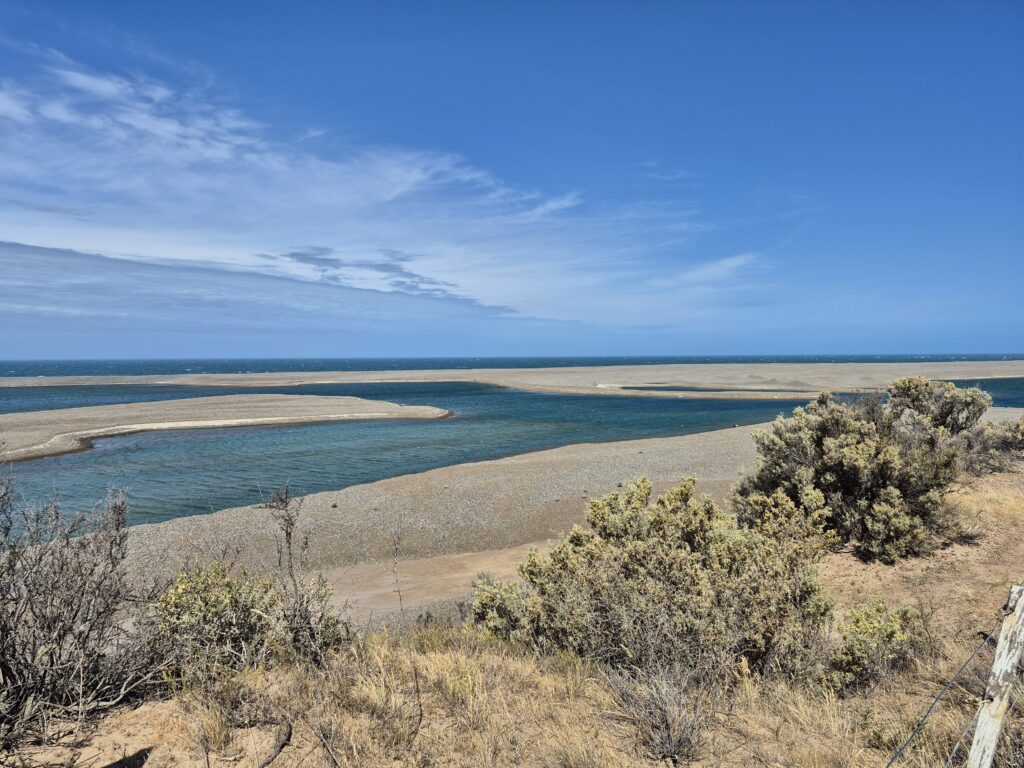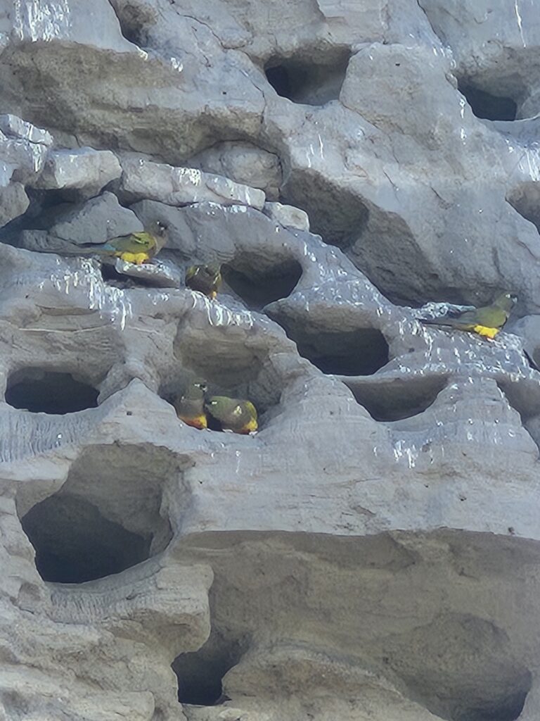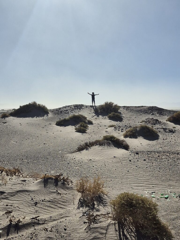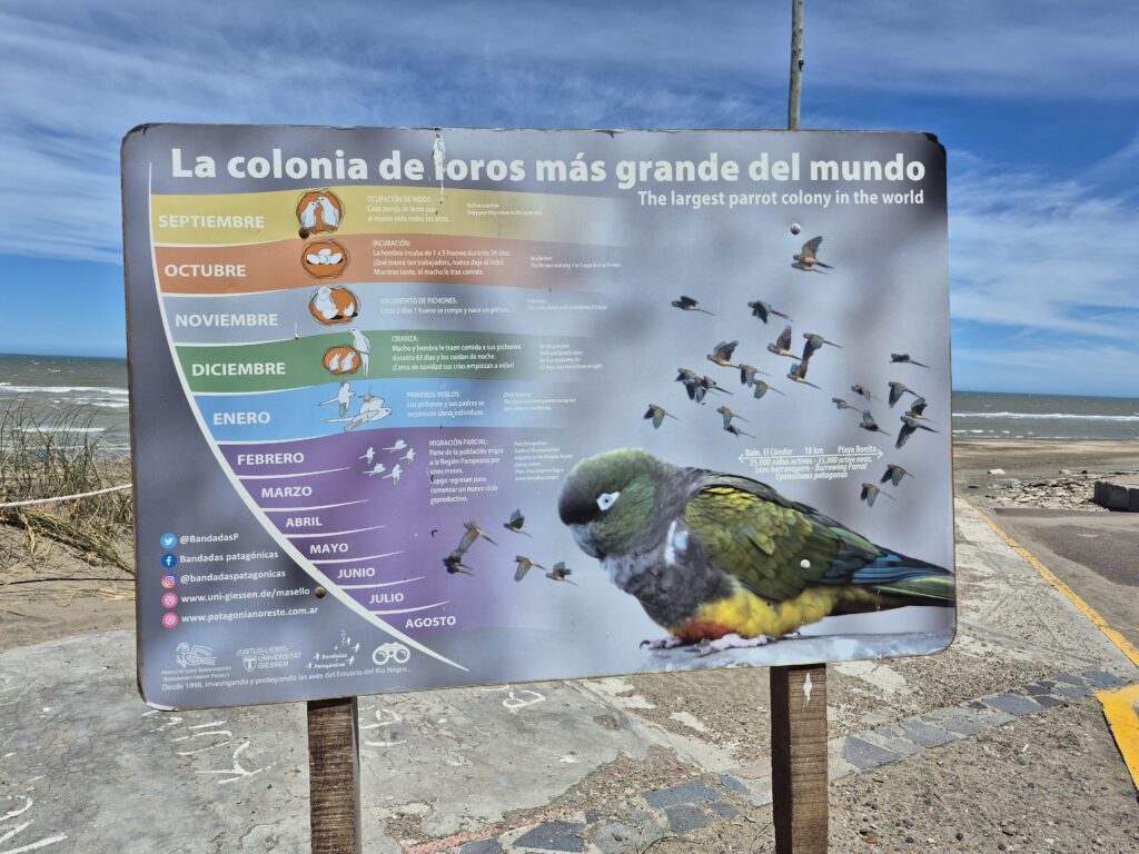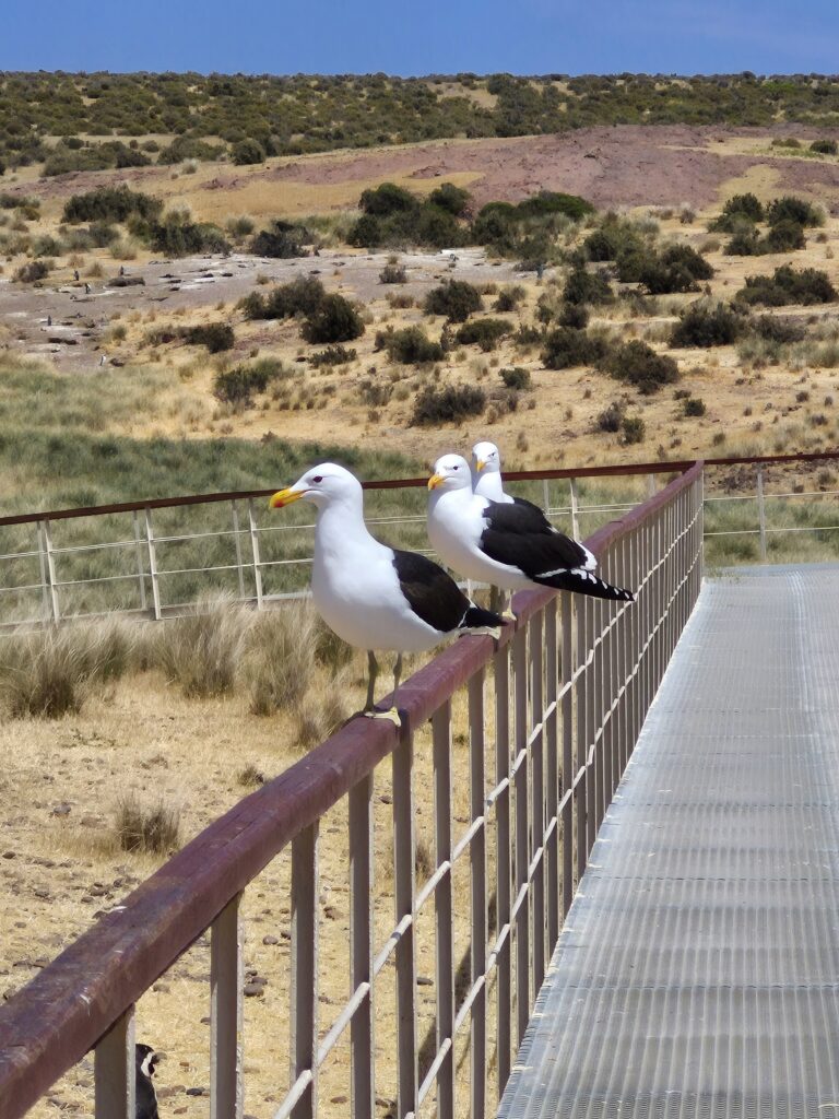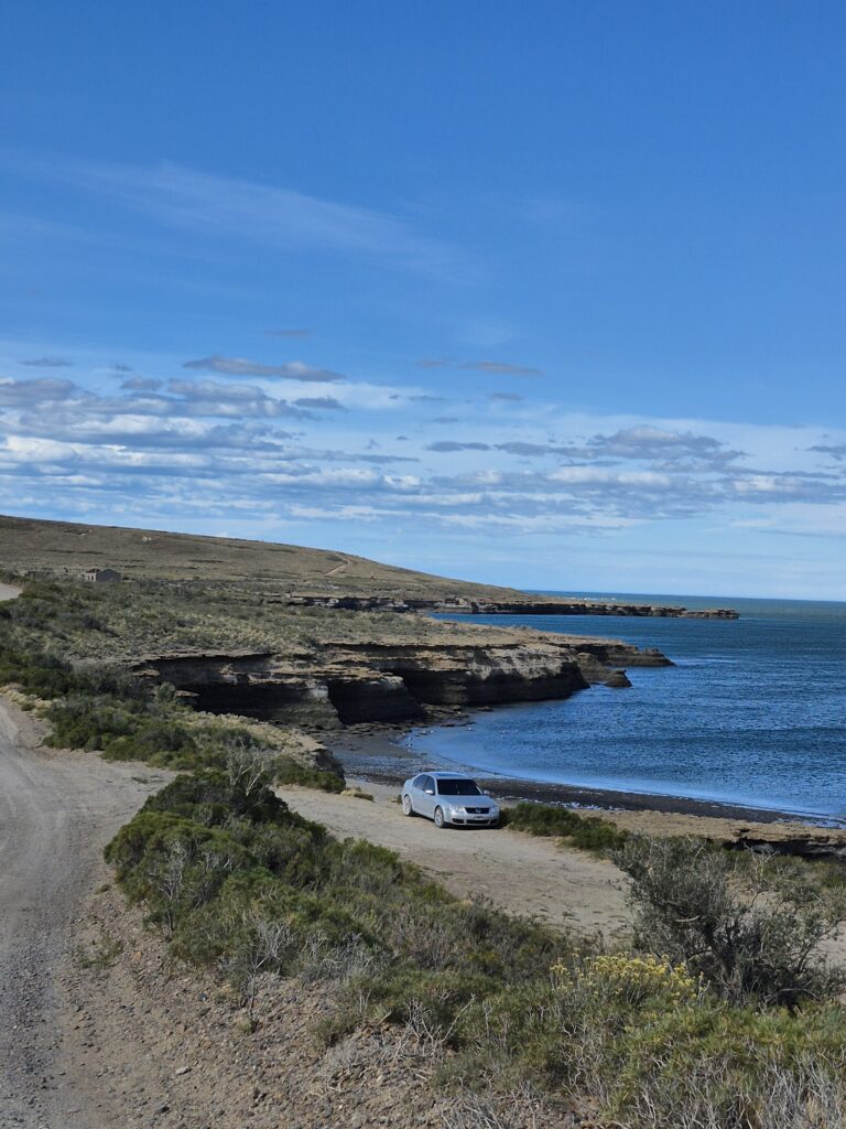 Jour 1: A partir de Bahia Blanca, nous rejoignons la côte Atlantique et la fameuse Ruta 3 qu’on ne quittera (presque) pas jusqu’à Ushuaia. Nous n’avions pas vu l’Océan depuis le Brésil, cela fait pile deux mois. C’est donc avec un grand plaisir que nous faisons notre premier arrêt sur la plage du petit village balnéaire de El Condor. L’envie de se baigner les pieds est irrésistible pour Gaspard mais l’eau est fraîche et le vent assez fort ce jour-là. Nous optons donc pour une partie de ballon sur le sable. Nous passons une excellente nuit sur la plage, à l’abri des dunes. Quel plaisir de se réveiller les pieds dans le sable avec un grand soleil! Les enfants jouent, on déjeune, porte ouverte, en regardant l’océan… La mer donne envie de ralentir, de contempler, de profiter en laissant le temps filer… Nous prenons le temps d’aller courir, à tour de rôle, pour profiter encore de cette longue plage de sable fin et de l’air doux de cette belle matinée. Avant de quitter le village, nous nous arrêtons face aux falaises qui abritent des centaines de milliers de perroquets Loros à cette saison. Les creux façonnés par les embruns et le vent sont des abris de prédilection pour ces couples qui viennent ici se reproduire et élever leurs bébés. Ils repartirons dans quelques mois pour migrer vers une région plus chaude le temps d’un hiver avant de revenir l’année prochaine. Saviez-vous que les perroquets vivent en couple avec le même partenaire toute leur vie? Lorsque l’on s’approche de la falaise, un véritable vacarme se fait entendre. Les perroquets ne font pas dans la discrétion! Nous observons le joyeux ballet de ces oiseaux qui sortent des nids et reviennent avec la nourriture pour les petits. Puis nous reprenons la route vers notre deuxième destination.