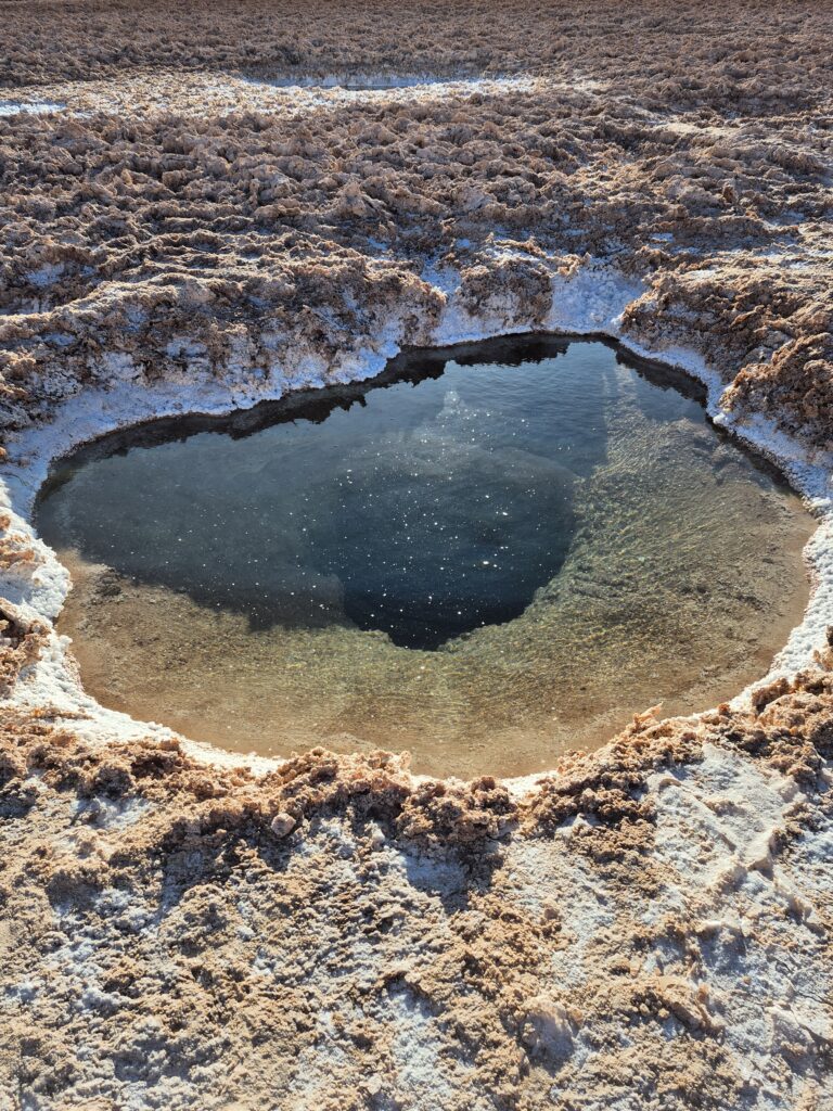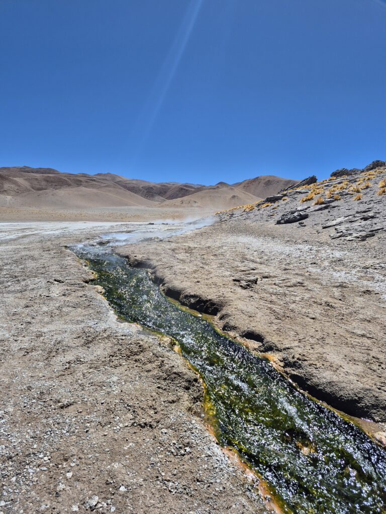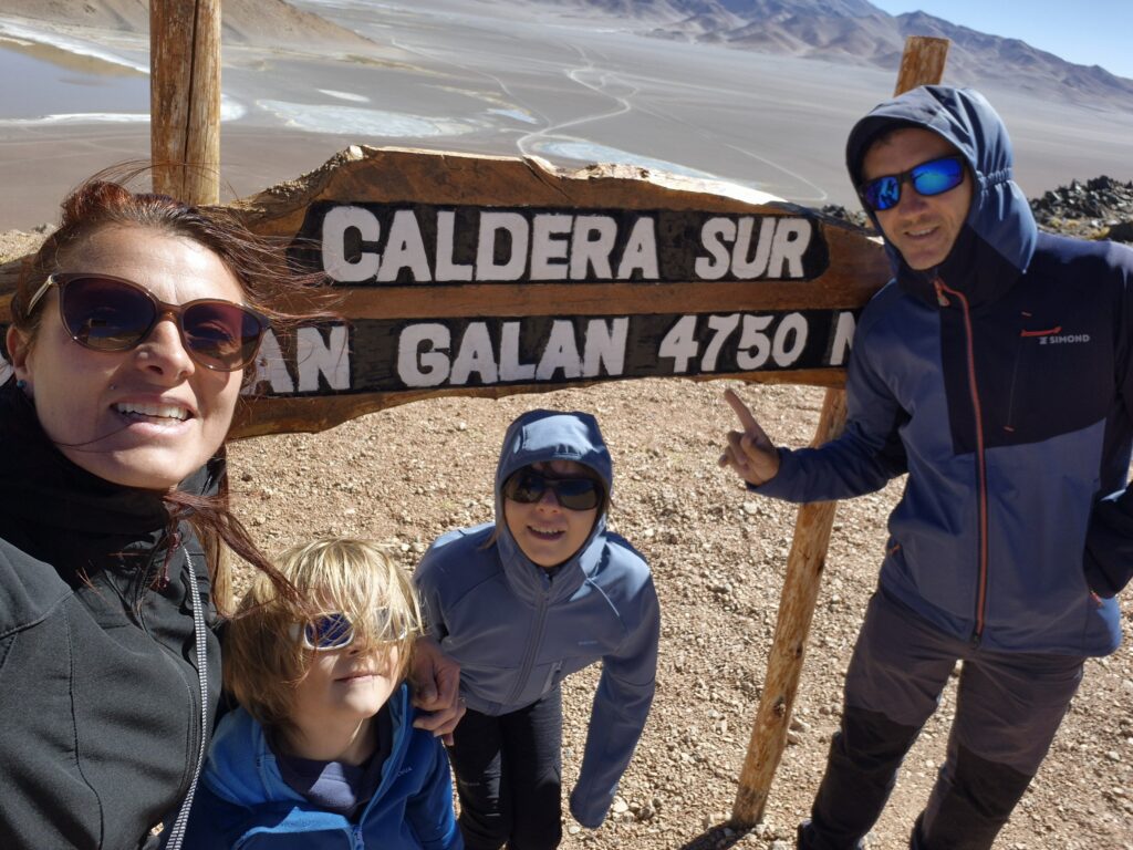 Le soir, nous nous installons chez le guide qui nous a contacté pour réaliser le tour au Volcan Galan et à Piedra Pomez. Il nous propose de nous garer chez lui et de profiter du WiFi de sa maison. Le lendemain matin, nous partons très tôt (7h30) pour visiter le Volcan Galan. Il s’agit du plus grand cratère du monde (45 km de diamètre) qui a été identifié comme cratère il y a peu. Les anciens savaient qu’il y avait des volcans autour mais c’est quand les images satellites sont arrivées qu’on a pu identifier qu’il s’agissait d’un seul et même cratère. Le tour dure environ 6h. Il faut à peu près 2h pour atteindre le haut du cratère depuis El Penon. Nous passons par la Laguna Grande où nous pouvons observer les flamants roses tous réunis et serrés les uns contre les autres pour se protéger du froid matinal. Puis, nous traversons un dédale de colonnes rocheuses aux formes étranges qui semblent presque sculptées par le vent. Ce sont des cheminées de lave qui étaient autrefois entourées de montagnes que l’érosion a fait disparaître. Ne restent aujourd’hui que ces cheminées dont la roche est plus dure et moins sensible à l’érosion. Nous nous amusons à trouver des formes humaines et animales dans ces colonnes. Puis nous continuons vers l’entrée du cratère. Les lumières et les couleurs sont fantastiques et changent au fur et à mesure que le soleil monte dans le ciel. Nous arrivons à l’entrée du cratère qui culmine à 4790 mètres d’altitude! La vue sur la Laguna Diamante est splendide! Une lagune d’un bleu turquoise étincelant, entourée de blanc et de vert fluo, avec, par endroit, des auréoles rosées, dues aux différentes bactéries présentes dans l’eau. Le guide nous explique que la couleur des flamants roses peut être différente en fonction de la lagune dans laquelle ils se trouvent. Ce sont des bactéries qui donnent la couleur à la lagune où elles se trouvent et selon le type de bactéries qu’ils consomment, leur couleur est différente. Ces bactéries sont les mêmes que celles qui ont donné la vie sur terre il y a des millions d’années. Nous continuons à l’intérieur du cratère vers les geysers. Ici, l’eau sort de terre à 86 degrés. Nous sortons de la voiture et nous approchons de la vapeur qui s’échappe du sol. L’ambiance est étonnamment chaude et humide, cela contraste fortement avec cette journée froide, venteuse et sèche. Nous continuons un peu plus loin, là où l’eau refroidit peu à peu. Ici commencent à réapparaître des colorations dues à des bactéries qui supportent cette chaleur. A 86°C, aucune bactérie ne subsiste. A 70°C, l’eau commence à prendre une couleur orangée, à 55°C, une couleur verte. Nous ne résistons pas à toucher cette eau chaude, merveille de la nature en plein désert d’altitude! Nous amorçons ensuite le chemin du retour en observant avec émerveillement le paysage grandiose qui nous entoure et qui est déjà bien différent de celui que nous avons vu ce matin. A chaque heure du jour, la lumière différente donne à voir un nouveau spectacle. Depuis que nous voyageons c’est la lumière de fin d’après-midi que je préfère, elle sublime tout, comme un dernier coup de projecteur pour sublimer le final avant l’extinction des feux.