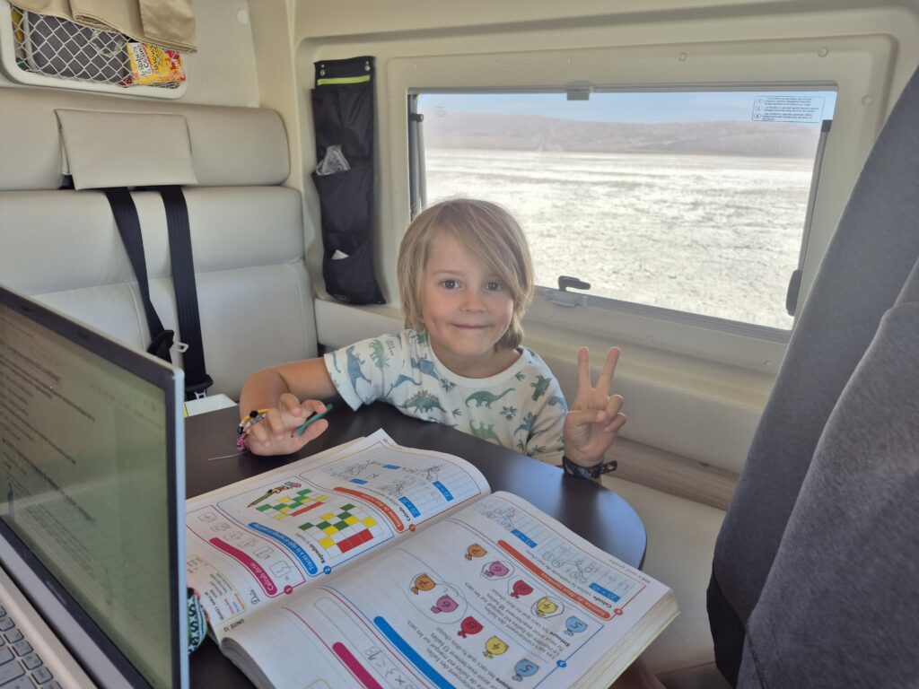 Sur la route, les enfants en profitent pour avance dans leur programme scolaire. Nous nous arrêtons également à Pocitos pour récupérer un peu de bois dans les tas de déchets qui servira à réparer la galerie.