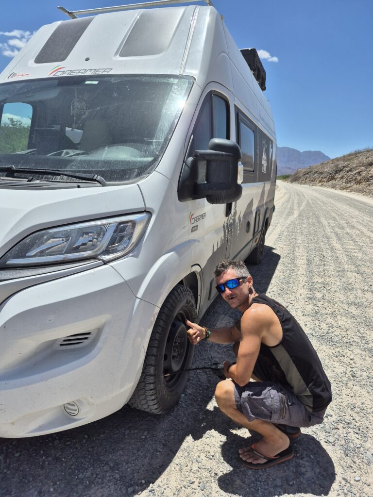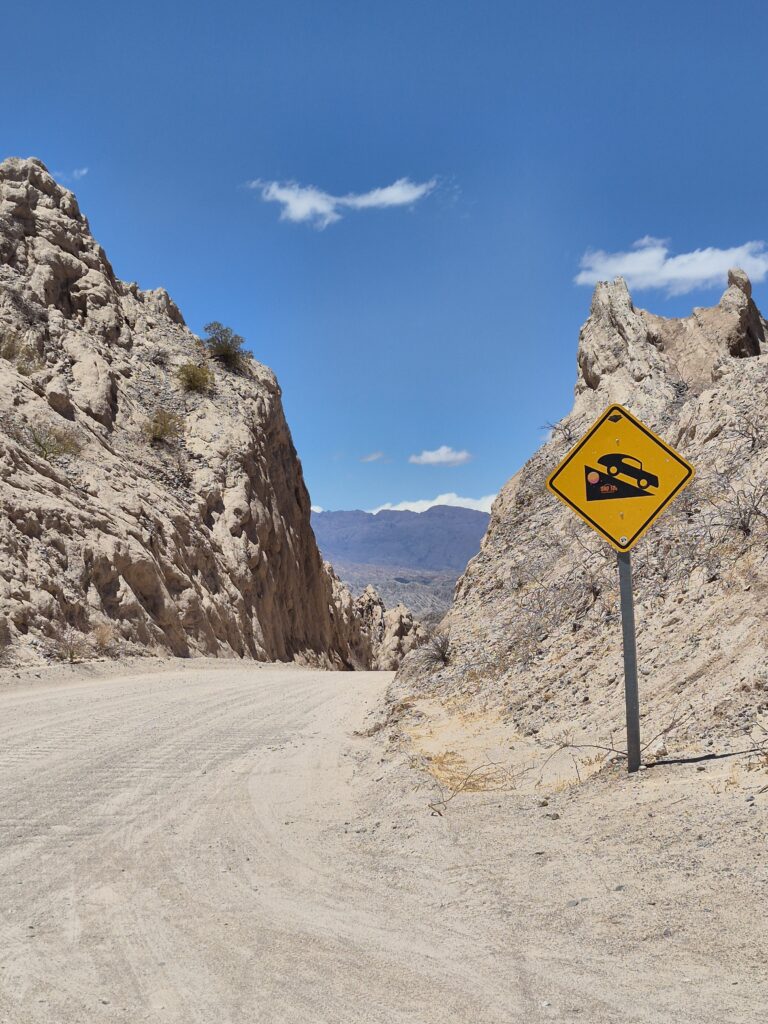 Le lendemain, nous partons en direction de Cachi sur la fameuse Ruta40. Cette portion est réputée pour être en très mauvais état. En effet, il faudra rouler doucement! L’effet tôle ondulée causé par le passage de nombreux véhicule est désagréable: il va falloir une nouvelle fois dégonfler les pneus! En effet, sur les pistes de ripio, nous dégonflons à 2,5 à 3 bar pour plus de confort et pour pour protéger l’intérieur du camion. Les secousses sont moins puissantes et les vibrations amoindries également.