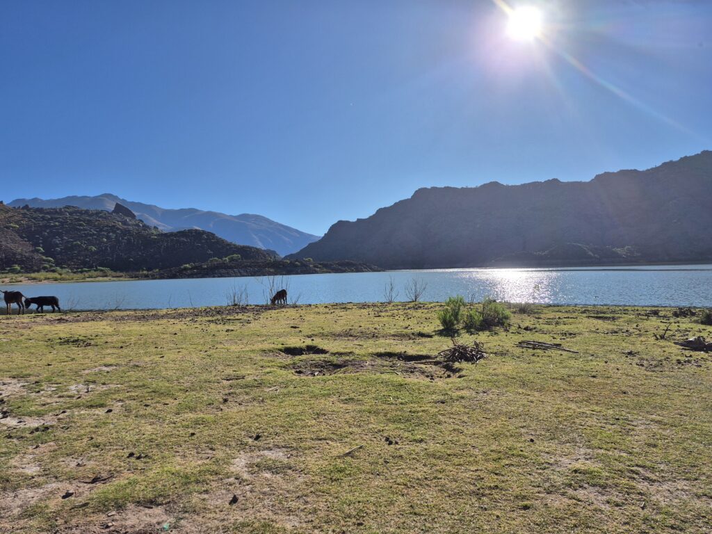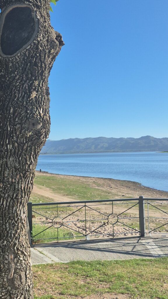 Cette nuit fut extrêmement reposante. Après cette escapade au coeur de la nature, la ville avait quelque chose de rassurant pour ma part. Nous étions au fond d’une impasse au bord d’un lac, avec vue sur les montagnes verdoyantes et sur les lumières de la petite ville touristique et balnéaire qui accueille la bourgeoisie de Cordoba le week-end. Nous y resterons jusqu’au lendemain midi, profitant de la vue pour faire une jolie salle de classe aux enfants.