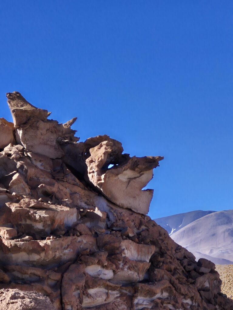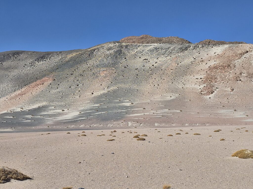 Le lendemain, nous prenons la direction d’El Penon. Le paysage qui défile devant nous est à la fois familier car ressemblant à celui de la Puna nord, et à la fois unique et merveilleux. Les dégradés de couleurs pastels, les vigognes, les roches, c’est un régal pour les yeux. Nous nous arrêtons à l’office de tourisme pour prendre quelques renseignements sur les zones à visiter et surtout sur la praticabilité des routes. La jeune femme nous explique que le volcan Galan et Piedra Pomez ne peuvent être réalisés sans 4×4 et qu’il n’y a pas de loueur à El Penon, ni à Antofagasta. La seule solution est de partir avec un guide. Elle nous propose de nous mettre en relation avec l’un d’entre eux. Nous continuons vers Antofagasta. La journée est très venteuse, difficile de sortir du camion sans avoir de la poussière dans chaque orifice du corps! Nous nous arrêtons pour déjeuner au pied du volcan Antofagasta et son impressionnante coulée de lave. Nous souhaitions réaliser la petite randonnée qui permet d’atteindre le sommet mais le vent nous dissuade de monter. Nous passerons l’après-midi à visiter les environs en camion.