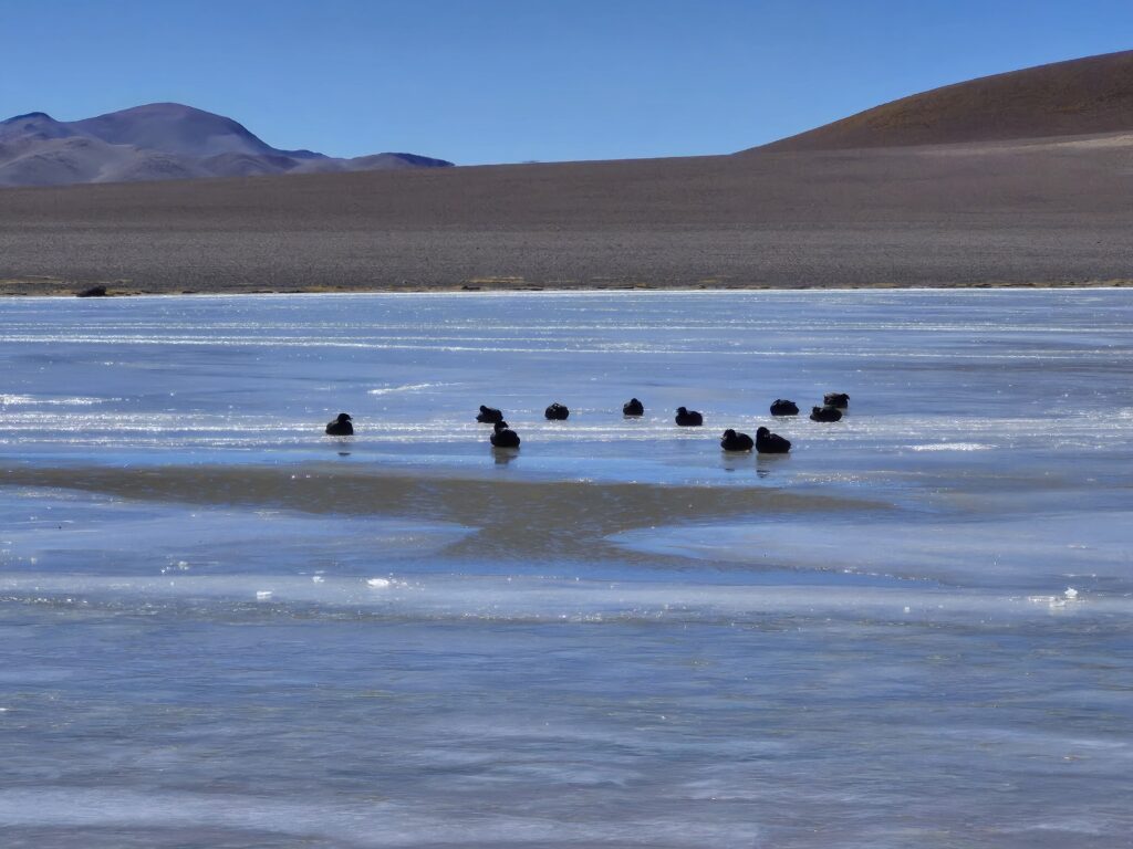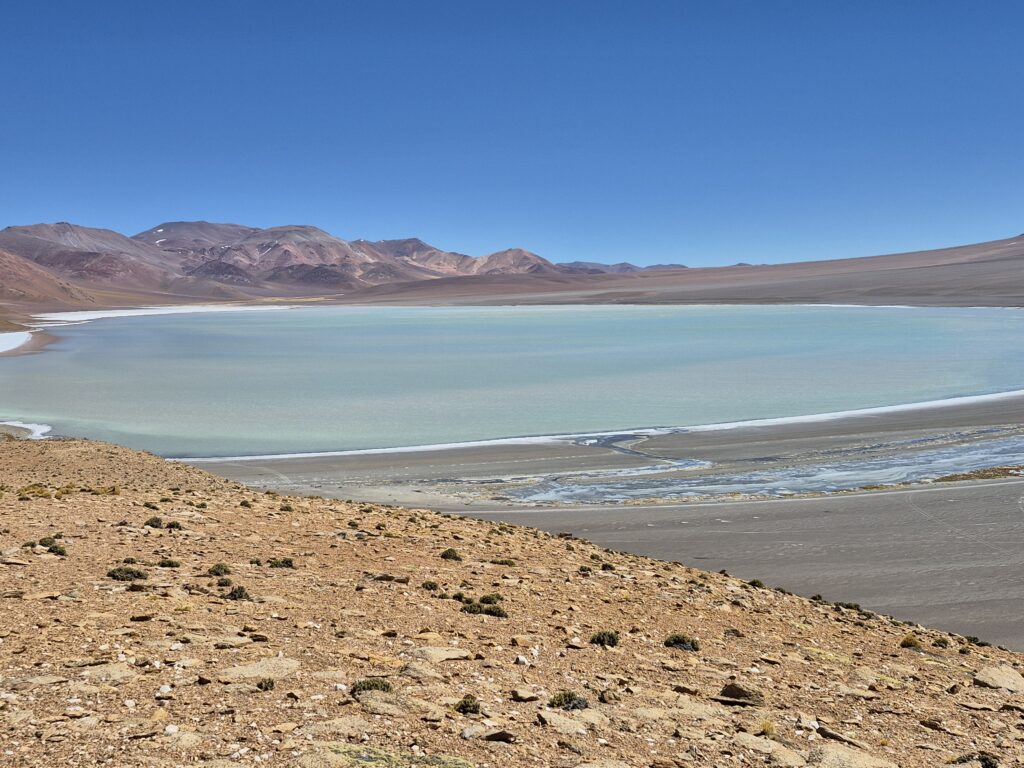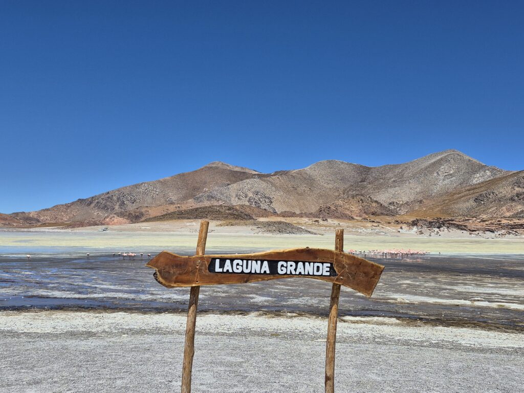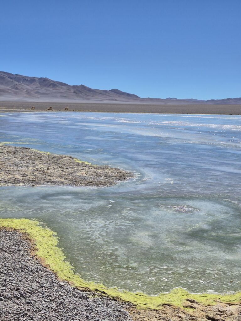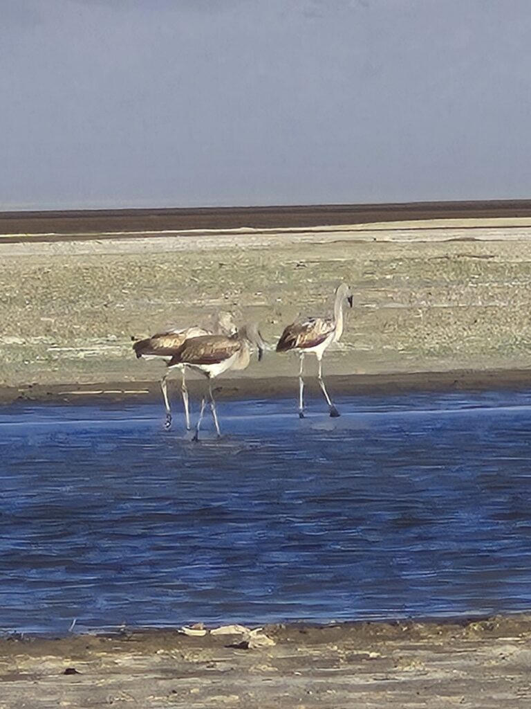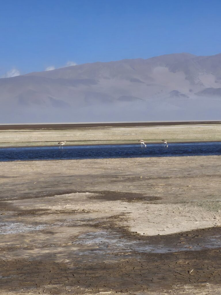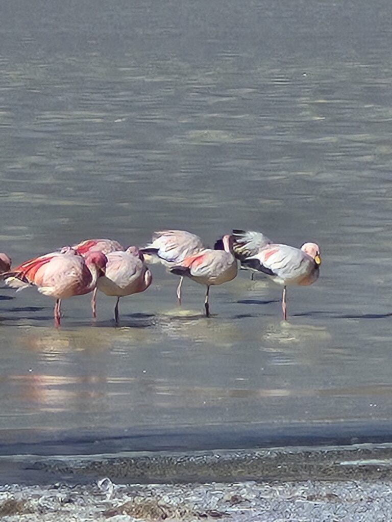 Nous sommes frappés par la différence d’état des routes entre la province de Catamarca et celle de Salta. Il s’agit du même environnement, même relief, même conditions climatiques mais les routes sont toutes asphaltées et de très belle qualité. La route est goudronnée jusqu’à Antofagasta de la Sierra, notre point de chute. Sur la route, nous découvrons une immense dune de sable fin. Nous vérifions l’altitude…nous sommes bien à 3000 mètres et non à la plage! Ici le vent est quasiment permanent et transporte les grains de poussière qui s’amoncèlent devant un obstacle, formant tantôt de petites buttes, tantôt des dunes immenses! Nous nous amusons à la gravir et à la descendre à toute vitesse, cela nous dégourdit les jambes après une journée de route. Nous nous arrêtons à quelques kilomètres d’El Penon pour passer la nuit au bord de la Laguna Blanca. Le paysage est encore une fois saisissant, lagune bleue, bordée de blanc et de vert fluo, bordée par une grande prairie où broutent tranquillement un troupeau de vigogne et protégée par de grandes montagnes colorées. J’aperçois au loin sur la lagune de petites taches. Je saisis les jumelles pour mieux voir et oui, c’est bien ce que je croyais…ce sont bien des flamants roses!!! Je suis toute émue par cette vision et me précipite de hors pour essayer de les voir de plus près. Nous faisons une jolie balade autour de la lagune et observons tous ces animaux sauvages pendant un bon moment. Nous passerons une très belle nuit tout seuls au milieu de cette nature magnifique.