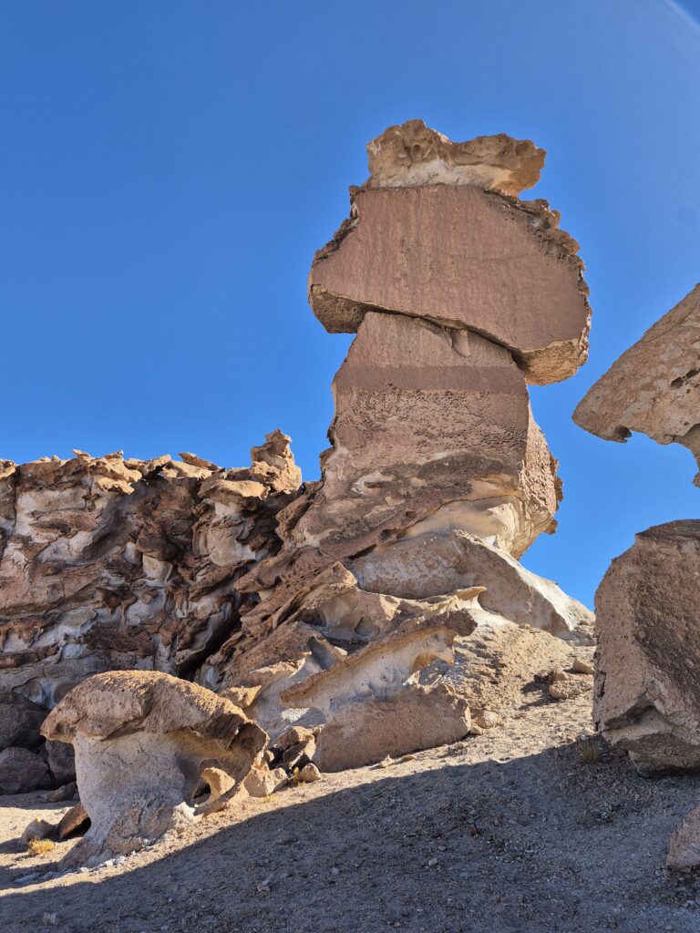 Le lendemain, nous partons visiter en Campo de Piedra Pomez, la plus grande coulée de lave au monde (75 km²) qui a la particularité d’être blanche et rose. Ces pierres, formées il y a entre 73 000 et 100 000 ans, viennent d’une violente éruption volcanique du Cerro Blanco: des nuages de cendre chaude ont été projetés en l’air puis ont refroidi très rapidement en regagnant le sol, ce qui a créé des bulles d’air à l’intérieur de la roche. Cela la rend très légère et très poreuse. Nous avons fait l’expérience de frapper contre un bloc et d’en sortir des notes de musique. Cela fait caisse de résonnance à l’intérieur! Années après années, le vent a sculpté ces roches leur donnant des formes surréalistes et en créant une oeuvre d’art géante naturelle!