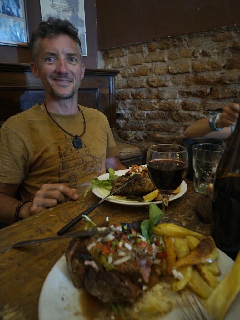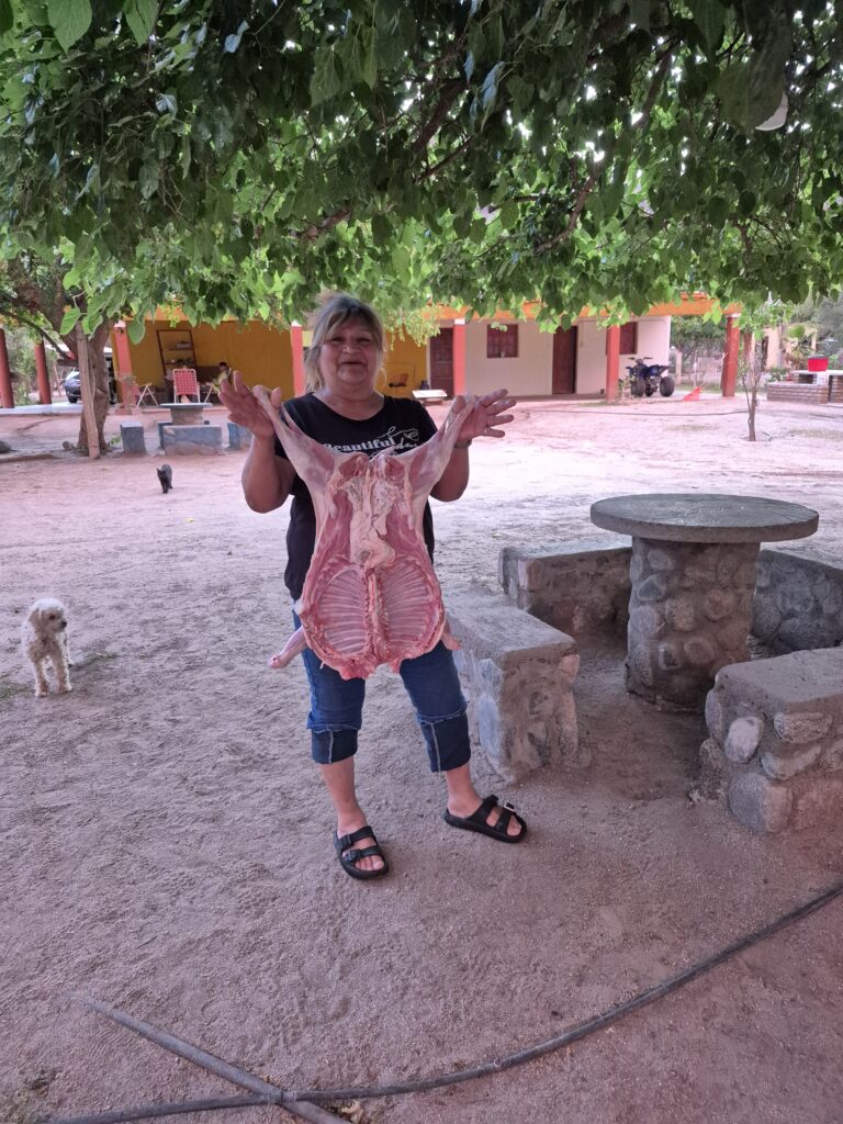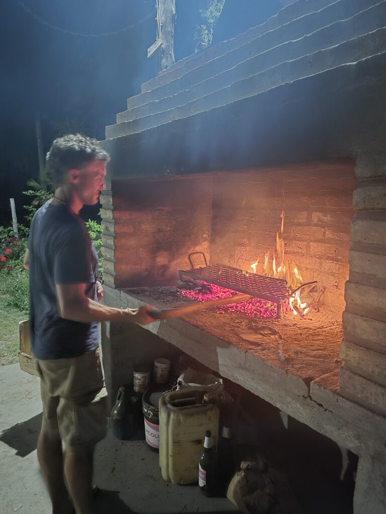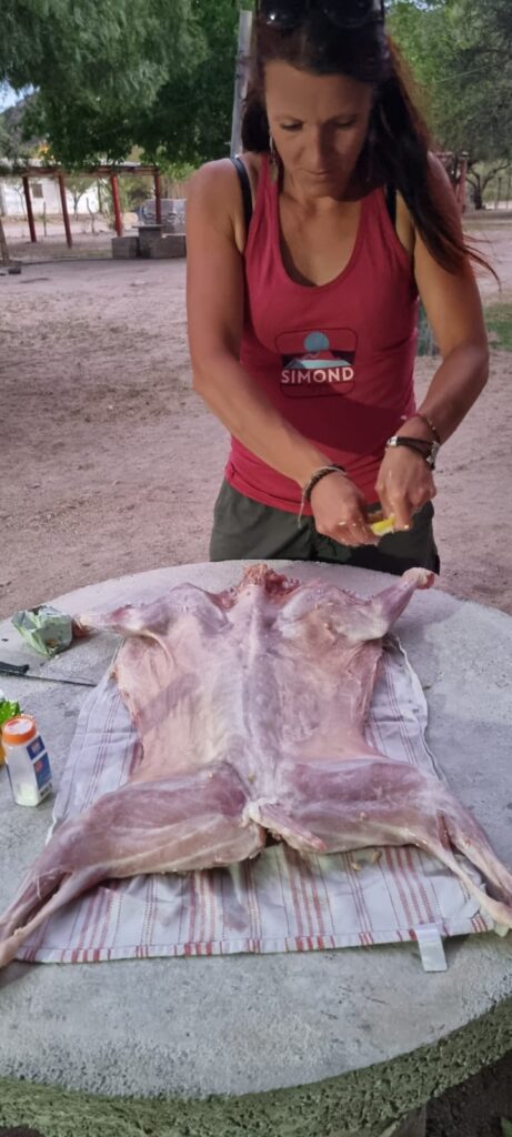 Petite anecdote: le dernier soir, nous faisons un asado improvisé pour cuire un « chivito » que j’ai moi-même malencontreusement commandé! Voilà ce qui arrive lorsque tu comprends de manière approximative l’espagnol! Lors d’une balade à cheval, Pedro, le mari d’Estela, me parle de chivito et me dit que celui du village est le meilleur de la planète. Pour moi, à ce moment-là, un chivito est une spécialité uruguayenne: un sandwich avec une tranche fine de boeuf! Je lui dis bien sûr que j’aimerai le goûter… Ni une, ni deux, Estela viens me voir le jour-même pour me proposer d’en acheter pour moi car elle doit de toute façon se rendre au magasin qui les prépare. Je comprends tout de même à ce moment-là, qu’il s’agit plutôt d’un morceau de viande assez gros et non d’un sandwich. Je comprends également qu’il s’agit de viande de cabri… Estela me parle d’une cuisson au four…je pense à un rôti!!! Quelle ne fut pas ma surprise lorsque, à peine rentrée de notre séance d’escalade, Estela approche, toute fière, avec son chivito dans les mains!!! Elle tenait un cabri entier, par les deux pattes arrière, prêt à être cuisiné! A ce moment-là, je crois que ma première sensation fut le dégoût…ce petit être qu’on a pelé puis coupé en deux et vidé pour être cruellement mangé par des méchants humains!!! Puis, polie comme je suis, j’ai affiché mon plus grand sourire, prête à me lancer dans ce nouveau défi! Estela m’a beaucoup aidée et guidée, elle s’est occupé d’aller chercher le bois, nous a montré comment gérer la cuisson…elle y a pris beaucoup de plaisir et nous avons passé un excellent moment! Nous avons refait le monde en dégustant cet excellent chivito (et oui, il faut l’avouer, je crois que Don Pedro avait raison, le Chivito de San Augustin est le meilleur de la planète!) accompagné d’une bonne bouteille de vin. Estela en a profité pour me raconter quelques cancans du village…croustillant! Ce moment restera pour moi un excellent souvenir dans ce voyage et un moment de partage authentique avec une belle personne…comme quoi, la nourriture et la cuisine sont vraiment un langage universel et les meilleurs prétextes à la convivialité!