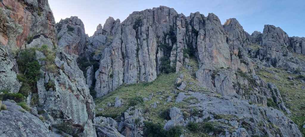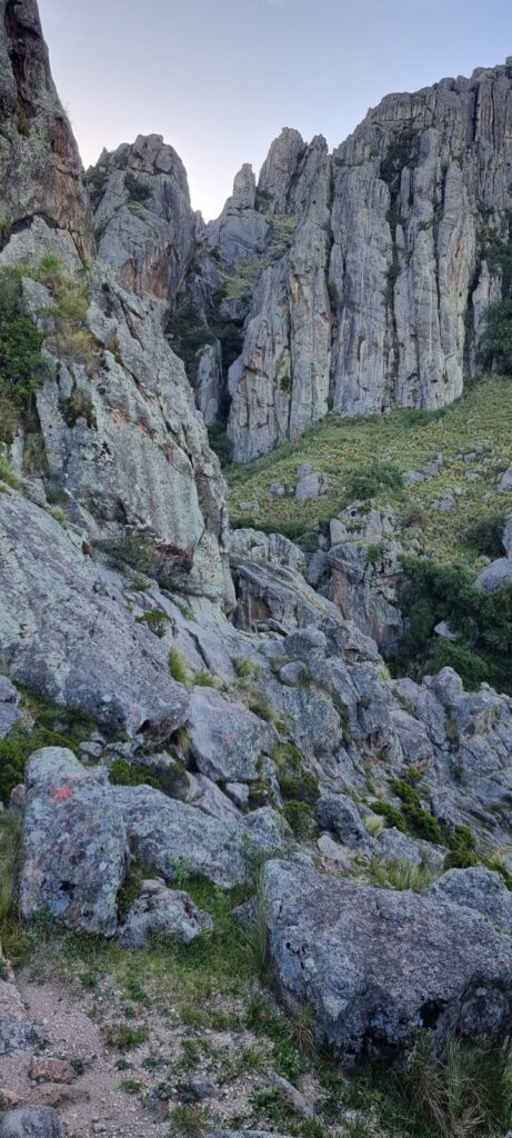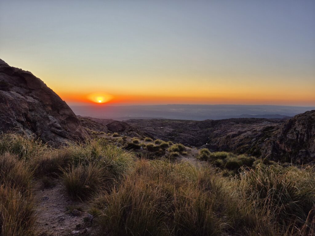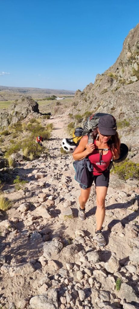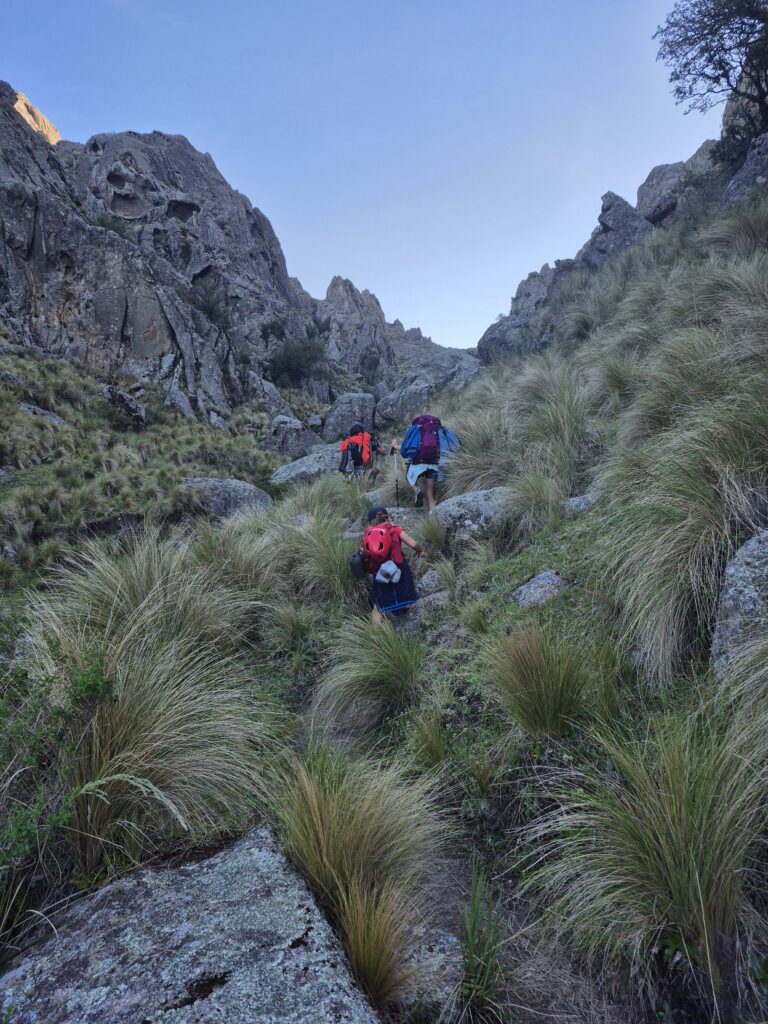 Nous décidons de nous rendre sur le site de Los Gigantes, à 2h d’ici, pour deux jours de grimpe également. Nous quittons la Ola le matin, faisons le plein de courses à Villa Carlos Paz et nous rendons à Los Gigantes. Une idée un peu folle nous prend: et si nous partions en bivouac avec la tente jusqu’au pied des voies??? Ni une, ni deux, à peine arrivés sur le parking, nous commençons à préparer les sacs! Tente, matelas, duvets, nourriture et eau pour 4 personnes, matériel d’escalade, réchaud, un jeu de yam…1h30 plus tard, nous voilà partis, sacs sur le dos, pour une ascension de 2h jusqu’au fameux Cerro de la Cruz, majestueuse paroi de 120m qui surplombe tout le massif. La rando est exigeante, beaucoup de rochers à escalader, un sentier sinueux et parfois mal balisé, et surtout un paquetage lourd sur le dos, mais nous parvenons tous les 4 au pied du Cerro juste à temps pour monter le campement avant la nuit.