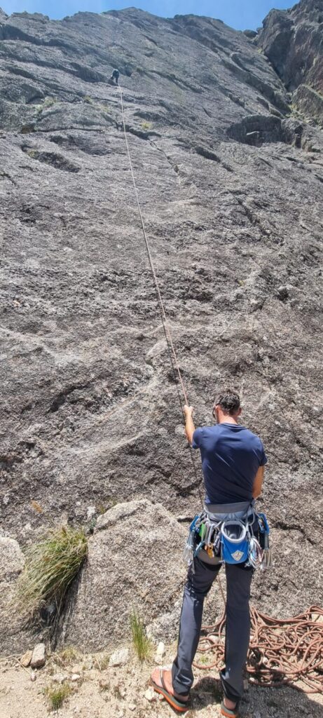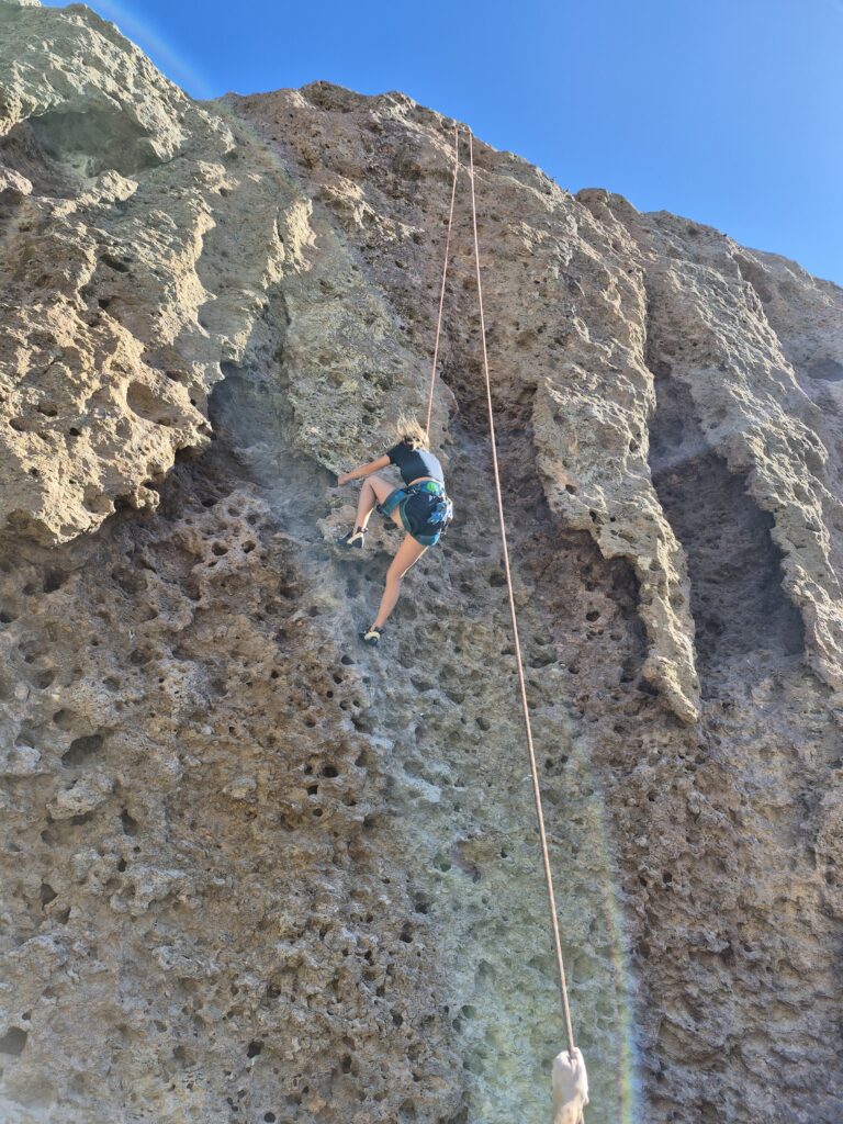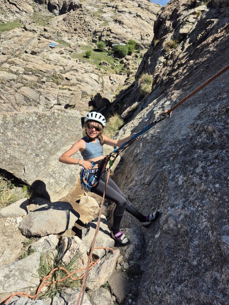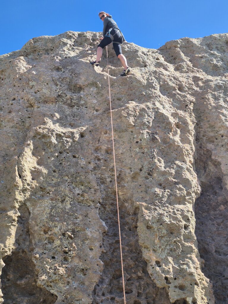 Nous choisissons un secteur facile avec de la grimpe dans le 5 essentiellement pour permettre à Agathe de passer des voies en tête et travailler nos manipulations. L’occasion pour moi aussi de me réconcilier avec la grimpe en tête, chose que je n’avais plus fait depuis longtemps, trop envahie par la peur. Les deux jours de grimpe à San Augustin plus la veille sur ce site m’ont redonné confiance. Je prends beaucoup de plaisir à grimper en tête sur toutes les voies dans le 5! Je suis très contente d’avoir réussi…même si j’ai conscience que le niveau était très simple et que je suis loin d’y parvenir sur une 6a! Nous enchaînons quelques rappels également, pour le plus grand plaisir d’Agathe qui n’en avait jamais fait. Journée plus mitigée pour Gaspard qui ne se sent pas à l’aise. Il essaie de grimper deux fois mais prend peur et peine à descendre…ce n’est décidément pas le plus téméraire de la famille!