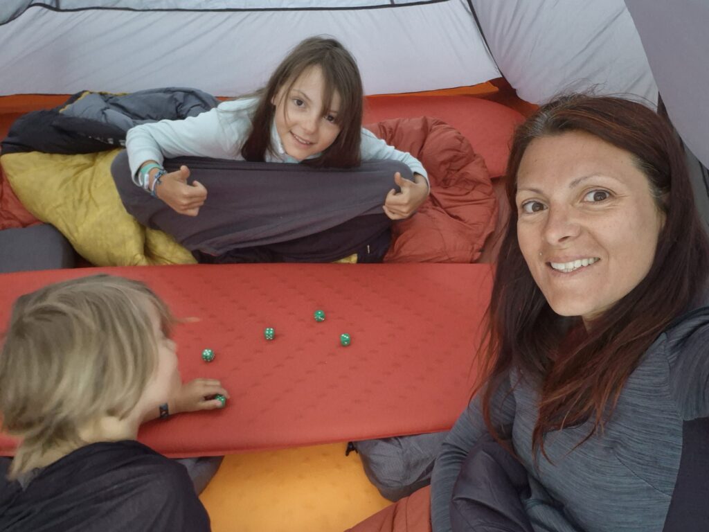 Cette nouvelle expérience est galvanisante, les enfants sont vraiment heureux, s’amusent dans la tente avec leurs duvets en attendant que nous préparions le repas….si nous pouvons appeler cela un repas. Nous n’avons pas vraiment eu le temps de préparer quelque chose d’élaboré alors nous nous contenterons de sandwichs jambon-fromage et d’un fruit. Nous passons la soirée au chaud dans nos duvets à jouer au Yam, puis nous nous endormons les uns blottis contre les autres. Le sommeil sera de courte durée. Je me réveille la première, effrayée par des bruits de pas d’animaux autour de la tente. Je réveille Sylvain qui ne semble pas du tout inquiet. Je pense au jambon, au fromage que nous avons, cela attire peut-être les animaux, ils vont peut-être vouloir entrer, déchirer la tente pour nous prendre notre nourriture…Je me sens tellement vulnérable au milieu de cette nature qui, de jour, me semble si douce et si belle! La nuit, nous sommes les intrus, les hôtes de cet environnement si peu familier et nous n’avons plus qu’à prier pour que ses habitants acceptent notre présence.