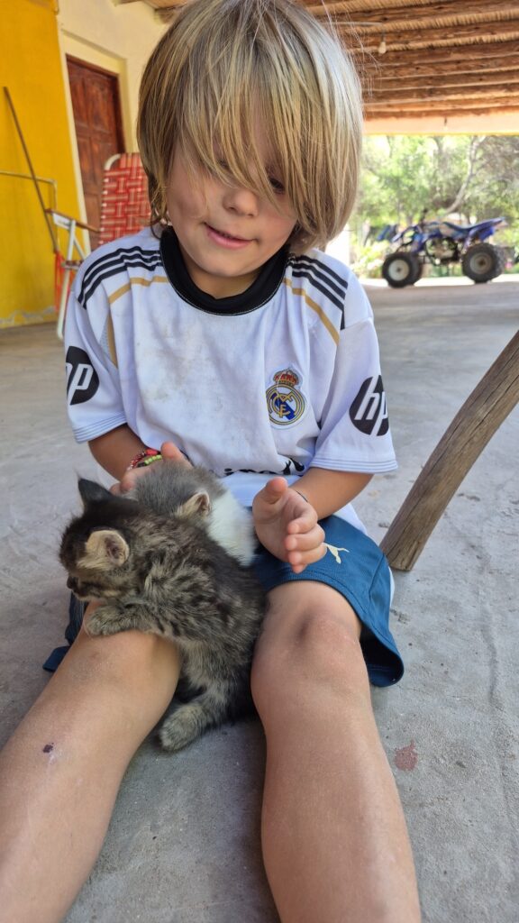 Lorsque nous arrivons, nous nous présentons à Estela, patronne d’un camping dans lequel notre ami avait travaillé plusieurs semaines en tant que guide pour les balades à cheval. Estela se remémore immédiatement Kiké. Elle nous invite à sa table et nous raconte quelques anecdotes. Cela semble lui faire très plaisir de nous recevoir, elle nous dit que c’est un peu comme avoir de la visite de la famille! Agathe et Gaspard se sentent immédiatement très bien ici, la portée de trois petits chaton y étant pour quelque chose! Nous nous sentons immédiatement chez nous et décidons de rester camper ici quelques jours.