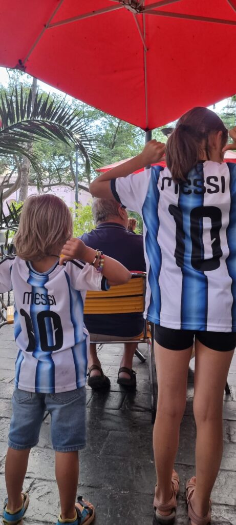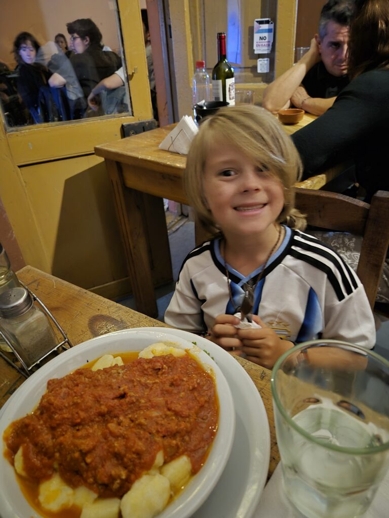 L’heure du repas un samedi soir à Cordoba est proche de 22h. Cela nous laisse encore un peu de temps pour profiter de la petite fête foraine, promesse faite aux enfants la veille. Après une heure de manèges, nous reprenons le taxi pour nous rendre dans un des restaurant emblématiques de Cordoba, dans le quartier Guëmes, la puña traditionnel « Los infernales ». A peine entrés, nous retrouvons l’ambiance de la puña que nous avions fait à Salta. Tables en bois éparpillées, décoration locale un peu chargée, musiciens et couvert simple. Nous sommes très bien accueillis et nous nous faisons plaisir avec une planche apéro, une belle pièce de boeuf, une bonne bouteille de vin, et même un mi-cuit au chocolat en dessert! J’aime beaucoup l’ambiance des puñas, cette douce simplicité alliée à la passion de la musique qui réunit des argentins de tout âge appréciant de chanter tous ensemble toute la soirée. La bonne bouffe, les amis, la musique…la vie quoi!!! Nous traînons jusqu’à un bon 1h du matin avant de reprendre notre taxi pour rentrer au camion.