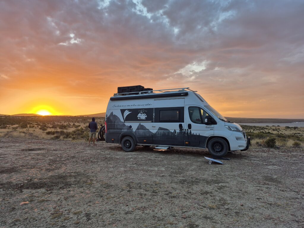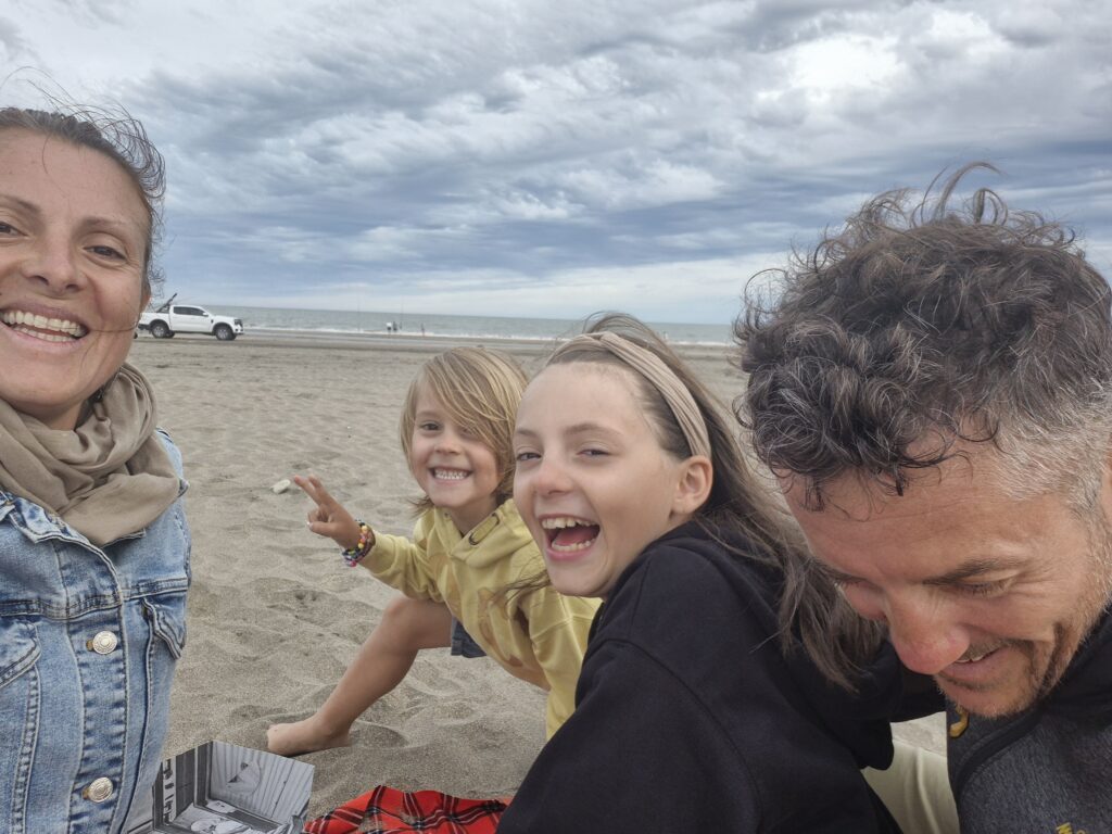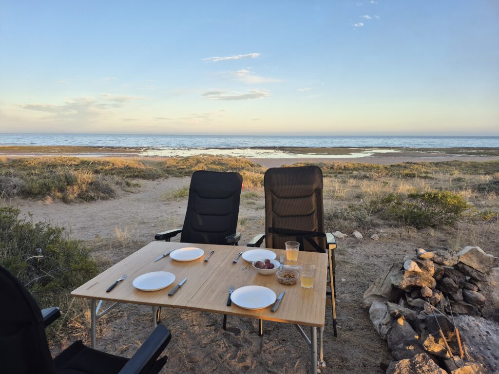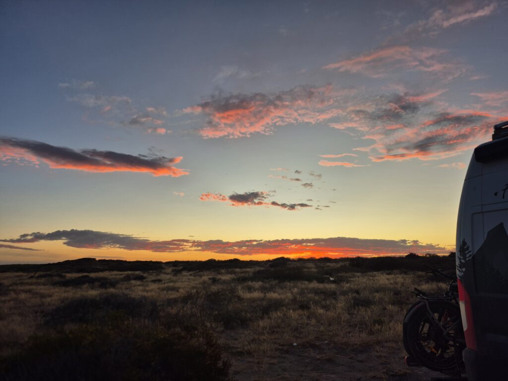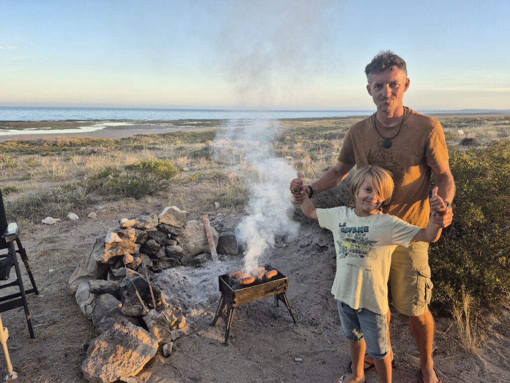Jour 2: Nous roulons tout l’après-midi sur cette interminable ligne droite puis nous arrêtons en fin de journée près de Sierra Grande, à Playas Doradas. Le temps est agréable, il n’y a pas de vent, nous sortons la table et les fauteuils, chose que nous n’avions pas fait depuis bien longtemps. La douceur du soir dure longtemps, idéal pour un barbecue devant le coucher du soleil. Les enfants jouent librement sur la plage pendant que nous préparons le dîner. Un beau paysage, le bruit des vagues, un repas simple en famille, rien de plus…mais c’est déjà tellement!