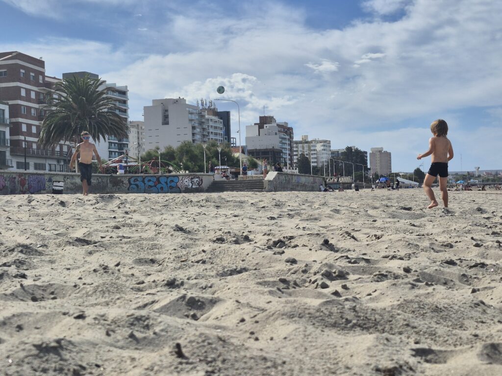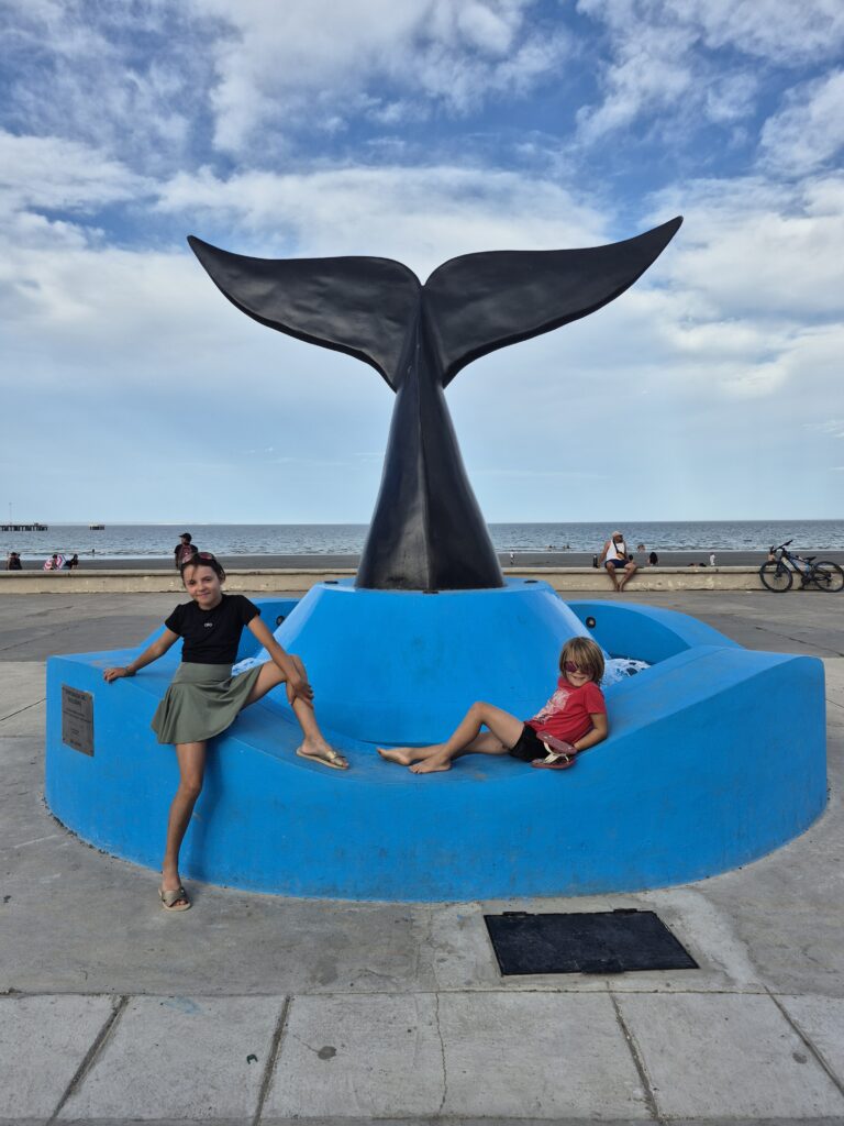 Cette journée est magnifique, il fait presque 30 degrés, le vent est faible et la plage magnifique…à l’unanimité nous optons pour un après-midi baignade, ballon, bronzette, mots croisés!!! Comme cela est plaisant après plusieurs semaines de montagne, de sec, de poussière! L’océan est frais mais au bout de quelques minutes, nous arrivons tout de même à entrer dans l’eau et nous baigner. Les enfants jouent avec les vagues, puis une partie de foot s’engage…mission que je confie à Sylvain pour profiter un peu de ce moment pour finir mon cahier de mots fléchés qui a une dizaine d’années!!! L’après-midi passe ainsi et une fois le linge récupéré, nous quittons Puerto Madryn pour rejoindre les copains Tib-Casita qui sont à Puerto Pyramides, la porte d’entrée de la Péninsule de Valdes où ils viennent de passer 3 jours.