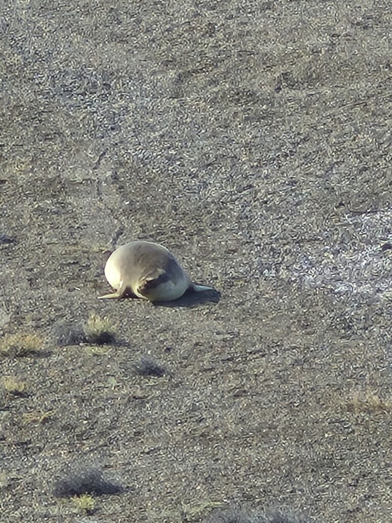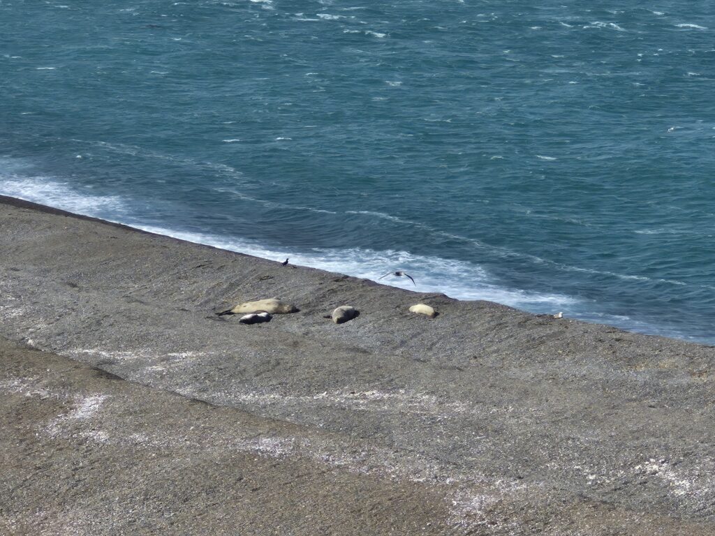 Nous reprenons la route en fin de matinée en direction de Puerto San Julian. Nous n’avons que deux heures de route et arrivons en milieu d’après-midi. Nous décidons donc de parcourir la piste côtière qui surplombe l’Océan. De magnifiques miradors nous permettent d’observer (et d’écouter) des colonies de lions de mer qui se vautrent au soleil sur les rochers plats. Les plus jeunes s’amusent à faire des saltos dans l’eau en se propulsant à l’aide des rochers. Les femelles, elles, sont lamentablement étalées sur la pierre chaude, sous le bon contrôle d’un mâle jaloux qui guette quelconque rival qui voudrait s’approcher de son harem. Après avoir longuement observé ce théâtre, nous décidons de rejoindre une petite plage repérée à l’entrée de la piste pour passer la nuit. Nous nous y rendons et visualisons un espace à peu près plat qui semble bien stabilisé pour garer Inkaiko. Mais cette stabilité n’était qu’une impression, nous avons à peine le temps de nous rendre compte qu’il y a plus de sable que de cailloux que nos roues sont déjà ensablées de 10 cm. Inutile d’essayer d’avantage, nous n’avancerons plus sans aide. Heureusement, deux couples de jeunes pêcheurs sont présents avec leur pick-up sur la plage et acceptent gentiment de nous tirer de là. Nous nous garons un peu plus haut cette fois et passons une soirée et une nuit paisible avec des températures vraiment clémentes et l’absence de vent, choses rares pour cet endroit à en croire ce que nous disent nos sauveurs.