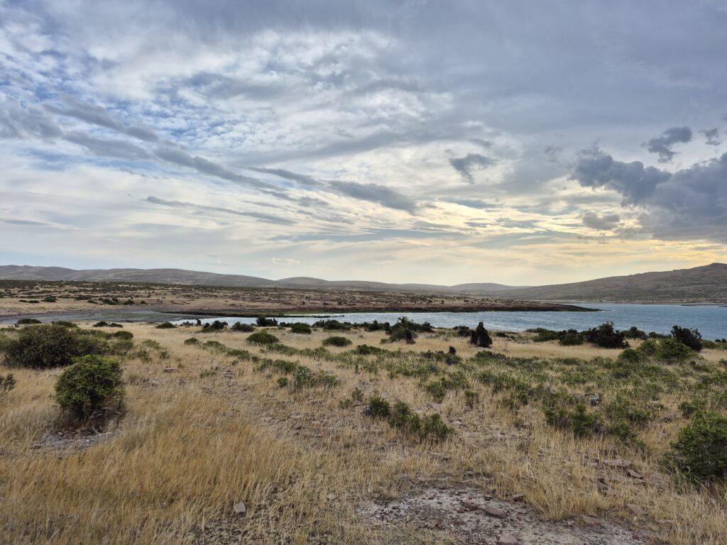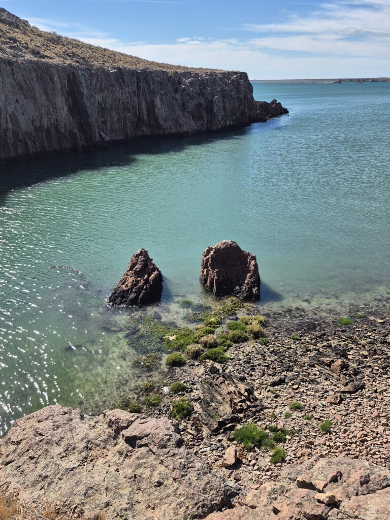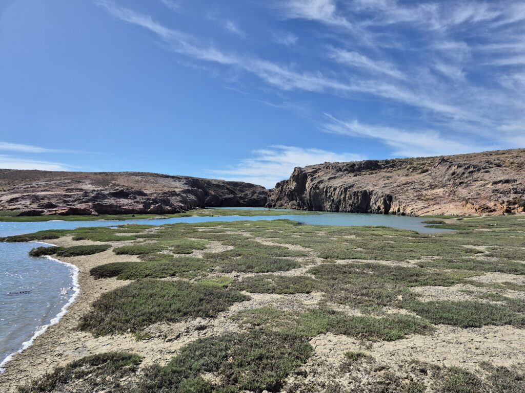 Le lendemain matin, nous nous réveillons avec un paysage extraordinaire. Les couleurs sont encore différentes de la veille. Le rio est vert clair laiteux, les touffes d’herbes jaunes de la steppes sont légèrement couchées par le vent et les lapins sauvages sautillent de part et d’autres à la recherche de leur petit déjeuner. Sylvain part courir sur la piste qui longe le rio et moi je vais me balader dans le canyon voisin pour admirer les nids que les oiseaux ont créé dans les creux des falaises. Au fond du canyon, là où le rivage n’est que rarement recouvert par les marées les plus importantes, une herbe rase et vert fluo pousse, sur un sable blanchi par le sel. Quelques animaux viennent ici se délecter de cette végétation salée: chevaux, brebis, lapins… Après cette balade, nous prenons le temps de faire une petite séance de yoga en observant ce paysage singulier.