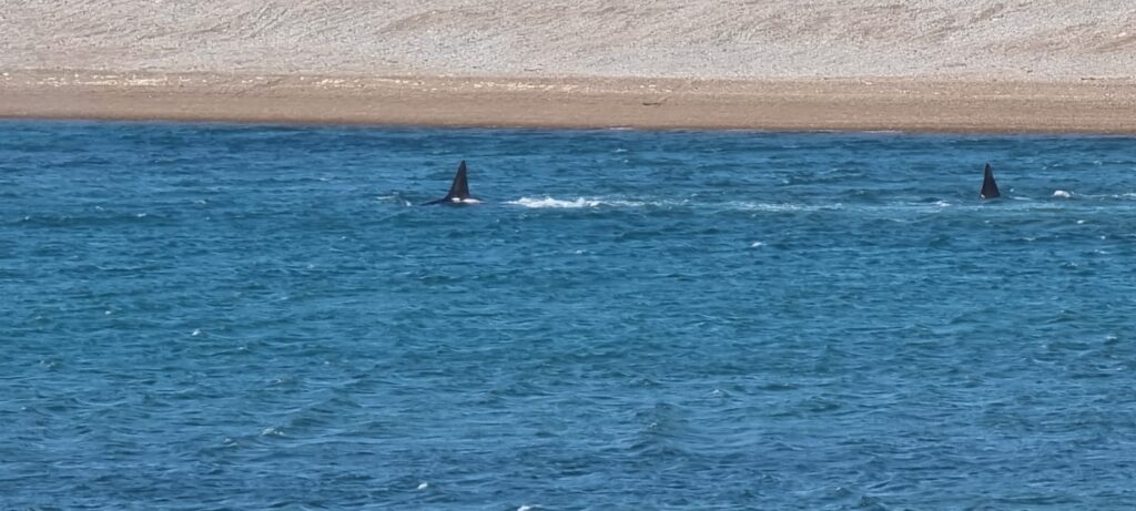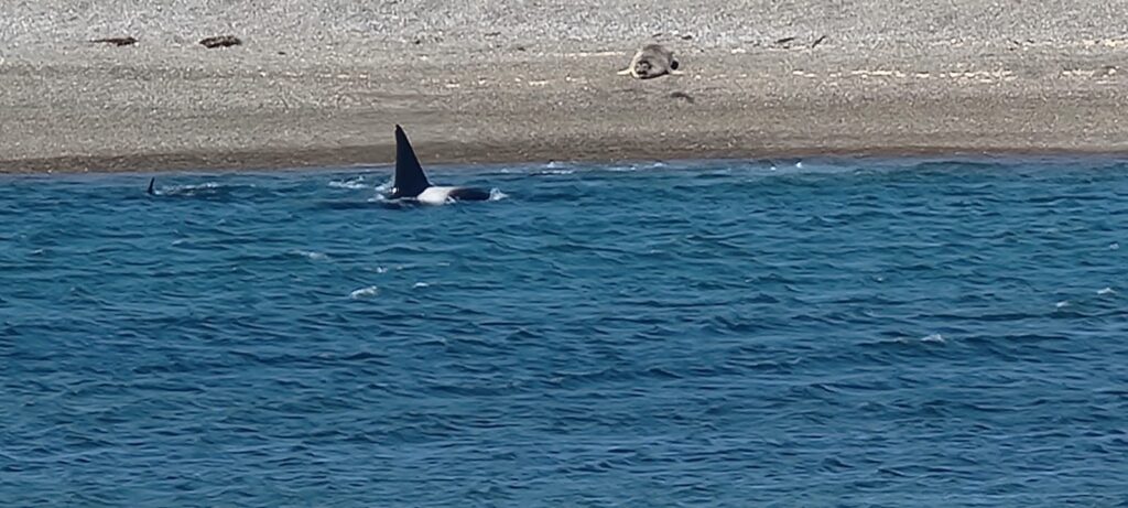 Jour 7: Ce matin, avant de partir, nous avons la chance d’observer deux dauphins qui jouent non loin du rivage. Ce sont les dauphins noirs et blancs de Patagonie. Spectacle court mais magnifique qui met de bonne humeur!