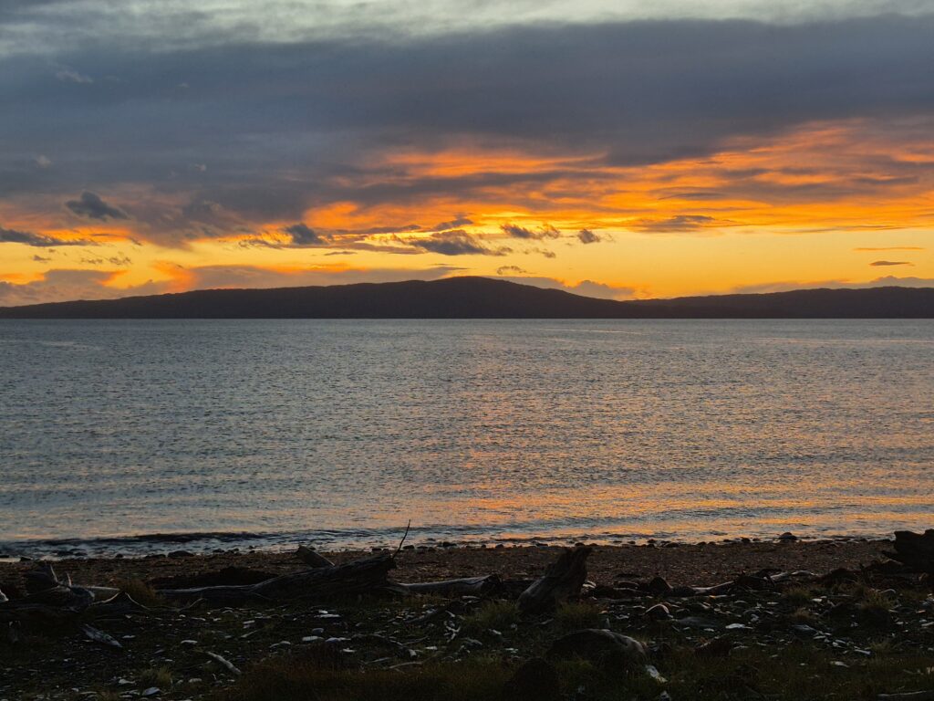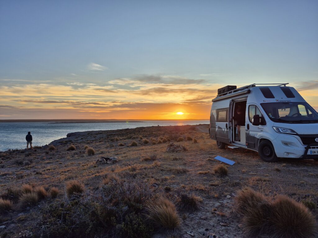 Nous décidons d’emprunter la piste le long du Rio qui sillonne à travers des canyons creusés par les marées. En effet, ici, le Rio se mêle à l’océan et l’eau entre dans les canyons à marée haute. Le paysage est sublimé par la lumière de fin d’après-midi qui fait ressortir les contrastes de vert et d’or. Nous trouvons un spot parfait, en bordure de falaise mais à l’abri du vent, surplombant le Rio et l’un des canyon qui s’emplit deux fois par jour, à marée haute. Nous passons la fin de journée à observer le Rio changer de couleur au fur et à mesure que le soleil descend. Nous profitons d’un magnifique coucher de soleil qui nous rappelle encore une fois à quel point nous sommes chanceux d’être là, à cet instant précis, seuls dans cette nature sauvage et préservée.