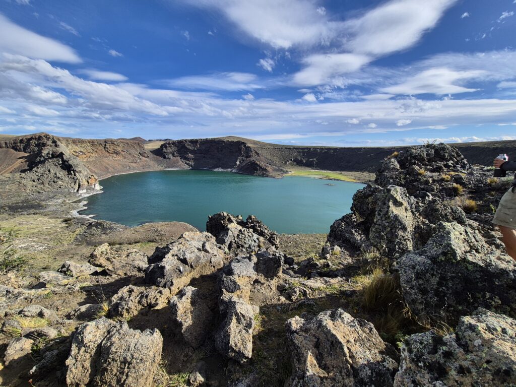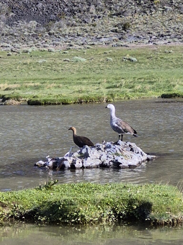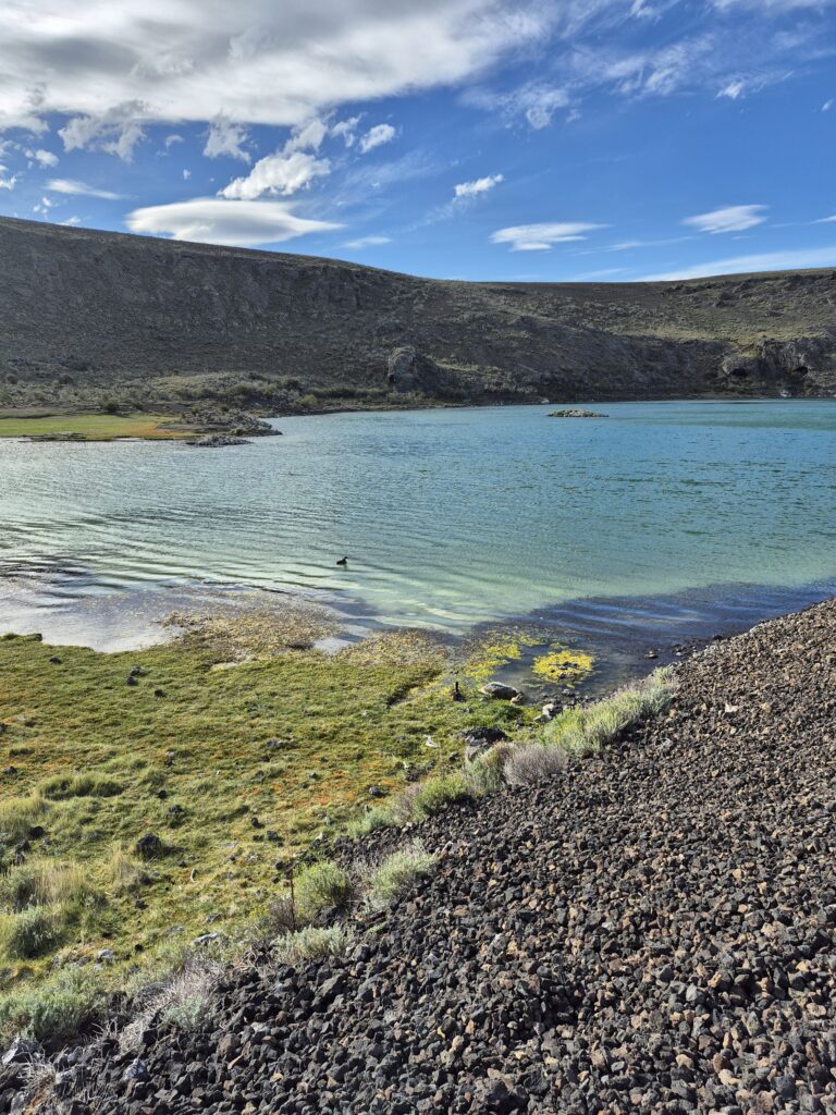 Nous arrivons en fin de journée au bord de la « Laguna Azul », petit cratère volcanique qui abrite une lagune et un grand nombre d’animaux qui ont élu domicile dans ce petit espace protégé des rudes éléments patagons. Nous garons le camion en faisant attention à ce qu’il soit face au vent afin d’éviter les secousses pendant la nuit et partons visiter ce petit cratère. C’est un véritable ravissement qui s’offre à nos yeux. Nous avons l’impression de pénétrer dans un petit monde enchanté où cohabitent lapins, brebis, oiseaux, canards. Nous nous promenons au coeur du cratère en toute humilité en essayant de perturber le moins possible ce petit ecosystème fragile et féérique. Nous passerons notre dernière soirée bien au chaud dans le camion en écoutant le vent siffler dehors.