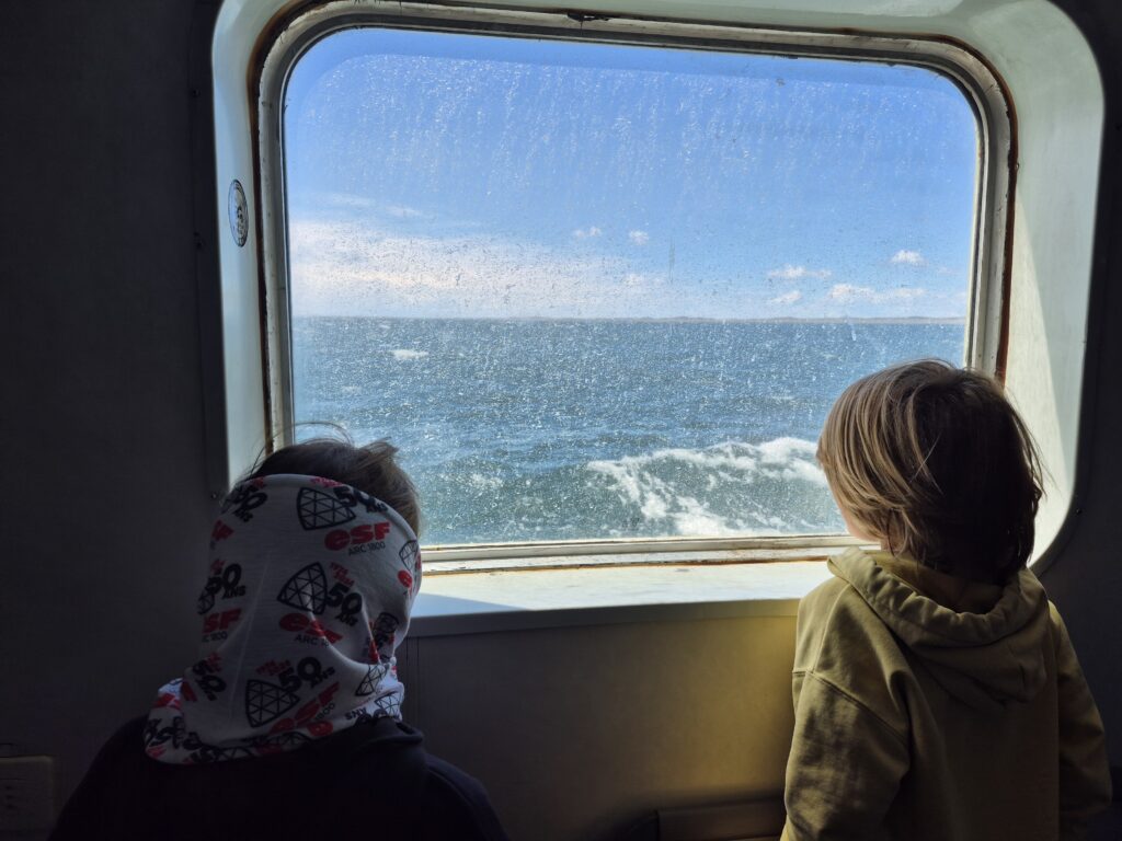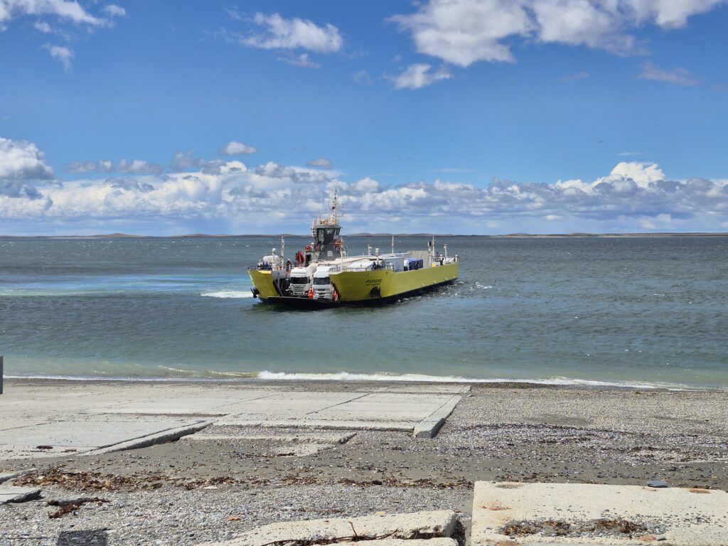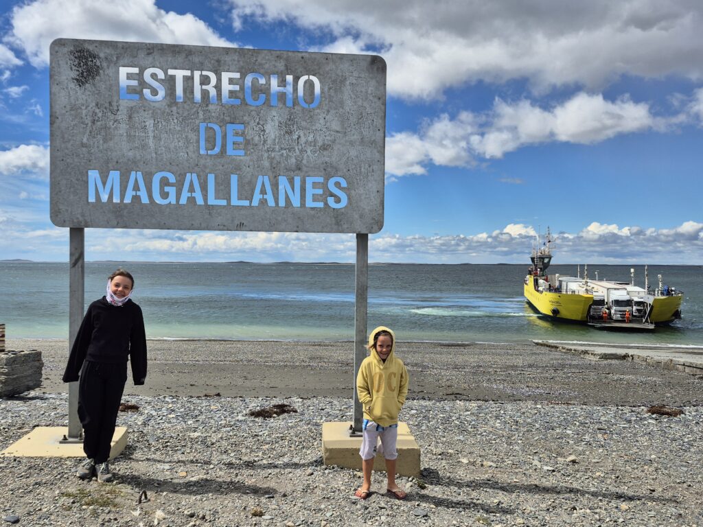 Dernier jour de route avant d’atteindre la Terre de Feu. Nous avons deux frontières à passer (Argentine-Chili puis Chili-Argentine) ainsi que le célèbre détroit de Magellan. En effet, la Terre de Feu est une province argentine mais elle est séparée du reste du pays par un territoire chilien d’environ 200km. Nous avons bien fait attention à vider notre frigo de nos produits frais, interdits d’entrée au Chili. Nous passons la frontière sans encombre. Celle-ci est plutôt bien organisée et les étapes bien définies: migration pour nos passeports, puis douane pour le document du camion et enfin la SAG pour la vérification des produits interdits. La liste est longue et nous avons forcément quelques articles prohibés. Cependant, la femme qui inspecte le véhicule est très sympa, elle nous laisse nos lentilles en nous demandant de les finir à Ushuaia et vide notre poubelle des peaux de bananes et autres épluchures de légumes. Nous continuons notre route jusqu’au fameux détroit de Magellan, ce nom qui nous rappelle nos cours de géographie, les histoires d’explorateurs, de transatlantique, de colons. Ce nom à lui seul est synonyme de voyage et de terres lointaines. Il nous rappelle que nous sommes très loin de chez nous, à quelques jours de la fin du monde! Nous arrivons devant l’embarquement de la barge qui va nous faire traverser le bras de mer. Pas de chance, l’une d’elle vient de partir et nous devons attendre une heure pour embarquer sur la prochaine. Nous en profitons donc pour prendre quelques photos et boire un maté dans le camion. On ne tient pas longtemps dehors, le vent glacial gèle nos jambes nues qui n’ont pas mis de pantalon depuis bien longtemps! Nous comprenons alors que notre voyage va prendre une autre tournure et que nous allons pouvoir sortir nos vêtements d’hiver. Les glaciers et l’Antarctique ne sont plus très loin, nous les avons attendus et pourtant, nous ne sommes pas vraiment prêts! A peine une heure plus tard, nous voici embarqués sur le ferry pour une bonne heure de traversée. Le détroit est agité, certaines vagues parviennent à éclabousser jusque sur le camion, à l’intérieur du Ferry. Nous observons le détroit à travers les vitres du salon des voyageurs en prenant conscience d’une nouvelle aventure qui commence…