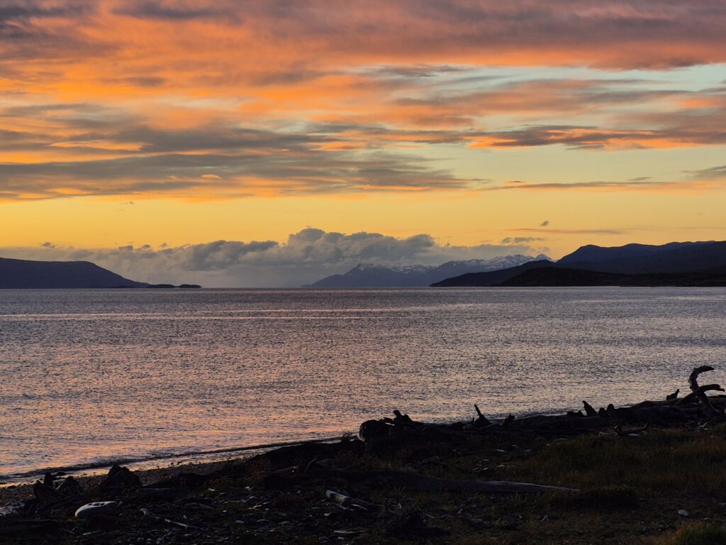 L’après-midi, nous continuons notre route vers Ushuaïa. Il nous reste une bonne journée avant notre rendez-vous alors nous décidons de parcourir la « Ruta J », route de la fin du monde. C’est une piste de 60 km qui se parcourent en 3h environ car le ripio est en très mauvais état. Cependant, nous ne regrettons pas de nous y être engagés. Nous traversons d’abord une forêt assez densément peuplée pour la région. Les habitations sont souvent de simples cabanes en bois, de plein pied ou à un étage, au milieu d’un terrain herbeux, parcouru de petits ruisseaux, où s’entassent des monticules de bûches coupées à la hâche. Nous avons l’impression d’être transportés chez des trappeurs canadiens! La route longe ensuite le canal de Beagle pendant une bonne dizaine de kilomètres et le paysage est spectaculaire. Les eaux très calmes en l’absence de vent reflètent le paysage comme un miroir. On a parfois du mal à différencier l’eau et le ciel. La route sillonne entre terre et mer. Nous traversons tantôt des marais et des rivières, longeons de petits étangs dans lesquels barbotent canards et oiseaux. Nous pouvons parfois apercevoir l’autre rive du canal de Beagle, côté chilien. Nous ressentons véritablement cette ambiance de fin de la terre, d’autant plus que nous sommes quasiment seuls. Nous croisons tout au plus 3 véhicules durant les 60 km. Nous arrivons à la fin de la route en fin de journée. La route s’arrête au portail d’un sémaphore. Impossible d’aller plus loin en véhicule. Il existe un sentier qui permet de continuer un peu à pieds, jusqu’au bout du bout. Il se fait tard, nous cherchons un endroit où nous arrêter pour passer la nuit. Il n’est pas facile de trouver un endroit accessible sans risquer de nous enliser. Nous choisissons donc le bord de la route, le long d’une plage, à quelques centaines de mètres du sémaphore. Nous ne risquons pas d’être dérangés par les voisins ni par le trafic de voitures quasiment inexistant. Malgré l’heure tardive (certainement 21h), le soleil tarde à disparaître. En cette période de l’année, la nuit ne dure qu’à peine 4h. Nous aurons la chance d’assister au coucher de soleil le plus long de notre vie. Vers 22h30, le ciel s’embrase pendant plus d’une heure! Un spectacle saisissant qui n’en finit jamais de nous surprendre par ses changements de couleurs et de lumière. Le tout se reflétant dans le canal de Beagle sur lequel naviguent tranquillement deux ou trois paquebot de croisière qui filent doucement vers l’Antarctique. Cette « route J » mérite vraiment le long détour, c’est une expérience hors du commun.