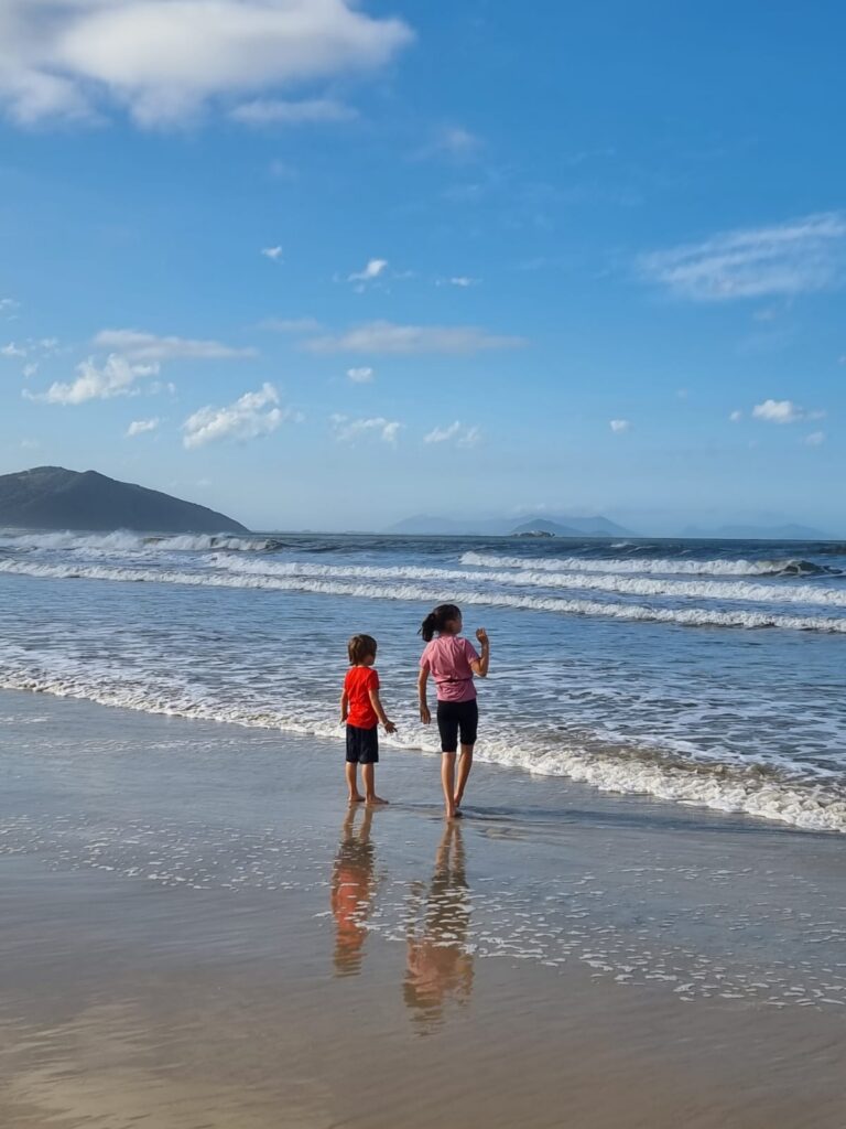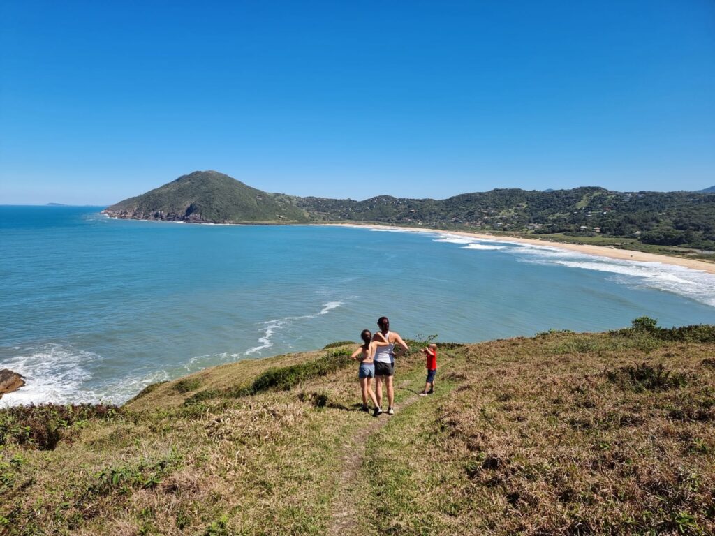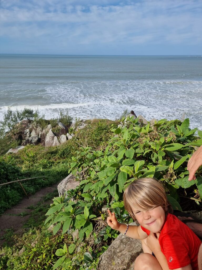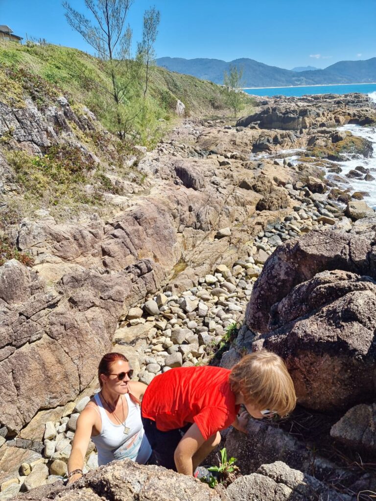 Ce matin du troisième jour à Garopaba, nous partons en randonnée en longeant la côte. Le soleil est radieux, le paysage est magnifique, et varié. Nous passons tantôt à travers la forêt, tantôt sur les rochers au bord de l’eau ou même encore en haut de falaises qui surplombent l’océan. Nous avalons ces 13 km en quelques heures, profitant des piscines naturelles, des blocs d’escalades frappées par la houle et des plages rencontrées sur notre passage. Les enfants marchent très bien, ils ne se plaignent même pas (sauf quand la côte est trop raide!). Faire marcher des enfants dans la nature est assez facile, il y a des distractions partout, des trésors à ramasser et une liberté de mouvement qui leur convient bien.