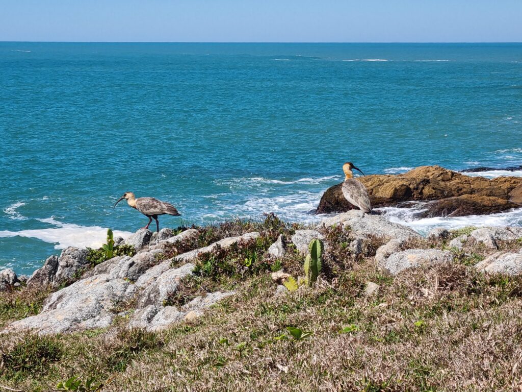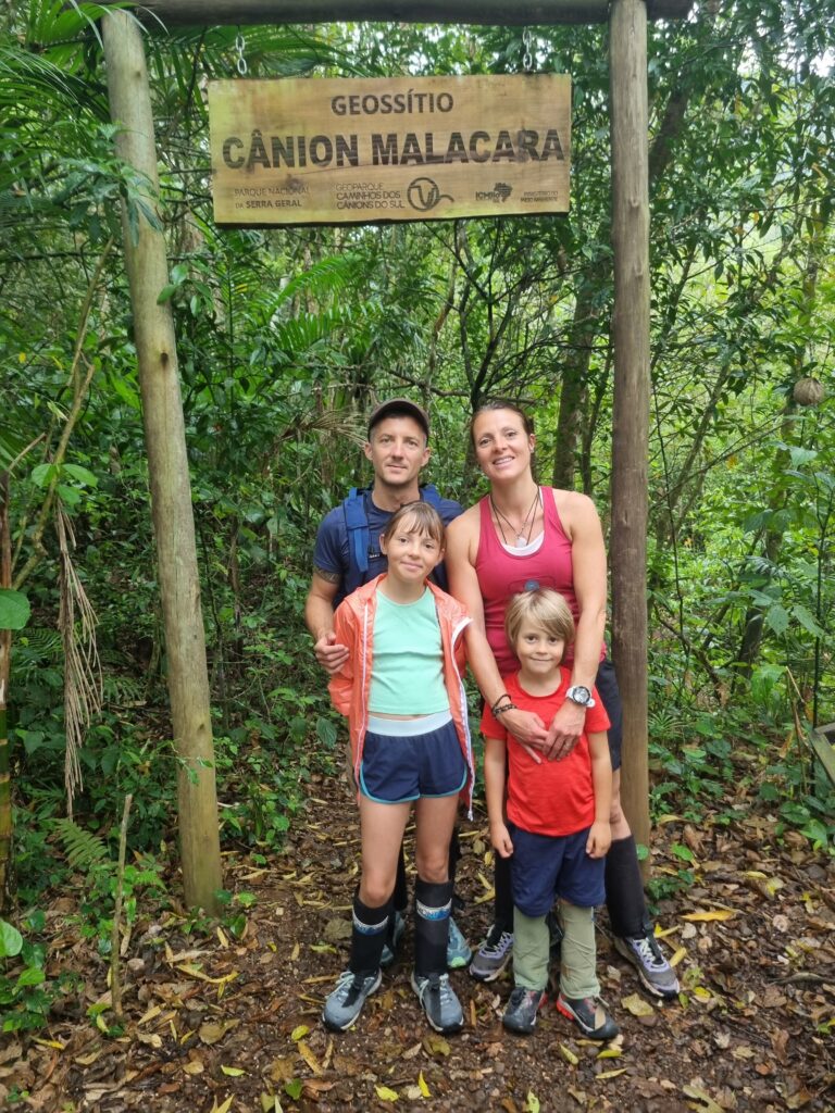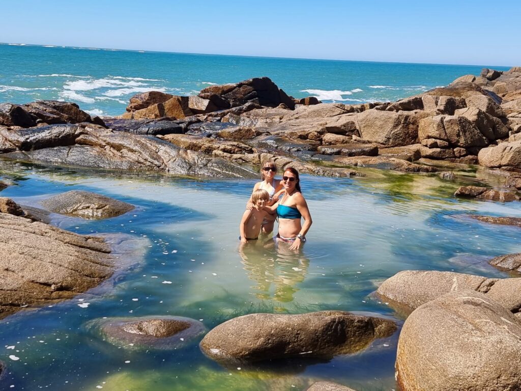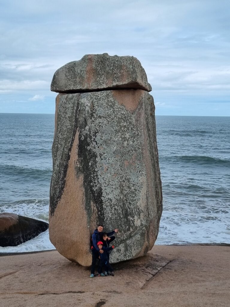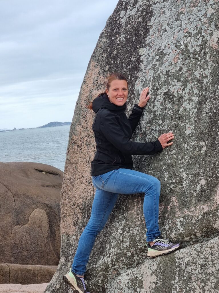 Ce matin du troisième jour à Garopaba, nous partons en randonnée en longeant la côte. Le soleil est radieux, le paysage est magnifique, et varié. Nous passons tantôt à travers la forêt, tantôt sur les rochers au bord de l’eau ou même encore en haut de falaises qui surplombent l’océan. Nous avalons ces 13 km en quelques heures, profitant des piscines naturelles, des blocs d’escalades frappées par la houle et des plages rencontrées sur notre passage. Les enfants marchent très bien, ils ne se plaignent même pas (sauf quand la côte est trop raide!). Faire marcher des enfants dans la nature est assez facile, il y a des distractions partout, des trésors à ramasser et une liberté de mouvement qui leur convient bien.