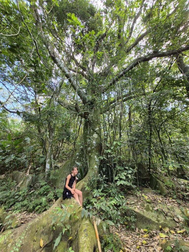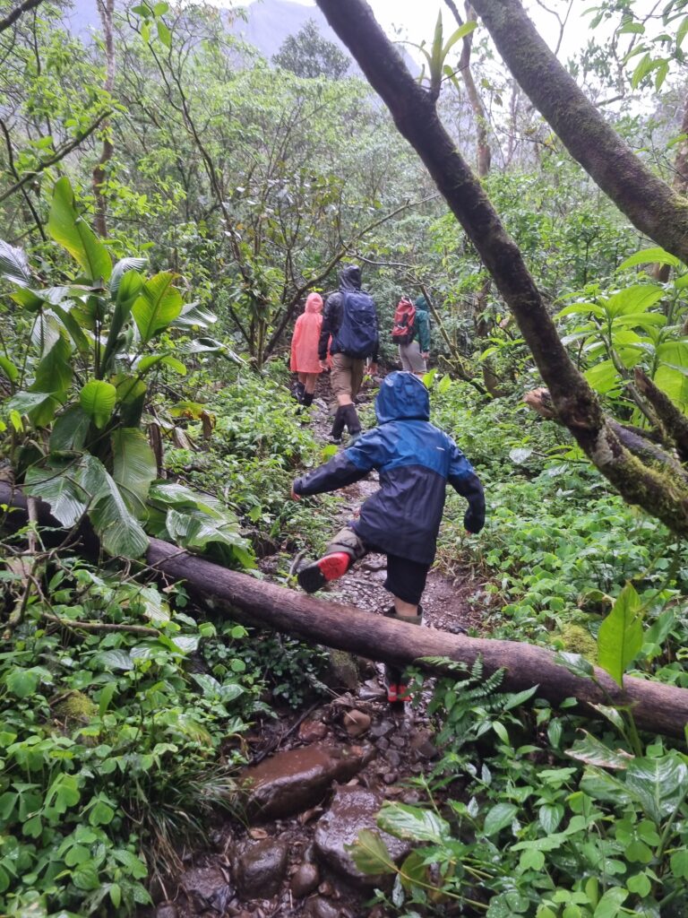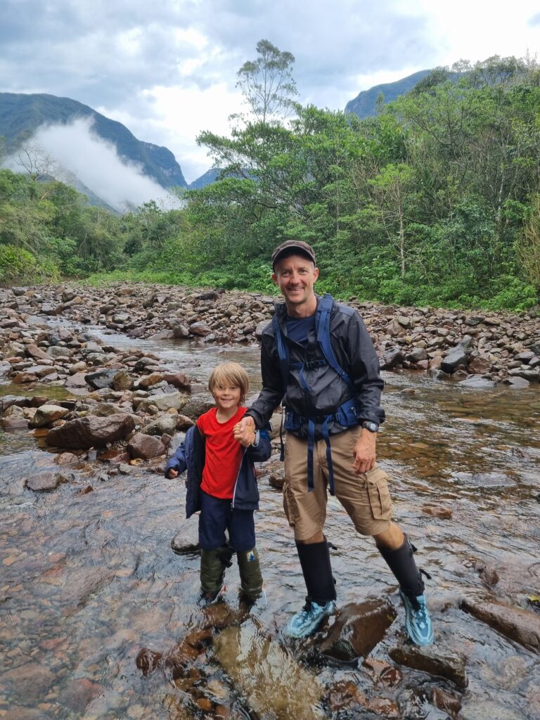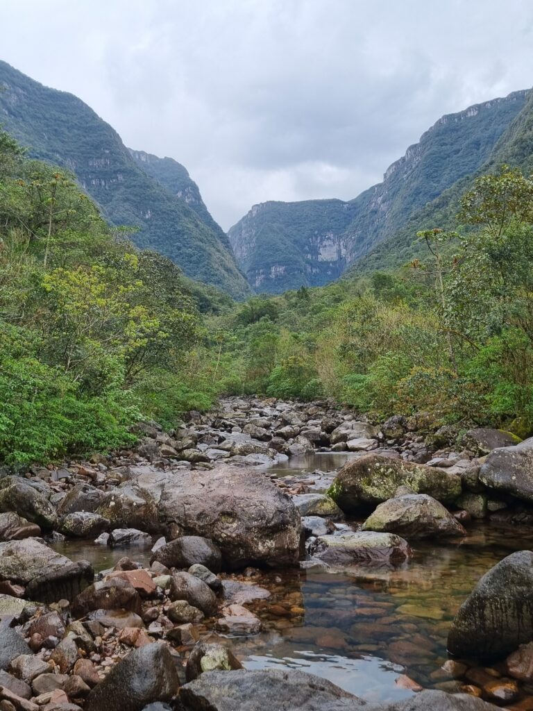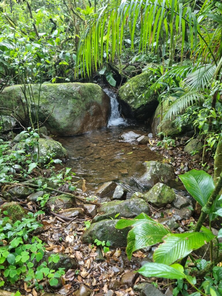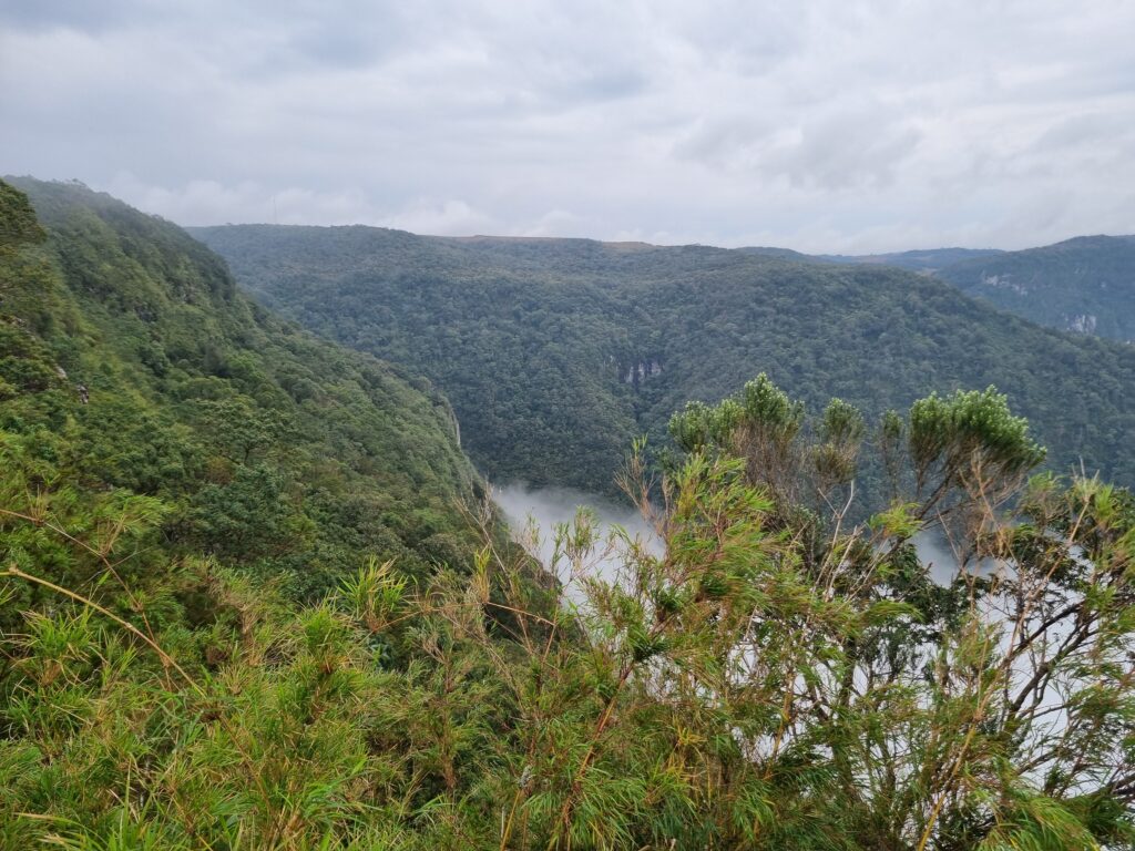 La randonnée est très agréable. Nous suivons Dani à travers cette forêt atlantique dense et humide. Elle nous fait découvrir des plantes médicinales et arbres endémiques, nous suçons des trèfles 10 fois plus gros que ceux que nous connaissons en France, dégustons des fruits dont j’ai oublié le noms (mais délicieux!) et découvrons l’histoire des canyons et de la région. Elle nous explique qu’une partie du chemin empruntée était, avant 1992, date à laquelle la Serra est passé sous la protection des parcs nationaux, une route empruntée par des gros camions qui venaient couper des arbres. Depuis la fermeture de la route, la nature a repris ses droits rapidement, les arbres ont poussé à grande vitesse si bien qu’e l’on ne puisse pas du tout ‘il est difficile d’imaginer que des camions passaient ici il y a 30 ans! Le chemin est tantôt boueux, tantôt pierreux et nous traversons à plusieurs reprises la rivière avec de l’eau arrivant parfois jusqu’au genou. Nous observons le sommet du canyon depuis ses profondeurs accompagnés par le chant des oiseaux et les cris des singes que l’on perçoit au loin. L’humidité ambiante, la végétation luxuriante, et le son de l’eau parcourant les rochers créent une atmosphère brumeuse et mystique. Au bout du sentier, nous trouvons deux piscines naturelles dont l’une d’elle mesure 13 mètres de profondeur. L’envie de s’y baigner est très forte mais à cette saison l’eau est fraîche et la température extérieure pas suffisamment élevée pour se réchauffer. Nous tenterons la baignade jusqu’à mi-cuisses mais pas plus loin.