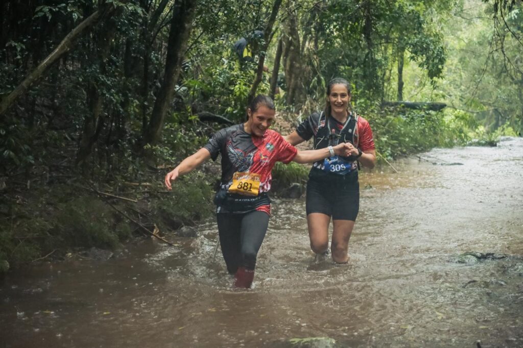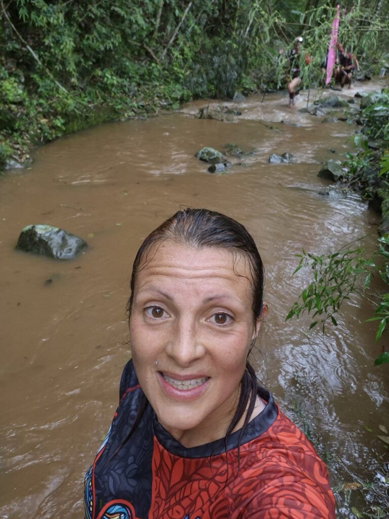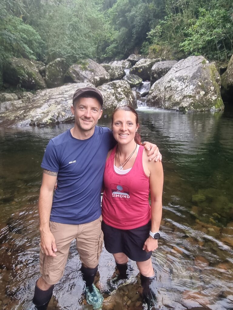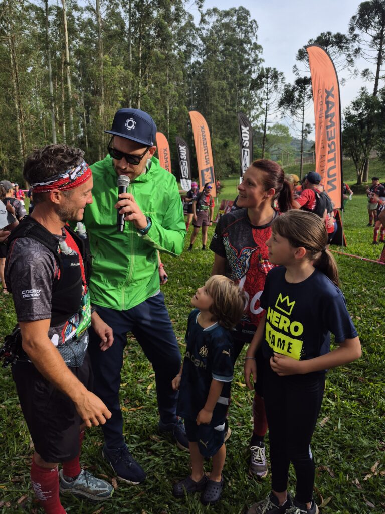 Le lendemain matin, dès 5h, c’est l’effervescence sur le petit terrain de camping. Les navettes déposent les coureurs du 50km qui partent à 5h pétante, accompagnés d’un animateur survolté et de musique festive! Le départ du 36km à 6h30 sonnera aussi la fin de notre nuit. L’ambiance est très sympathique et bon enfant. Nous prenons un léger mais énergétique petit déjeuner, puis Sylvain se prépare lui aussi à partir pour le 26km. L’animateur appelle Sylvain et lui pose quelques questions au micro…mais qui sont donc ces Français qui viennent courir? Certains pensent qu’on est connus en France!!! Le départ est vraiment très festif, musique, chant, danse, fumigène coloré… La télévision est présente et je me retrouve interviewée: questions en Portugais, réponses en Espagnol…on s’arrange!!! A quelques minutes du départ, l’orage attendu fait son apparition, grondement de tonnerre et pluie battante s’abattent sur la ligne de départ: la course s’annonce particulièrement humide! C’était peu dire! C’est sous un orage tropical que je pars pour les 13km de course: pluie torrentielle, grêle, tonnerre, éclairs et vent de face…les pires conditions que j’ai jamais connues, comme si la jungle voulait me montrer de quoi elle était capable, comme pour me prévenir que si je voulais fouler son sol, je devais savoir que cette terre était hostile et montrer que j’en étais digne! Nous évoluons à travers la forêt dense sur des « sentiers » étroits dessinés à coups de machette, passant parfois à travers des champs pentus et détrempés que certains coureurs prennent pour des toboggans. De temps à autres, nous débouchons sur une piste qui nous permet d’être plus détendus mais aussi plus exposés aux éléments. Tout à coup, j’entends des cris, des éclaboussures, ce doit être la fameuse cascade. Le chemin traverse une rivière, au pied d’une chute d’eau que j’ai à peine le temps d’apercevoir, puis continue droit dans la rivière. Près d’un km à sonder chaque pas pour ne pas glisser sur un rocher. Le rythme est haché, en fonction du terrain rencontré mais étant partie dans la première vague, je ne me retrouve pas coincée derrière d’autres coureurs dans les passages techniques comme une échelle ou une corde. J’avance bien, sans pour autant me faire violence. Je veux que cette expérience reste un bon souvenir et du plaisir. Lorsque j’arrive enfin proche de la ligne d’arrivée, Agathe et Gaspard, le sourire aux lèvres et fiers de leurs parents, m’accompagne pour le passage de la ligne d’arrivée. Petite interview à la fin à laquelle je me contente de répondre que je ne sais pas dire si ce sont les pires ou les meilleures conditions que j’aie jamais connues…c’était incroyable!