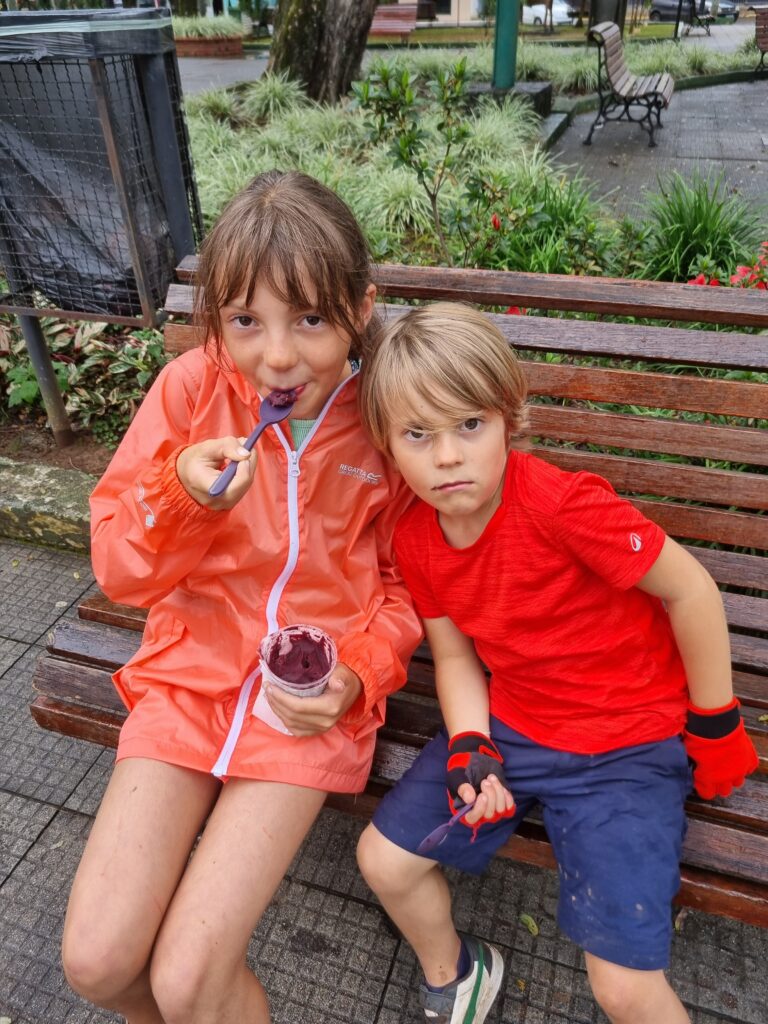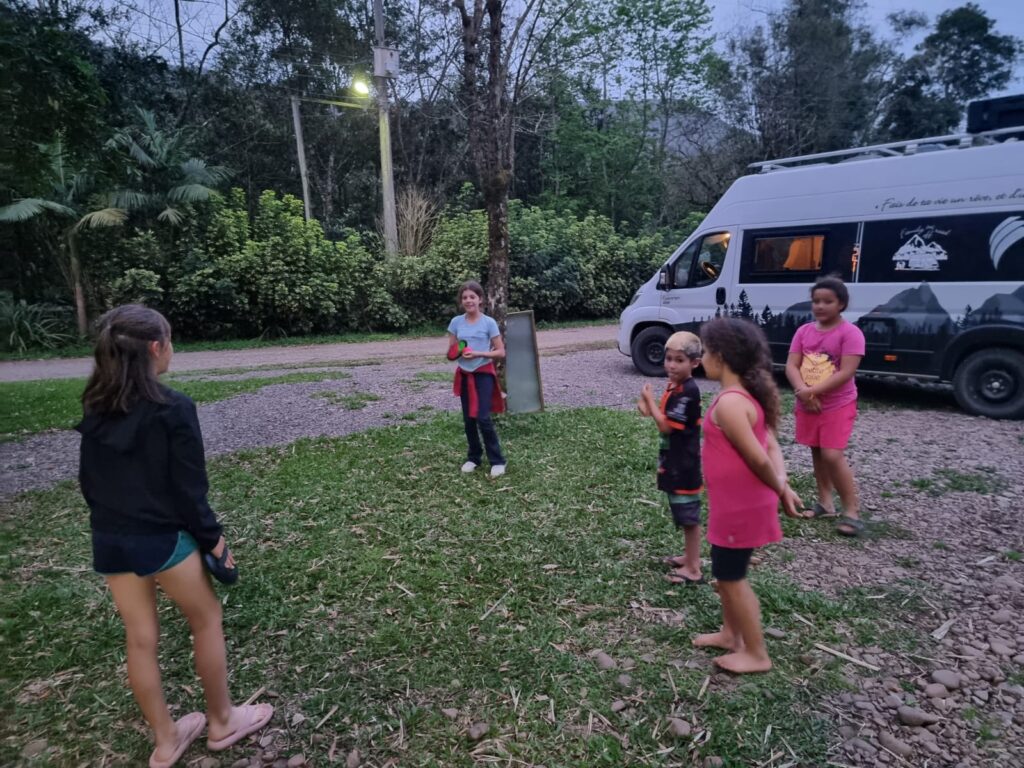 Cet après-midi là, nous partons à vélo à travers les pistes de Praia Grande pour découvrir la jolie petite ville, déguster un sorbet à l’Acaï tant attendu pour ma part et aller admirer la « Cascata Magia das Aguas ». Le soir, les enfants sont de nouveau au rendez-vous, accompagnés de leur maman qui vient comme chaque soir capter internet pour jouer sur la place avec son téléphone. Luna revient jouer avec Agathe accompagnée d’une amie. Les filles s’entendent bien et passent un bon moment. Gaspard, lui, pourtant d’habitude locace et extraverti, se terre dans le camion pour éviter les échanges avec son camarade de jeu de la veille. Je crois que la barrière de la langue est vraiment difficile pour lui.