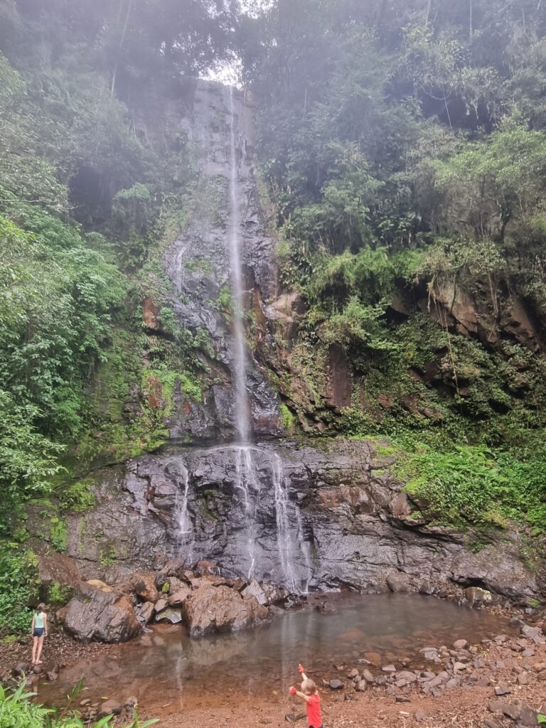Nous commençons la journée par un « café colonial » chez une famille de fermiers qui préparent le petit déjeuner traditionnel aux touristes. Un menu gargantuesque: gras de porc grillé, omelette, pains maison à de différentes farines (maïs, blé), gâteau à la banane, biscuits maison, pastéis au boeuf, gougères, confitures maison, mélasse de sucre de canne, jus de fruit maison, tisane et café maison… Nous repartons repus, prêts à affronter les 30 km de vélo à travers la jungle pour rejoindre les chutes!