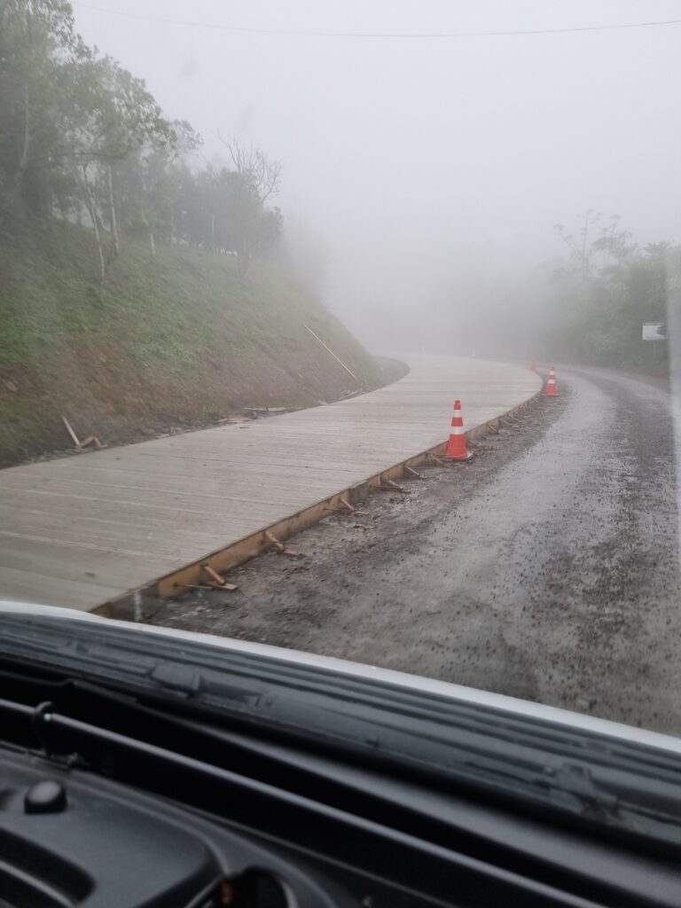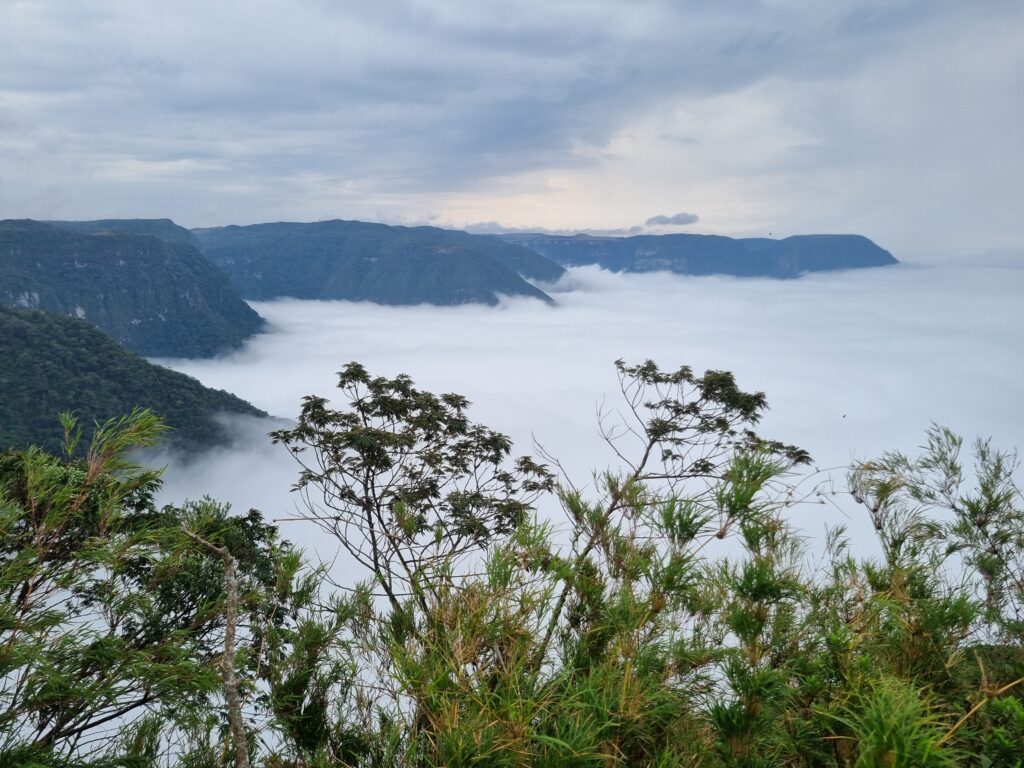 Le lendemain, le temps est pluvieux. Nous tentons de nous rendre sur les plateaux pour admirer la vue. Nous nous arrêtons sur deux miradors et pouvons observer le haut des canyons surplombant une magnifique mer de nuages. Un paysage cotonneux qui laisse vite place à un brouillard épais bouchant totalement la vue. C’est avec regrets que nous quittons la serra, la météo du lendemain ne sera pas plus clémente. Aussi, nous repartons vers la côte pour trouver un endroit où nous poser quelques jours en attendant la fin de la perturbation.