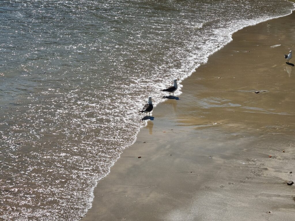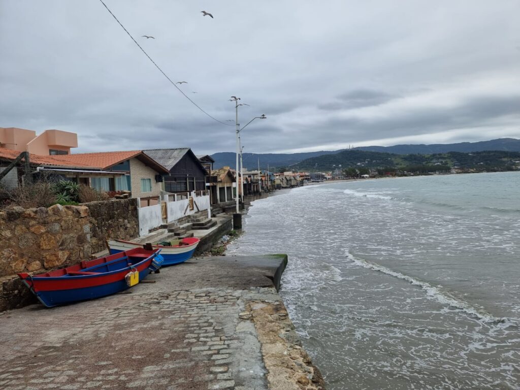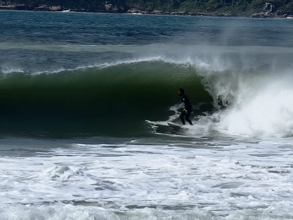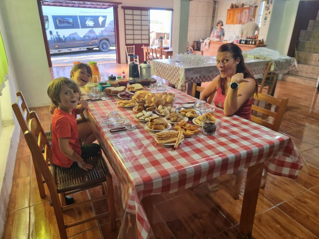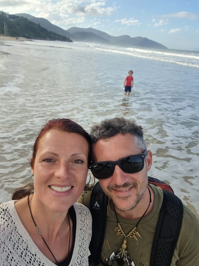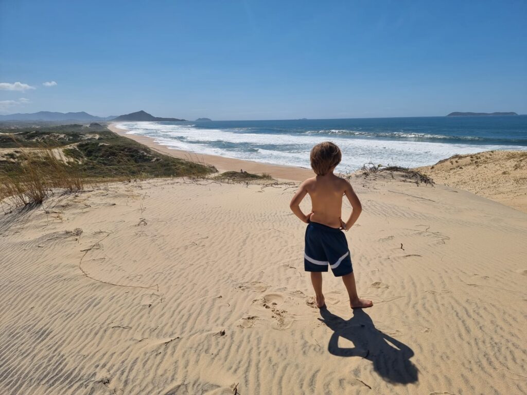 Nous ne parcourons que quelques kilomètres après Garopaba car la nuit tombe déjà. Nous nous arrêtons à Gamboa, petit village balnéaire, et nous stationnons juste en face de la plage, au fond d’une ruelle en terre. Ce qui ne devait être qu’une étape d’une nuit s’est finalement transformée en un de nos endroits préférés. Nous y passerons deux nuits et deux jours entiers à contempler et écouter l’océan et ses puissants rouleaux, à observer les mamans et bébés baleines sauter en continu du matin au soir tout près de la plage et à profiter en famille de l’ambiance très cool du front de mer (et du restaurant excellent!!!). Peu de choses à dire, ce furent deux jours pendant lesquels le temps a filé, discrètement, sans se faire remarquer. Nous étions juste là, à vivre ces moments de plénitude comme si plus rien n’avait d’importance sauf ce que la nature offrait à nos sens. Comment nommer cet espace-temps dans lequel nous pourrions rester pour l’éternité si ce n’est « paradis »?
