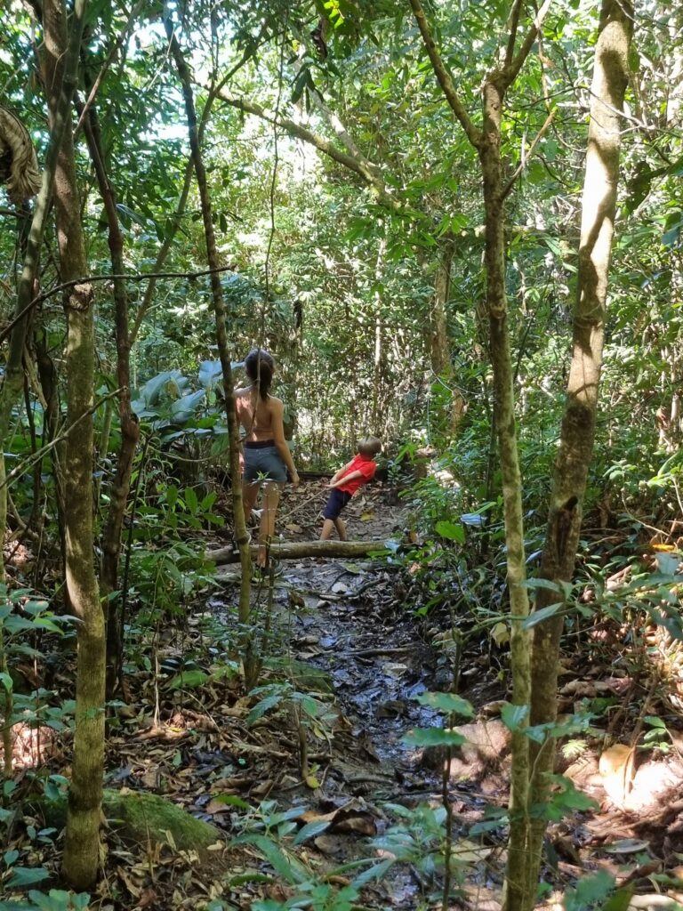 Nous repartons par la piste à vélo, sauf Gaspard qui déclare forfait pour les 15km retour (principalement en montée) et préfère faire une sieste dans le 4×4. Il sera rejoint quelques km plus loin par Agathe qui aura bien pédalé mais les grandes côtes et la chaleur humide auront eu raison de son courage! Finalement, assez pratique le driver au 4×4!!! Le gars de l’accueil nous dira par la suite que jusqu’à aujourd’hui, une seule personne avait fait l’aller-retour à vélo…nous serons donc les deuxièmes!