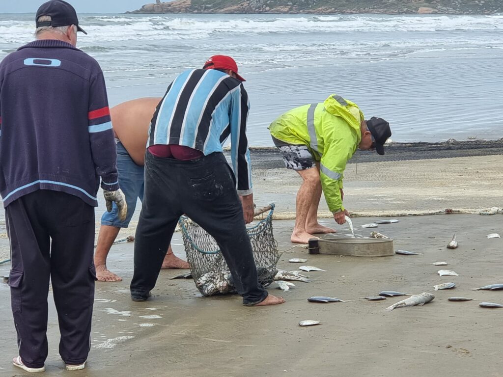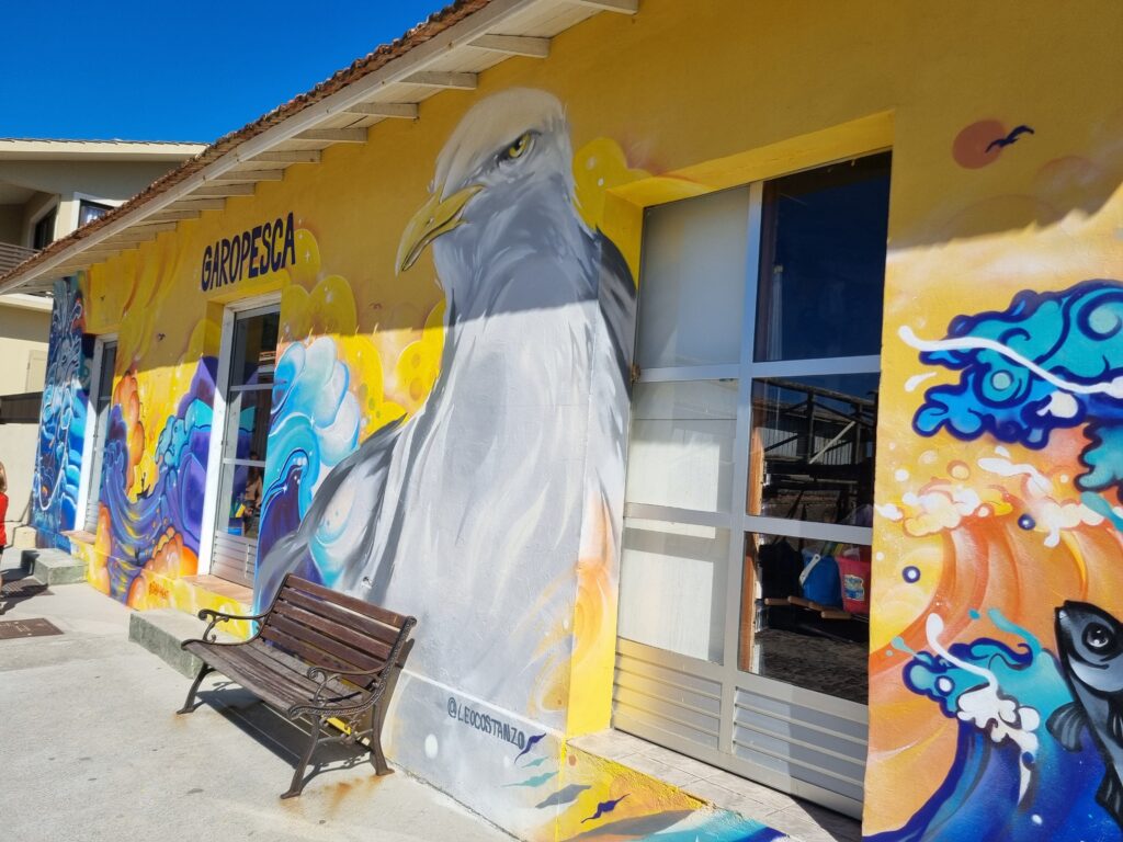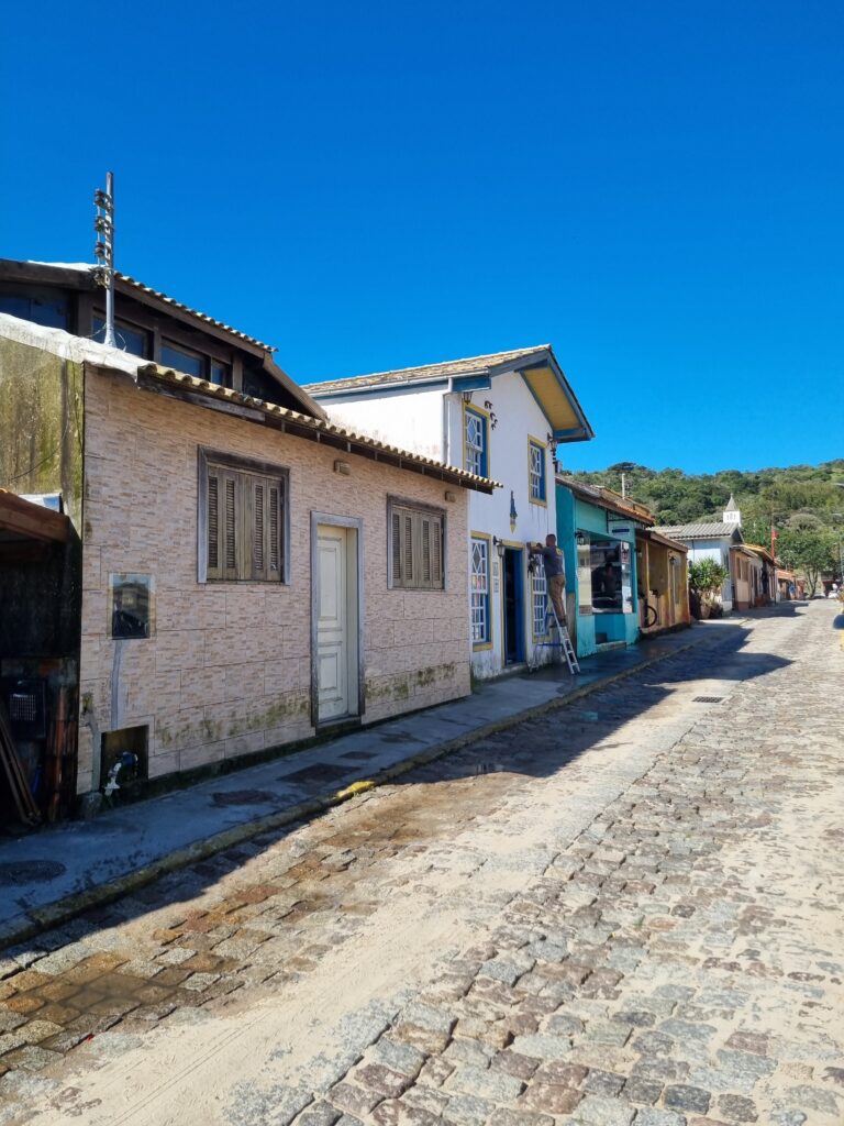 Nous arrivons à Garopaba en fin de journée. Nous faisons un petit tour à pied dans ce village de pêcheurs qui s’est peu à peu transformé en station balnéaire très européanisée, où le surf règne en maître: magasins de vêtements de marques, boutiques de surfs, bars et restaurants… On imagine bien, en plein été, les trottoirs grouillant de touristes et les terrasses animées, où s’installent familles et surfeurs pour siroter un cocktail ou se rafraîchir avec un sorbet à l’Acaï. Nous aimons tout de suite le centre historique. Il est composé d’une rue pavée parallèle à la plage, bordée de maisons colorées et de boutiques d’art, au bout de laquelle se trouve une jolie place pavée également. Ici, les pêcheurs débarquent leur prise du jour et découpe des filets de poisson qu’ils vendent directement sur place. Lorsque nous arrivons, un pêcheur est justement en train de mettre des filets en sachets. Je lui en achète 1kg pour quelques reals seulement.