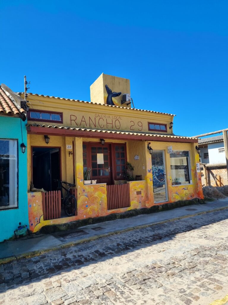 Juste à côté se trouve la plus ancienne maison de Garopaba, une bâtisse coloniale recouverte d’un enduit bleu ciel réalisé avec de la graisse de baleine. En effet, jusque dans les années 90 (moratoire international en 1986), la chasse à la baleine était non seulement autorisée, mais représentait l’activité principale du secteur. Elles étaient chassées pour leur graisse qu’on transformait en huile de grande valeur et qu’on utilisait, entre autre, comme lubrifiant pour les machines et le cuir, comme combustible pour l’éclairage et la cuisine, comme savon et cosmétique ainsi que dans la construction pour les peintures et vernis. Garopaba a su transformer son activité économique et utilise aujourd’hui les baleines comme un attrait touristique pendant la saison creuse. Elles sont aujourd’hui très protégées par les locaux qui n’hésitent pas à appeler la police militaire s’ils aperçoivent un engin à moteur s’en approcher.