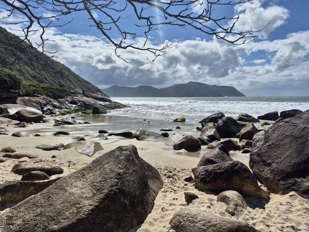 Nous quittons Gamboa, même si nous aurions aimé rester un peu plus. Mon téléphone ne fonctionne plus depuis notre aventure en canoë et je dois trouver une réparateur à Florianopolis en espérant pouvoir le remettre en état, sinon en changer. Après un bout d’après-midi dans un mall de Florianopolis, nous avons hâte de quitter la ville et de retrouver un endroit paisible pour profiter des derniers jours sur la côte. En effet, Florianopolis, capitale de l’état de Santa Catarina, est une grande ville moderne à la circulation importante, et où la consommation semble être le credo à en juger par le nombre important de centres commerciaux clinquants neufs accueillant toutes les plus grandes enseignes internationales… C’est comme si, d’un seul coup, on nous sortait d’un très beau rêve pour nous ramener à tout ce que l’on déteste. Malgré tout, c’est un passage obligé à la fois géographiquement pour atteindre le sud de l’Île de Santa Catarina et également pour trouver un téléphone. Nous nous rendons donc dans un de ces centres commerciaux au sol brillant, achetons rapidement un téléphone, faisons quelques courses et mangeons un burger au hardrock café (bah oui…quitte à y être autant y aller à fond!!!) puis repartons fissa loin de ce tumulte. Nous choisissons la plage la plus éloignée de toute forme d’urbanisation et nous installons au bout de la plage de Pantana do Sul où nous resterons 3 jours.