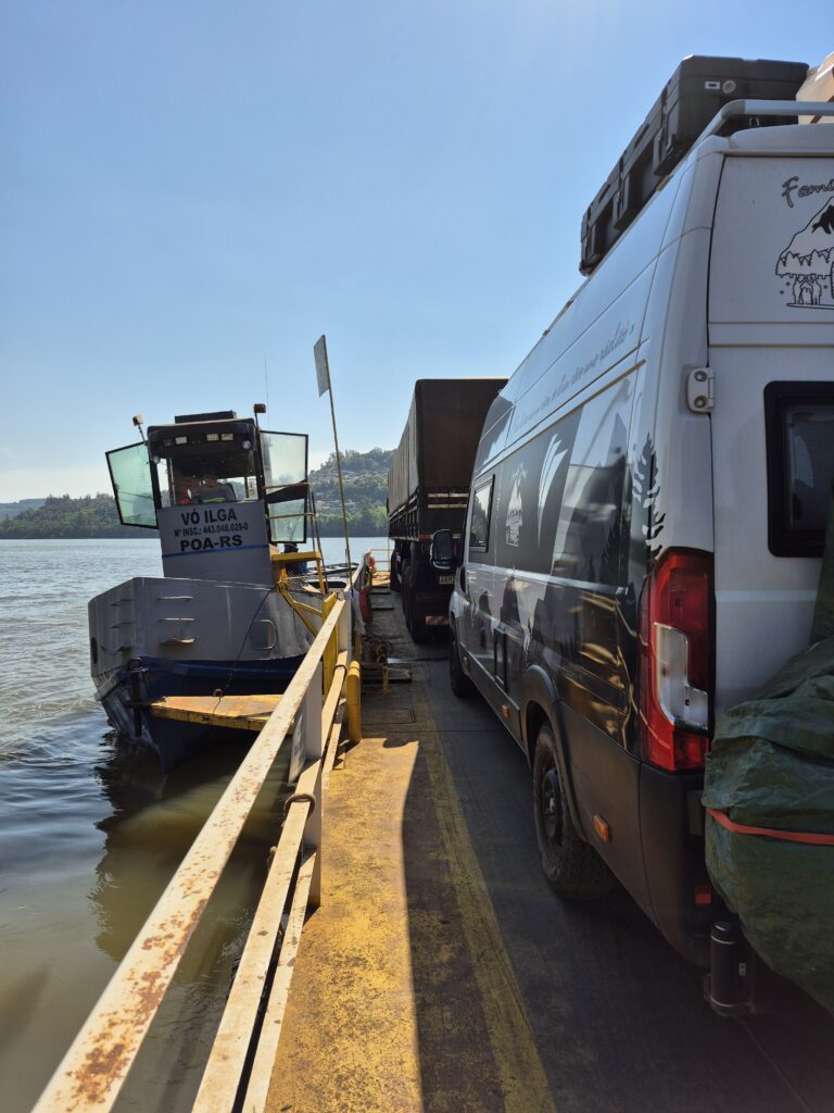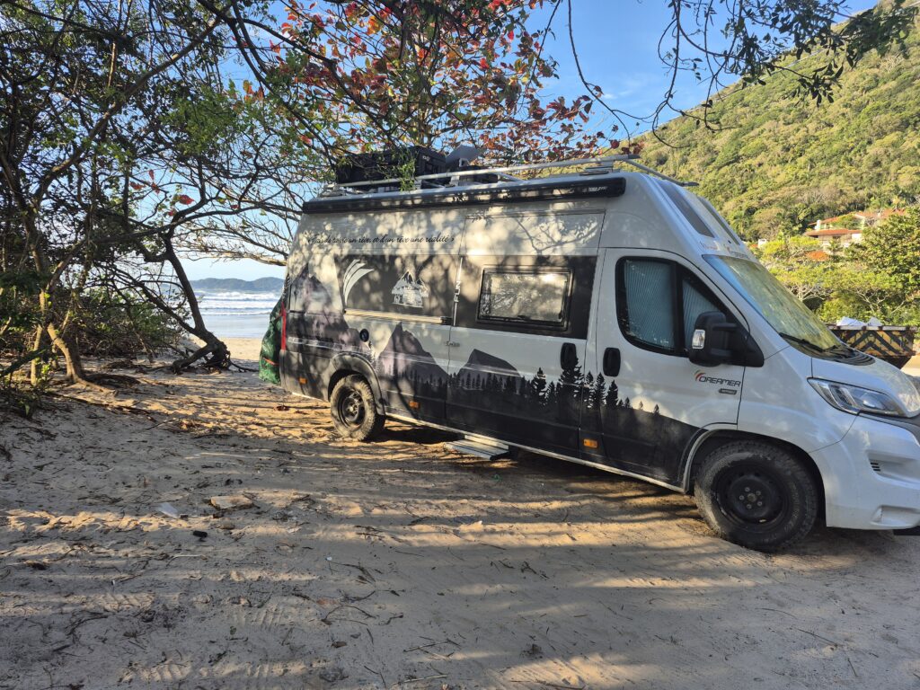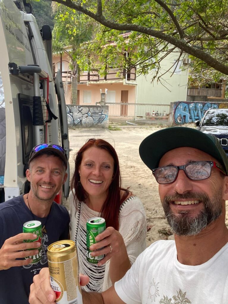 Le lendemain matin, nous décollons en même tems que Fabio pour aller dans sa cabane de pêche proche de Florianopolis. L’objectif est d’aller chercher une lyre et un adaptateur pour remplir notre bouteille de gaz argentine avec sa bouteille brésilienne. Nous pensions pouvoir tenir largement jusqu’en Argentine avec notre bouteille mais nous avons constamment cuisiné dans le camion et épuisé notre réserve. Malheureusement, Fabio n’a pas le bon adaptateur. Il nous fait tout de même cadeau de la lyre et nous conseille d’aller dans un magasin qui pourra nous dépanner. En attendant, il nous fait visiter la petite bicoque familiale qui appartient à son grand-père, où est abrité un bâteau de pêche. Il y a une petite cuisine, une salle des sanitaires…de quoi faire de belles fêtes de famille au bord de l’eau. Il aurait aimé nous emmener en bateau et passer une soirée ici avec nous mais nous devons quitter la côte aujourd’hui. Nous nous promettons de revenir plus longtemps la prochaine fois et de profiter davantage ensemble. Fabio fut une des plus belles rencontres depuis le début du voyage…