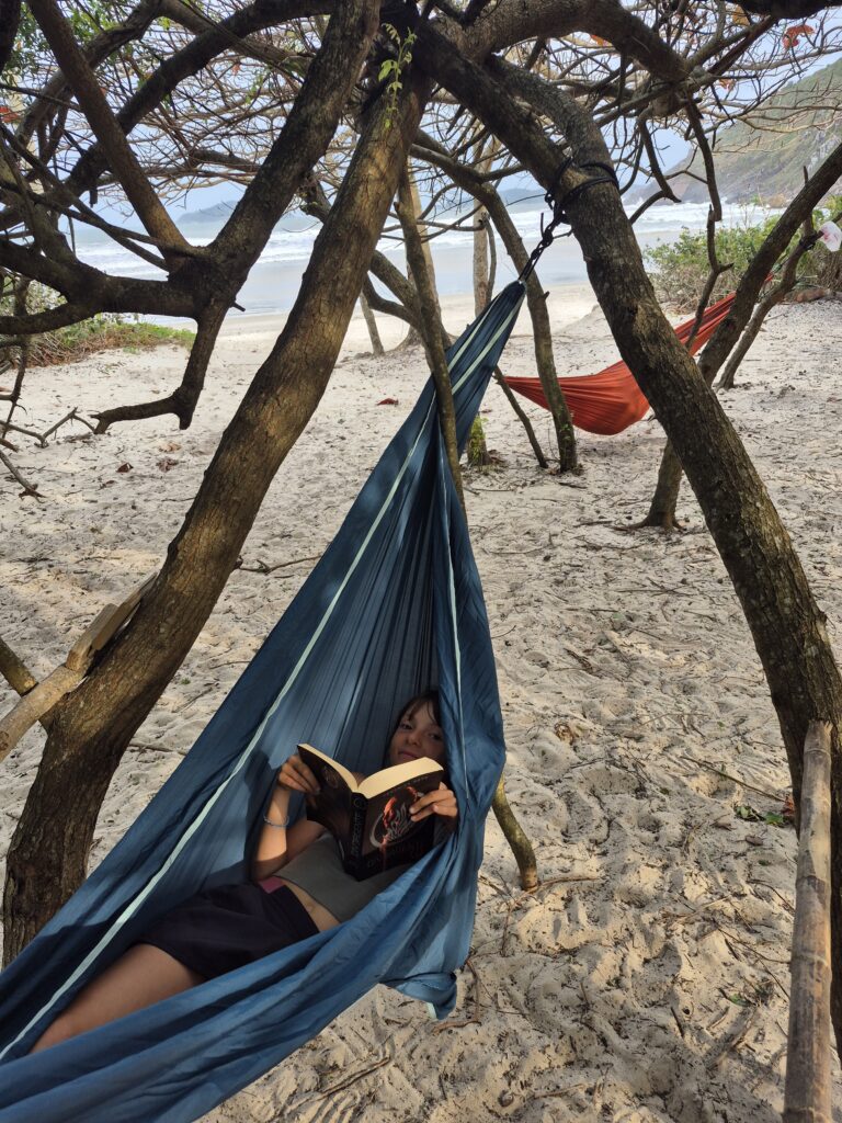 Là encore, les paysages sont magnifiques. De petites montagnes coniques couvertes de végétation se jettent dans un océan bleu, vert et turquoise. L’Île est le paradis des surfeurs qui ont l’embarras du choix pour trouver le spot idéal en fonction du vent et des courants. Le lendemain, nous parcourons 16 km pour explorer l’extrême sud de l’île. La randonnée est technique et difficile : 900m de dénivelés sur 16km avec des passages rocheux, des sentiers escarpés. Le chemin débouche une la Praia dos Naufragados, une magnifique anse accessible uniquement à pieds qui a vu s’échouer de nombreux bateaux en raison des courants forts et parfois contraires qui fracassent à coup sûr contre les rochers quiconque n’est pas d’ici. Les enfants ont encore une fois été de super marcheurs et ont beaucoup apprécié la journée. Seule embûche sur le chemin, un taureau pas très amical, qui, sous prétexte de vouloir protéger sa dulcinée, m’a bien malmenée… Même si j’utilise le ton de la rigolade aujourd’hui, je peux vous assurer que je ne crânais pas, j’ai vraiment cru qu’il allait m’encorner! On a une nouvelle fois eu de la chance sur ce coup (merci à notre bonne étoile ou à vos bonnes ondes!). Au retour, nous avons dégusté un smoothie acaï-banane dans le petit bar de plage à côté du camion, sur fond de reggae et, profitant de la douceur de la soirée, nous avons installé un apéro-dinatoire sur la plage et sorti la guitare pour chanter ensemble. Le lendemain, nous avons rencontré Fabio, un surfeur natif de l’île qui vit dans son van aménagé la plupart du temps. Nous avons commencé à discuter (un peu difficilement au début) puis, de fil en aiguille, nous nous sommes retrouvés tous les trois installés dans nos fauteuils à boire une bière en discutant de tout et de rien dans une langue hybride de portugnol-ingles!!! La journée a filé ainsi, les enfants lisant dans les hamacs ou jouant dans le sable et nous, parlant politique et société avec Fabio. Il faut dire que la langue hybride est très belle mais elle demande trois fois plus de temps pour exprimer quelque chose parce qu’il faut souvent répéter deux fois, mimer, détourner…on se croirait dans « Times’up »! Je propose à Fabio de partager le repas avec nous. Nous partageons une cachaça que je prépare avec celle que nous avons achetée à Garopaba et il sort une bouteille de vin rouge (qu’il avait mise au frigo)!Ma cachaça française et son vin à la brésilienne ne sont pas très conventionnels mais sont à l’image de ce moment d’échange et de connexion. Nous terminons la soirée dans le camion car la pluie a fait son retour.