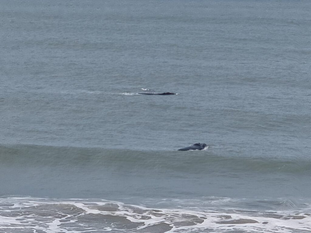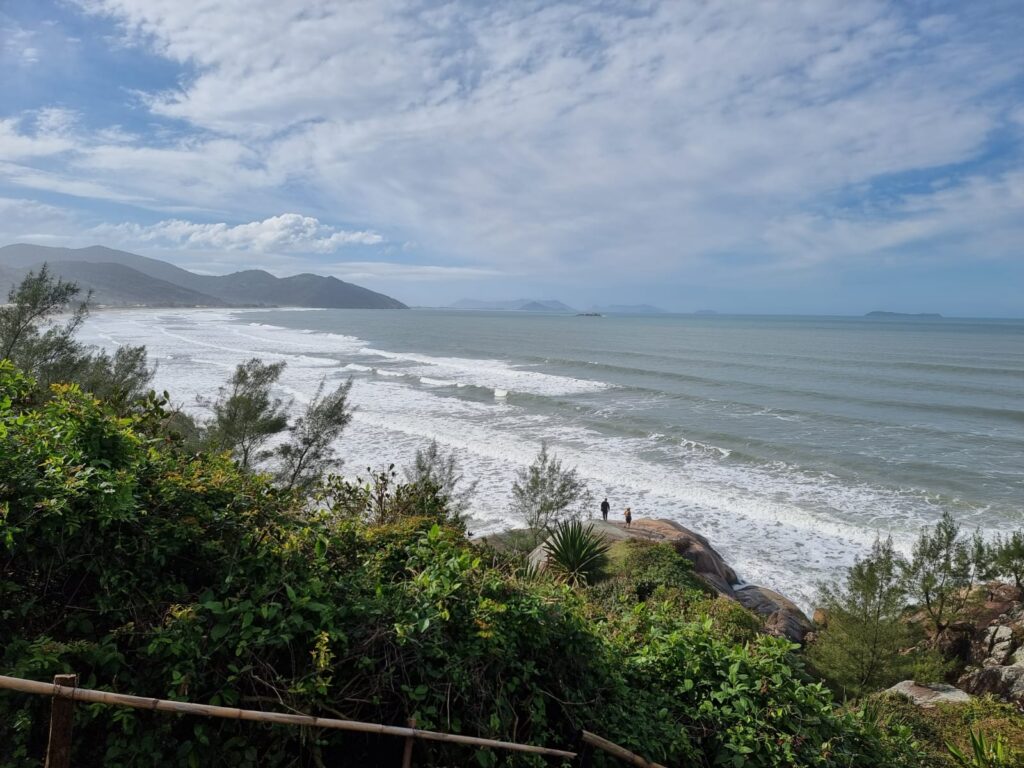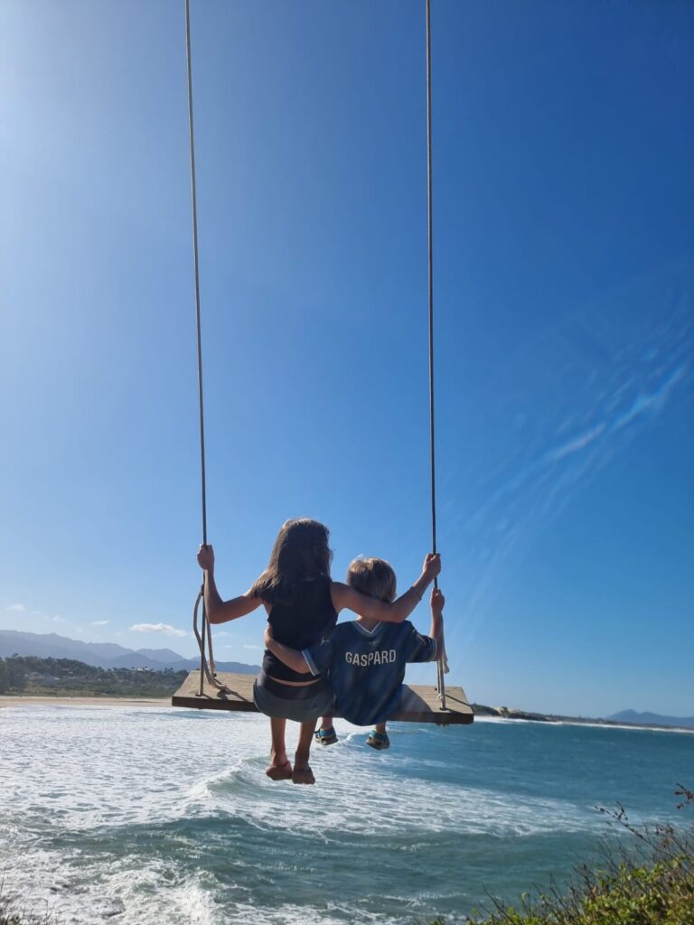 Le lendemain, un soleil radieux réchauffe le camion. Les enfants travaillent toute la matinée et profitent de l’immense balançoire en guise de récréation. Ils commencent à vraiment apprécier cette école nomade qui offre chaque jour une nouvelle cour de récré! L’après-midi, nous partons explorer les alentours. Au détour d’une balade, nous découvrons un sentier qui nous mène vers une pointe surélevée entre la dune de Siriu et la plage de Garopaba qui sert de Mirador pour observer les baleines franches australes qui viennent chaque année entre juin et octobre dans cette baie aux eaux chaudes et peu profondes pour donner naissance à leurs petits et les éduquer avant de se lancer dans l’océan. Voilà près d’une semaine que nous essayons d’en apercevoir sans succès et là, sans l’avoir cherché, nous observons plusieurs baleines. Nous sommes comme des enfants, émerveillés devant ce spectacle hypnotisant. Nous restons assis à les observer pendant un bon moment, le temps passe sans que l’on s’en rende compte. L’après-midi est déjà bien avancé, nous partons faire quelques courses en passant par la plage pour le plus grand bonheur des enfants qui jouent (d’un peu trop près) avec les vagues. Une journée de farniente, de plage et de soleil…cela faisait longtemps qu’on en rêvait!!!