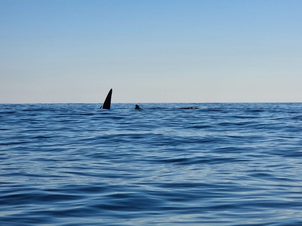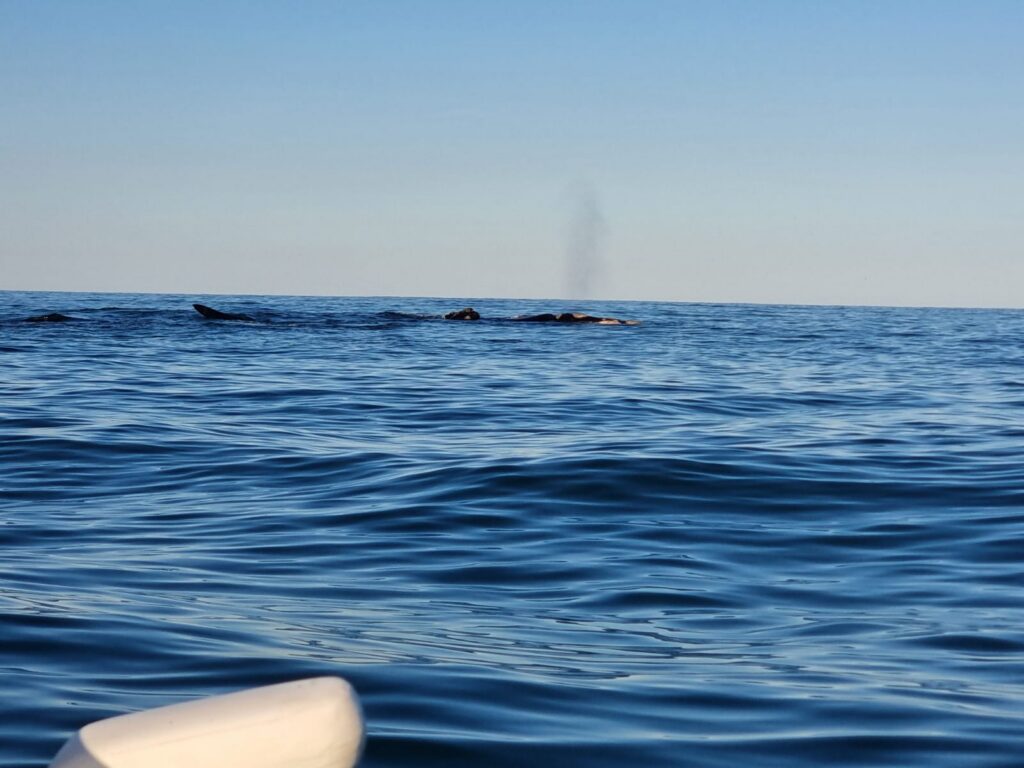 Nous ramons en direction de la plage de Siriu et apercevons très vite des baleineaux en train de s’exercer à sauter. Il y en a plusieurs, de tous les côtés, c’est magnifique! Luiz frappe de temps à autre sur son canoë pour signaler notre présence aux baleines. Elles nagent paisiblement, leur dos scintillant au dessus de l’eau, et se retournent de temps à autre en nous saluant de leurs fines nageoires. Parfois, elles se déplacent en ondulant, nous permettant d’apercevoir leur immense queue. Elles évoluent gracieusement dans l’océan comme si elles dansaient, sans ce préoccuper de nous. Elles nous font même le cadeau de nous laisser entendre leur chant à plusieurs reprises. Nous observons ce ballet fantastique pendant plus d’une heure, mesurant la chance que l’on a de pouvoir profiter d’un tel spectacle. Même Ninon et Luiz, qui pourtant sont habitués, sont subjugués. Nous revenons petit à petit vers la plage de Garopaba. Les baleines sont très nombreuses et proches de la plage. Luiz dirige l’embarcation de sorte à ne pas nous approcher trop près d’elles. Le rivage n’étant plus très loin, nous commençons à ressentir quelques vagues se former juste devant le canoë pour se casser quelques mètres plus loin en de gros rouleaux appréciés par les surfeurs. Ceux-ci se régalent, ils domptent les vagues au coucher du soleil en observant les baleines de près…quel spot magnifique!